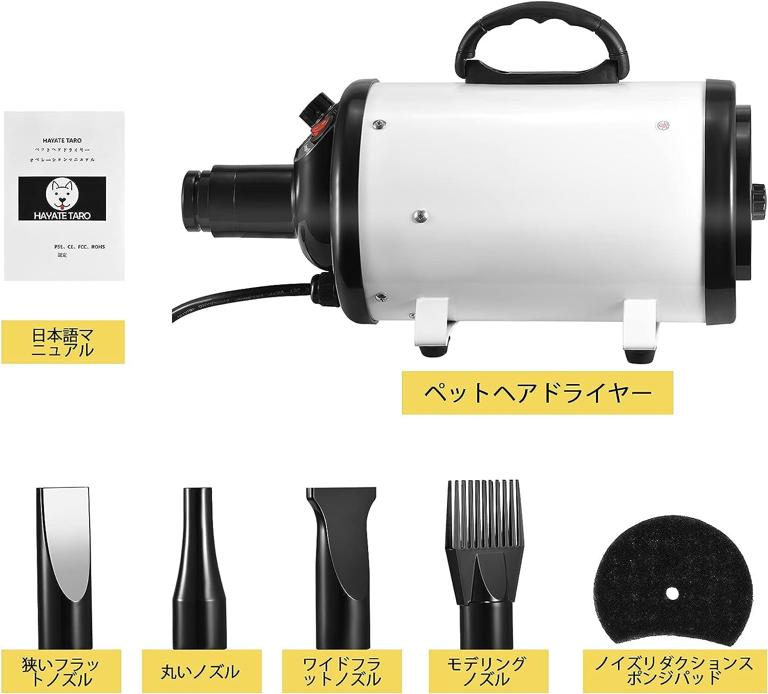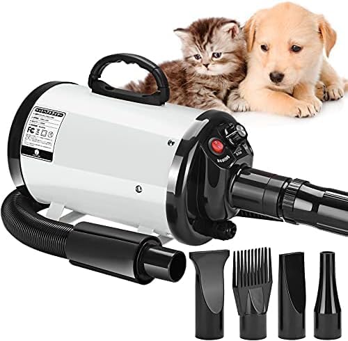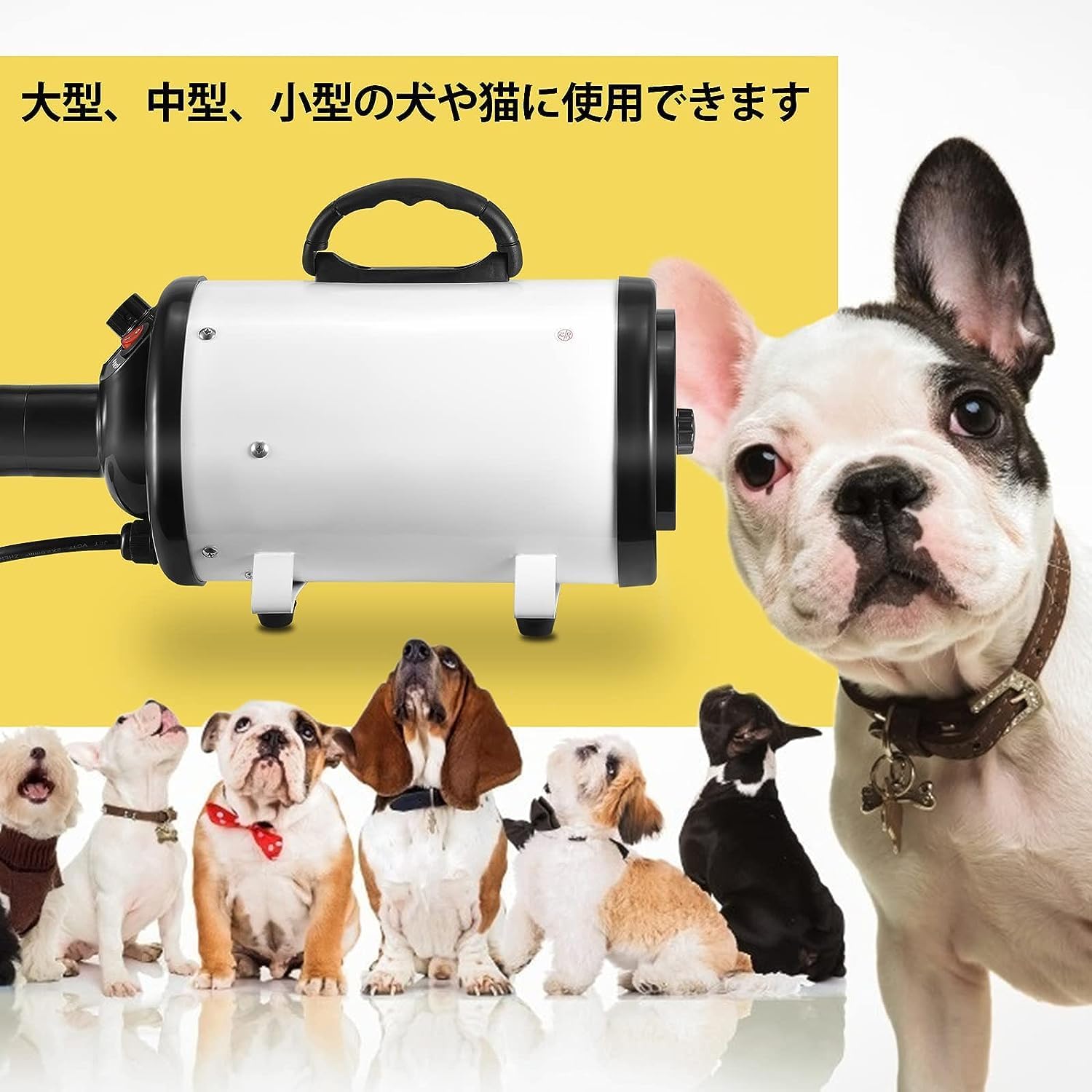 ペットドライヤー ペットヘアードライヤー ペットブロワ 無段階風速制御 30-55℃温度可調整 ノズル4種付き 100v/700-1500w 日本語説明書 犬/猫兼用 ホワイト