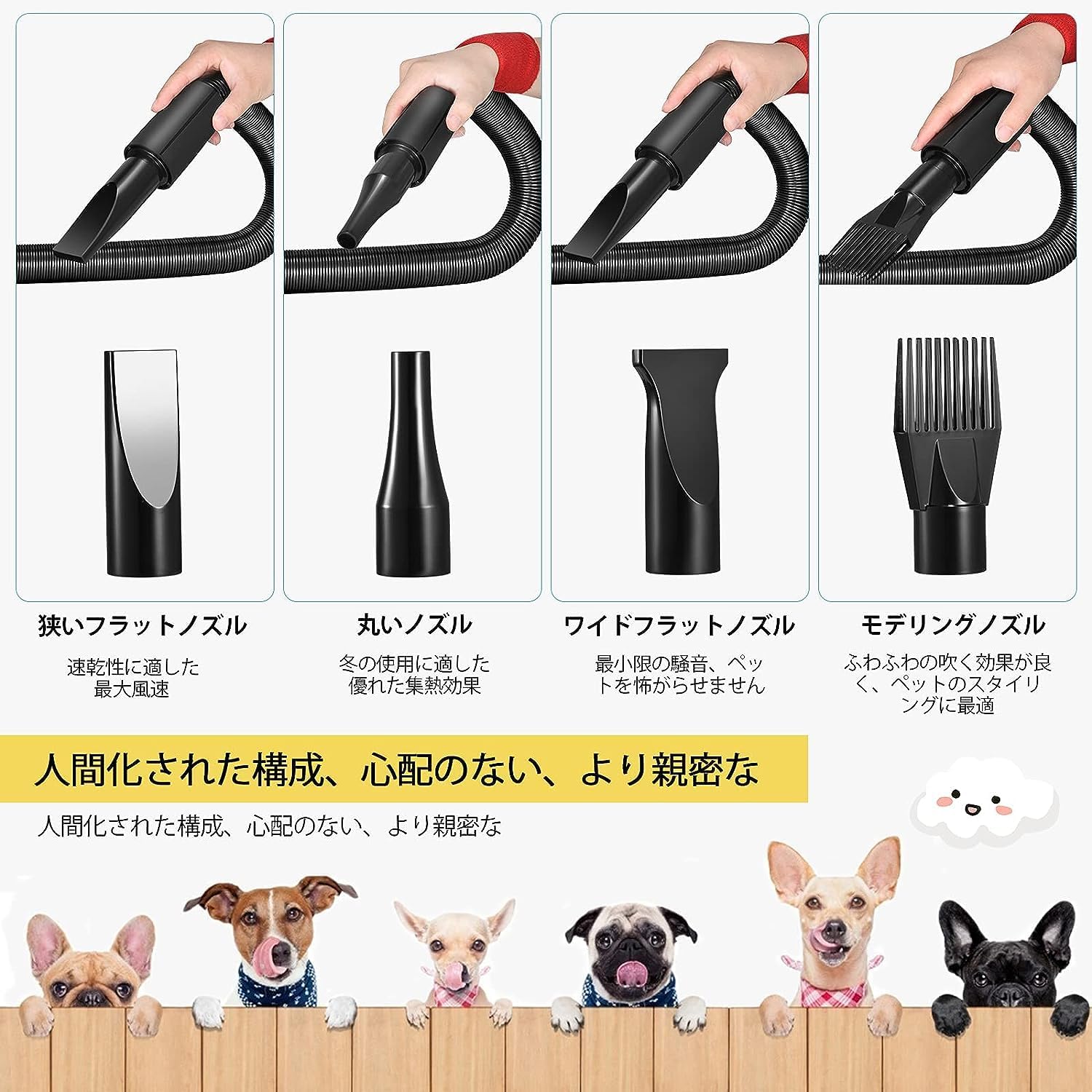 - 【ノズル4種・自由スタイルにDIY】4つのノズルを備えており、ペットを乾燥させるだけでなく、ヘアーデザインもできます。幅の広いフラットパイプの騒音を最小にし、偏平噴管の風速が最も速く、円噴管の温度が最も高い、定型ノズルは造型のために使えます。