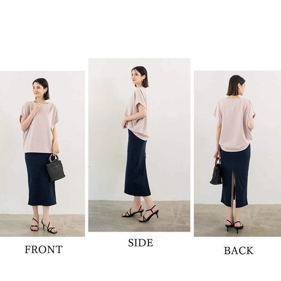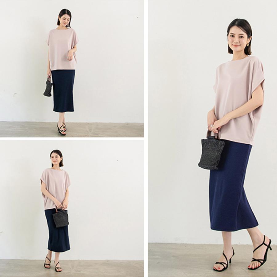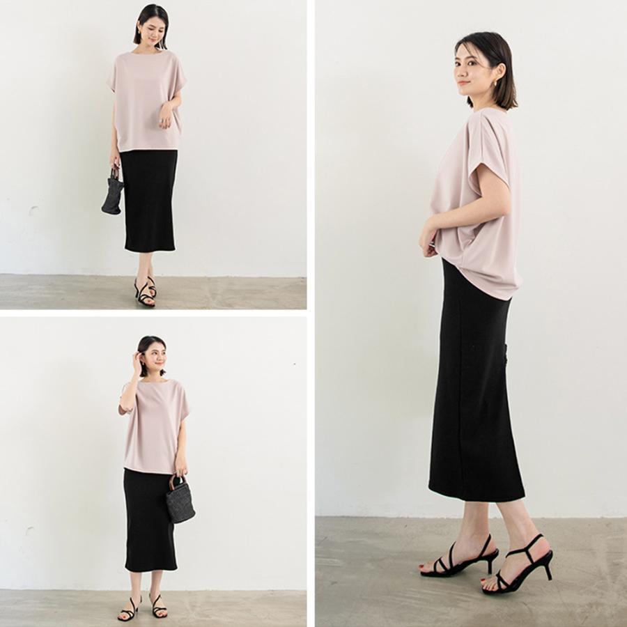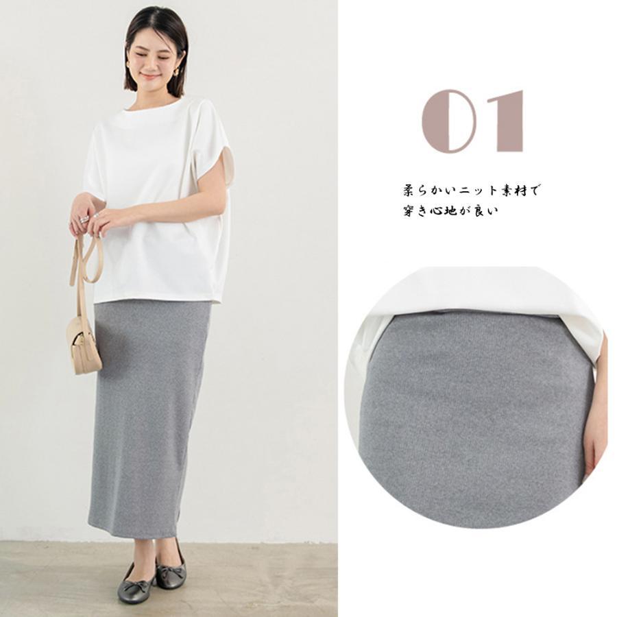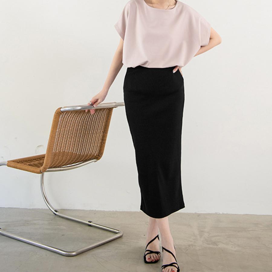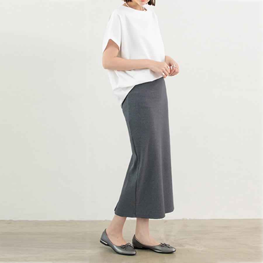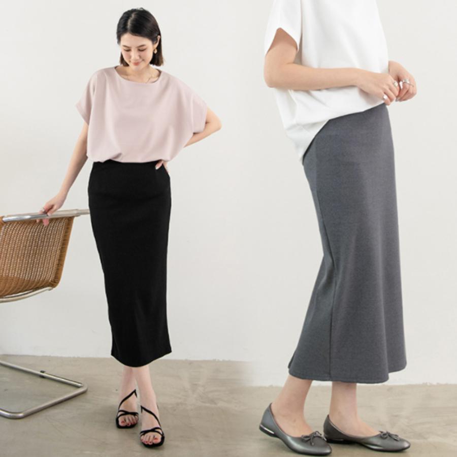 身体のラインを拾いすぎないセミタイトが女性らしい着こなしを演出するリブニットスカート