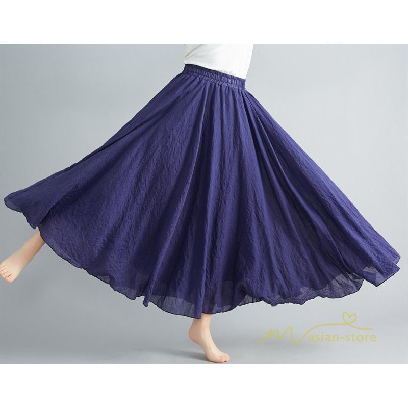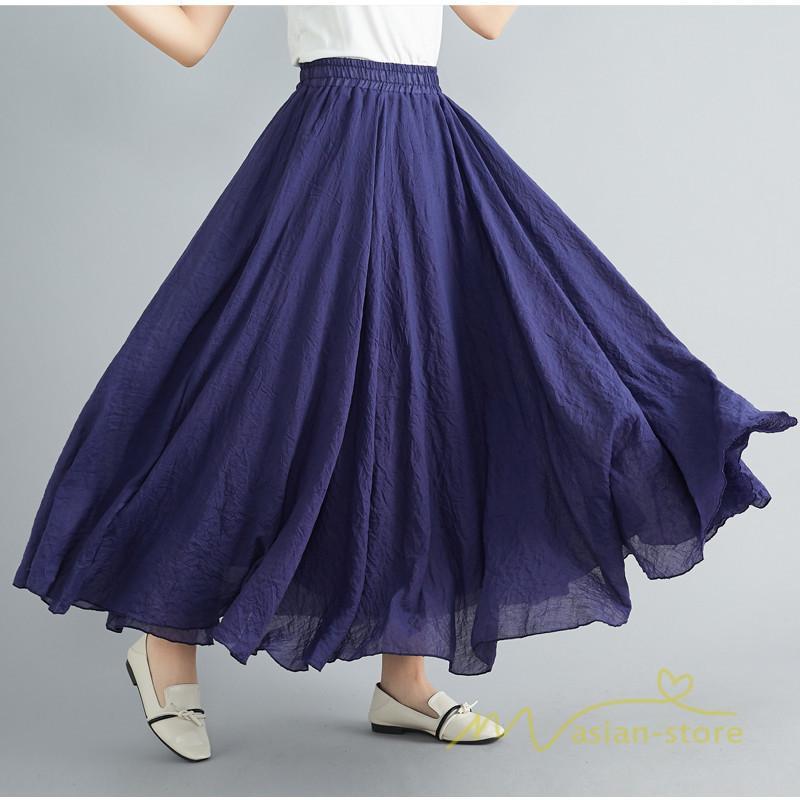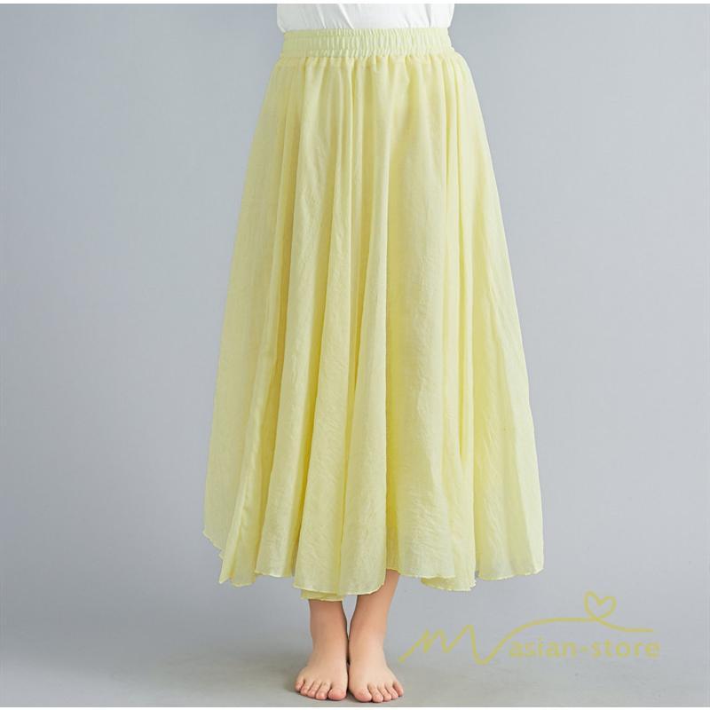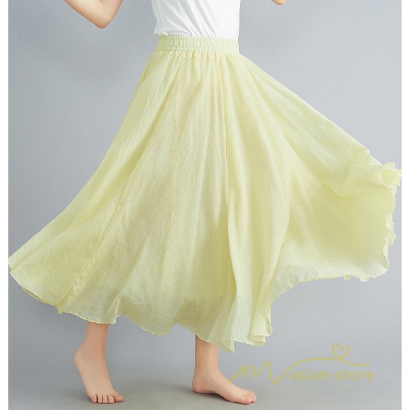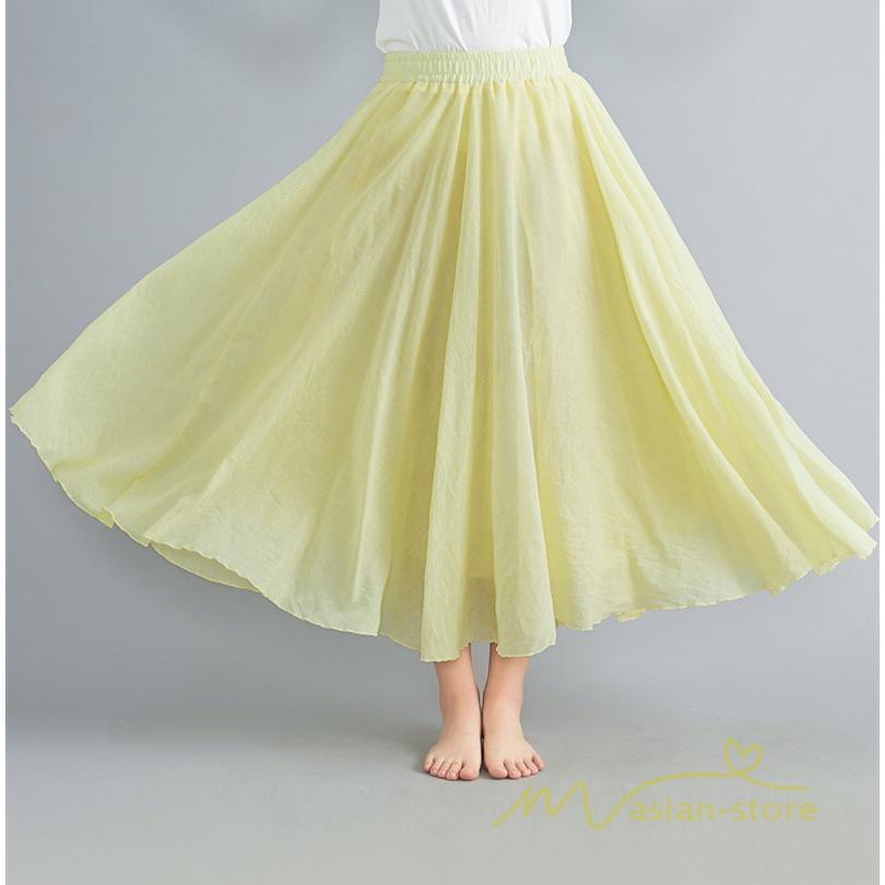 スカート | ロング綿麻フレアウエストゴム ハイウエスト 85cm ネイビー イエロー 無地 夏物 可愛い 春服