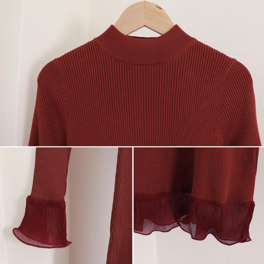 大人可愛い リブニット ワンピース プチハイネック きれいめ ワンピ フレアスリーブ オフィスカジュアル タイトワンピ黒