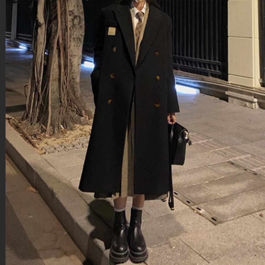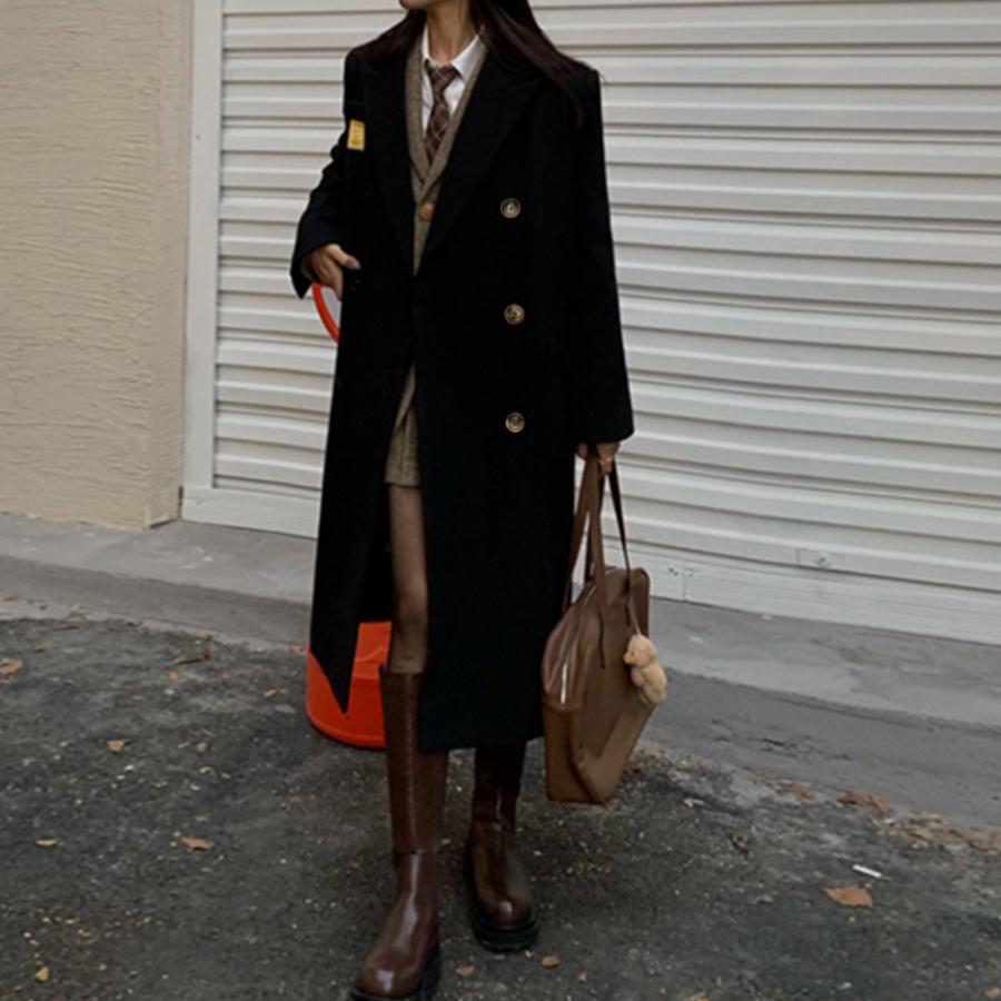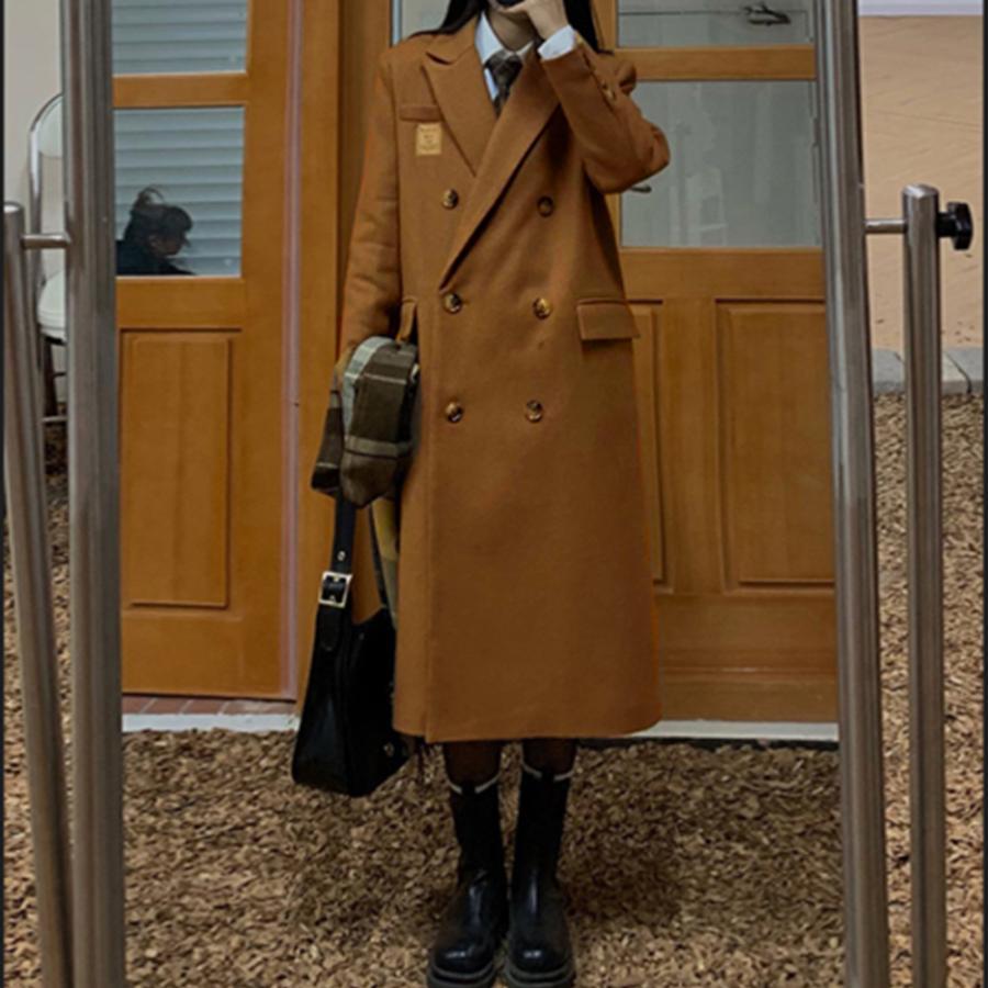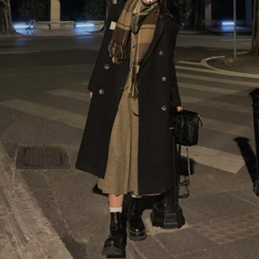 大きめの襟とダブルボタンのデザインがクラシカルな雰囲気を醸し出すオーバーサイズチェスターコートの