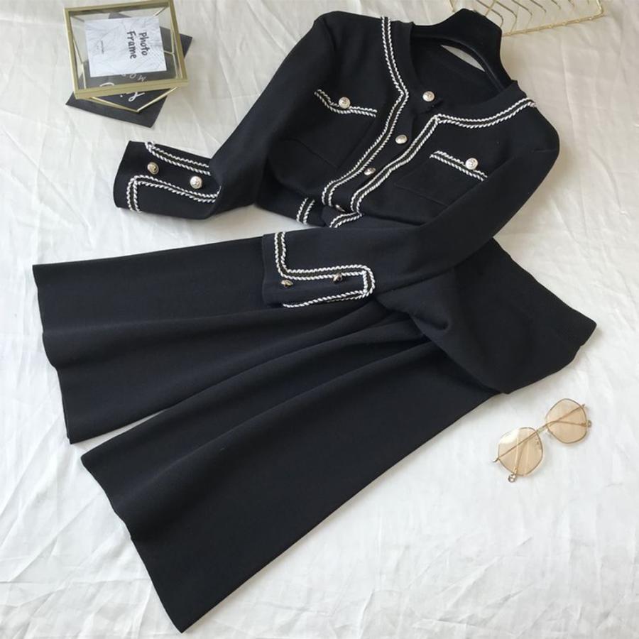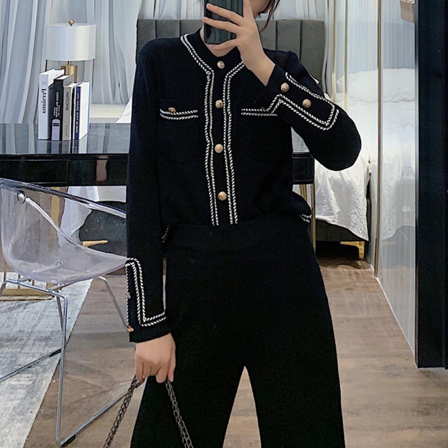 モノトーンの配色ステッチがトレンド感抜群、レトロな雰囲気に導くニット生地セットアップ