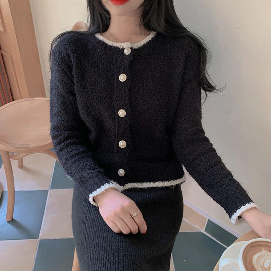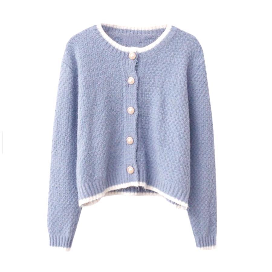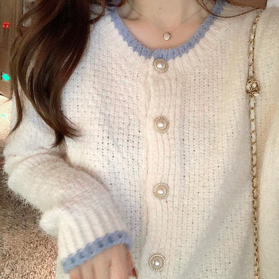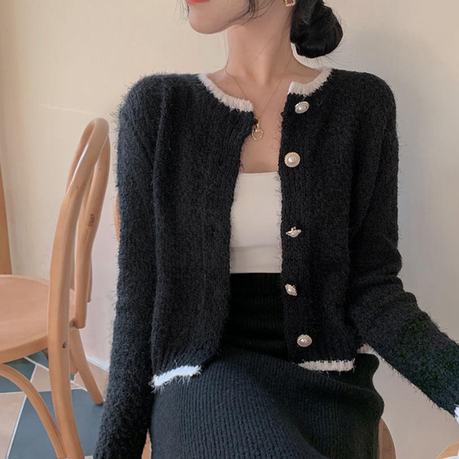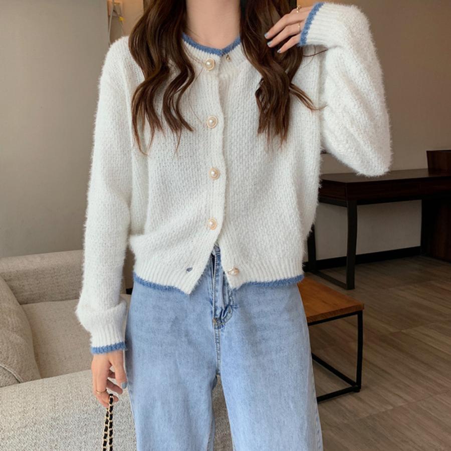 袖口や裾などのハイカラーデザインがアクセントのニットカーディガン