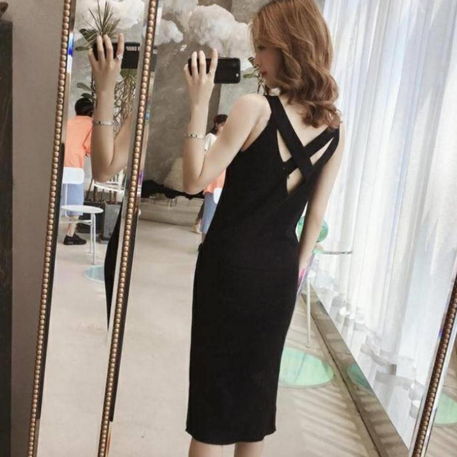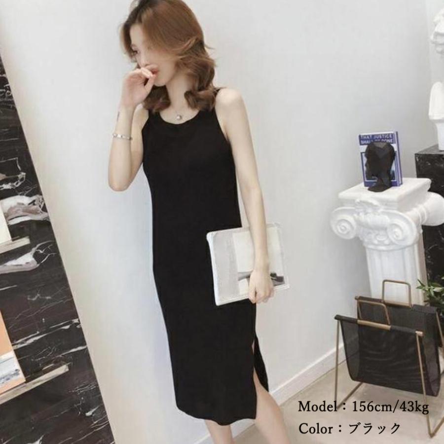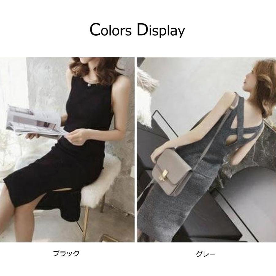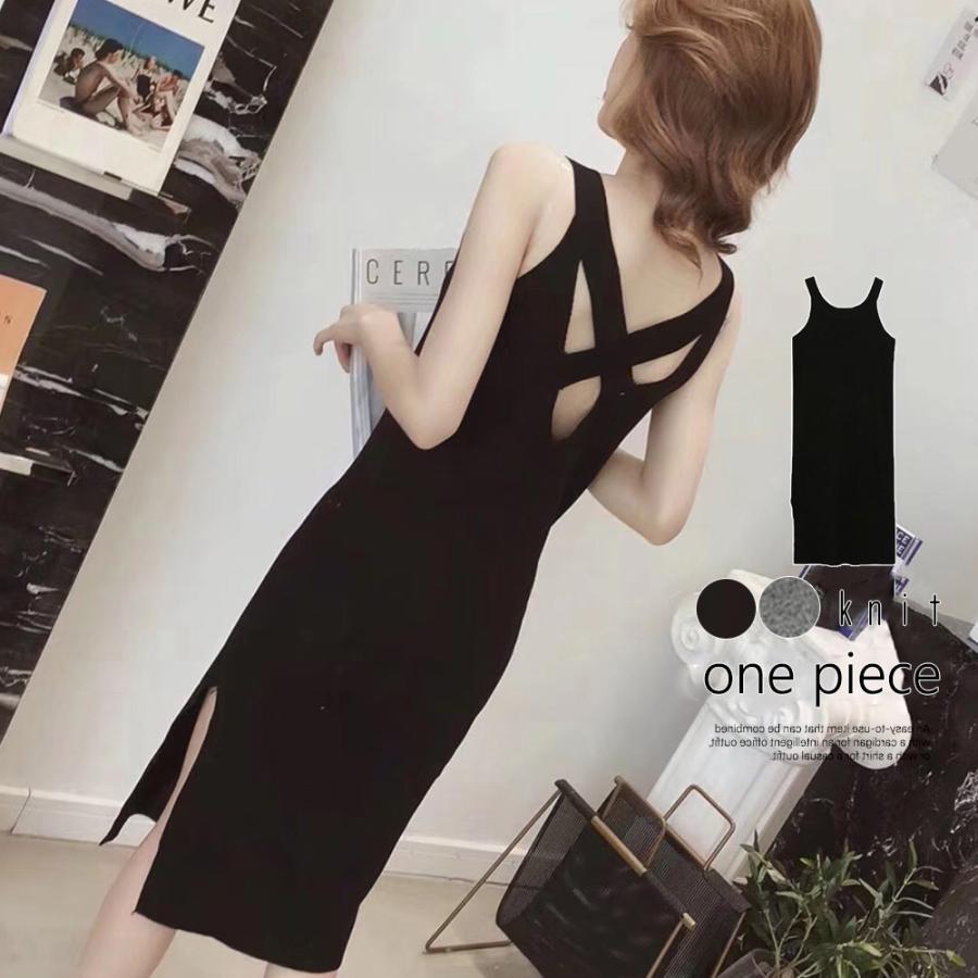 ワンピース | スリット レディース タイト膝下丈 ロングワンピ 着やせ バッククロス おしゃれ ニットノースリーブ