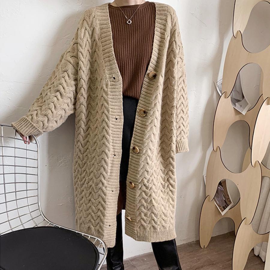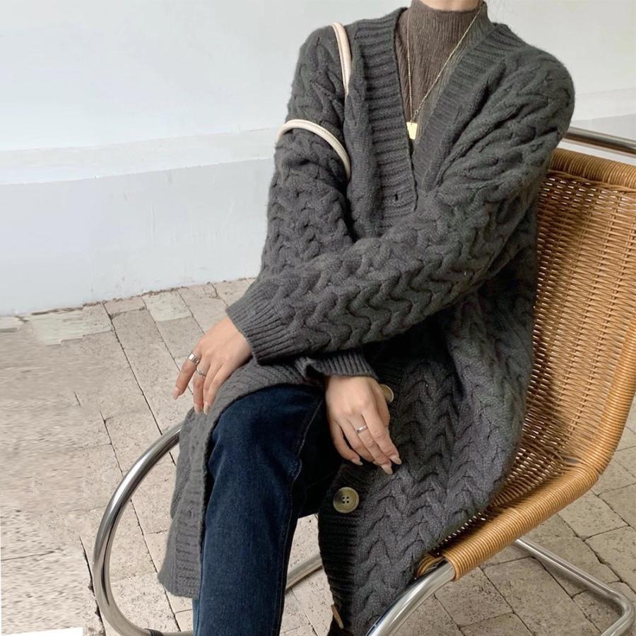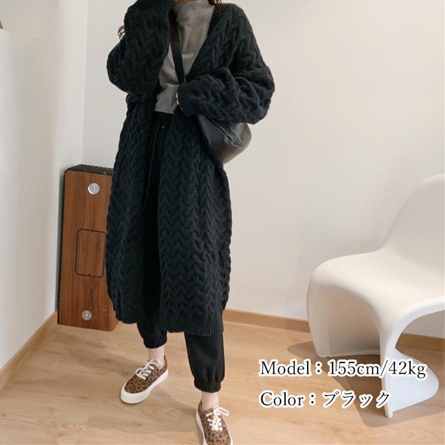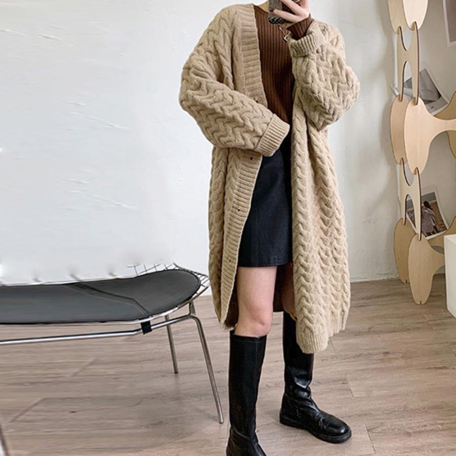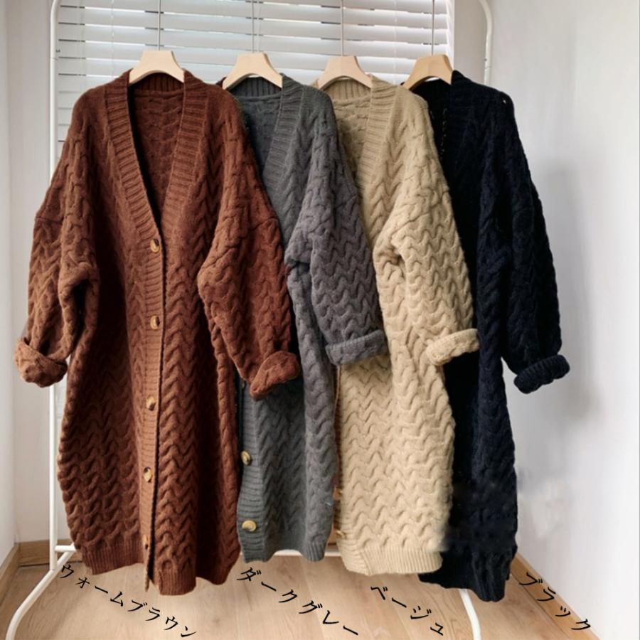秋冬のワードローブに欠かせない立体的な大柄のケーブル編みロングニットカーディガン