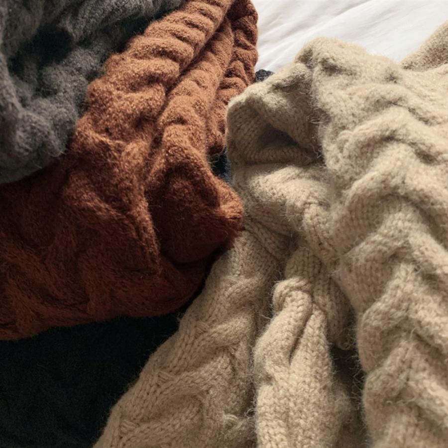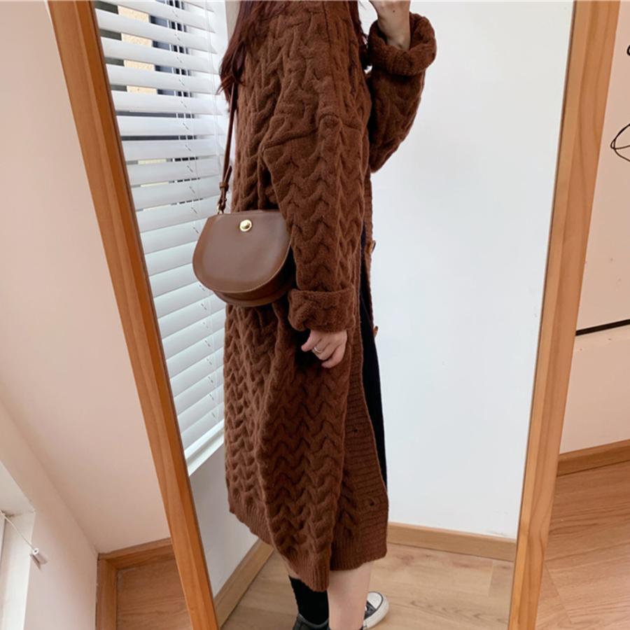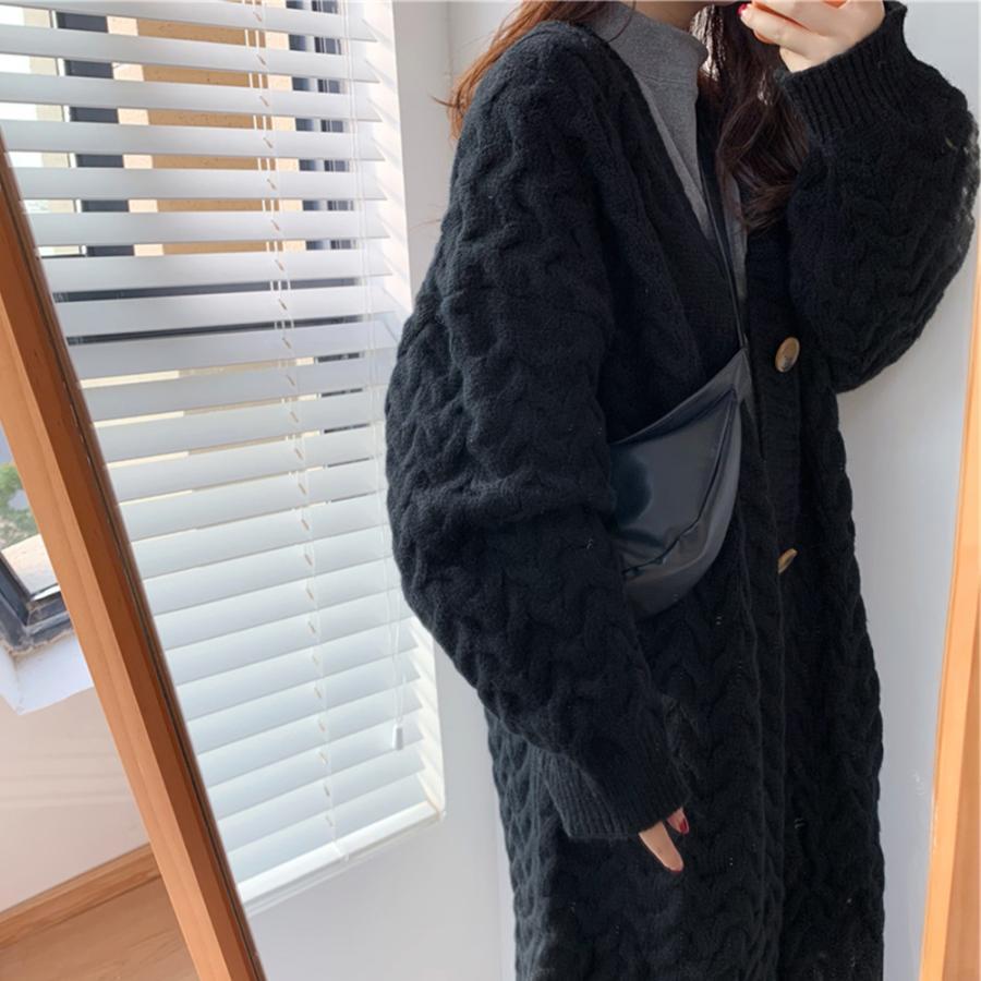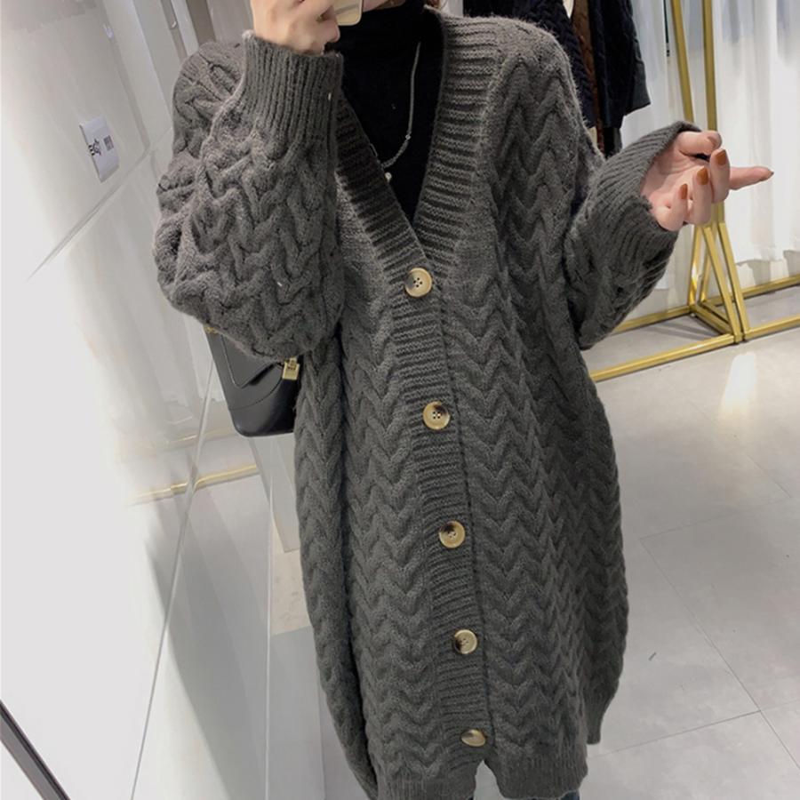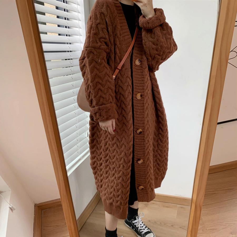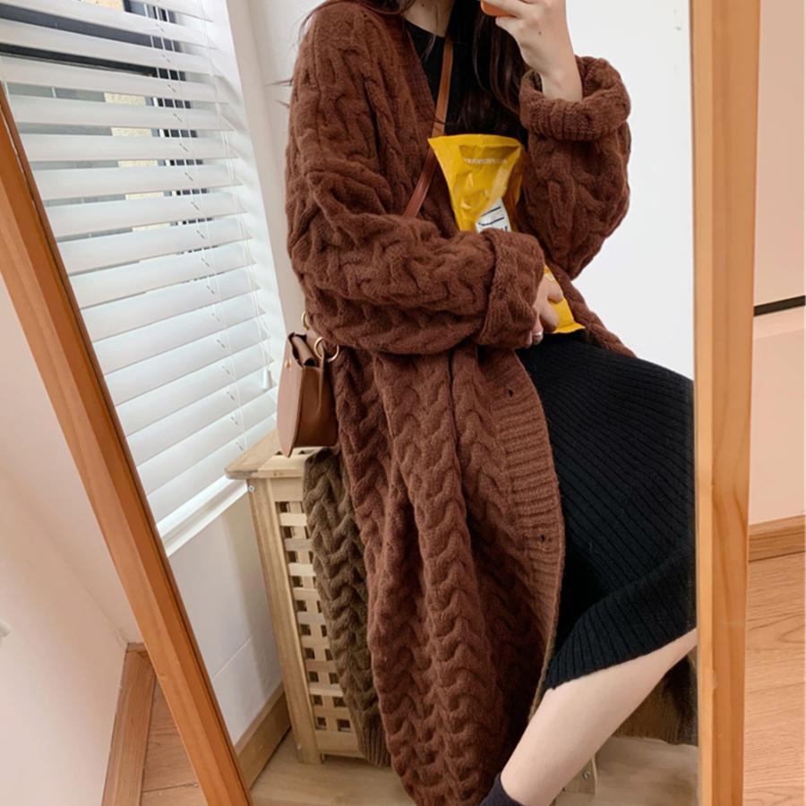 秋冬のワードローブに欠かせない立体的な大柄のケーブル編みロングニットカーディガン