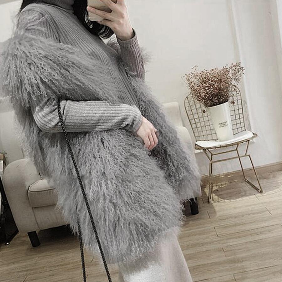 毛足が長くカールしているのが特徴的な暖かみのあるフェイクファー、ボリュームたっぷりのが大人可愛く着こなせる