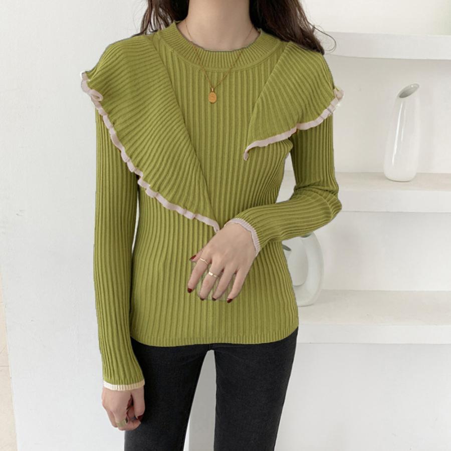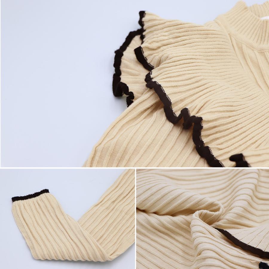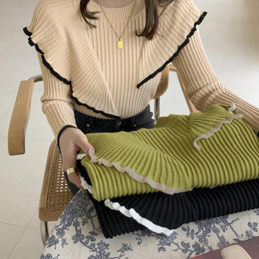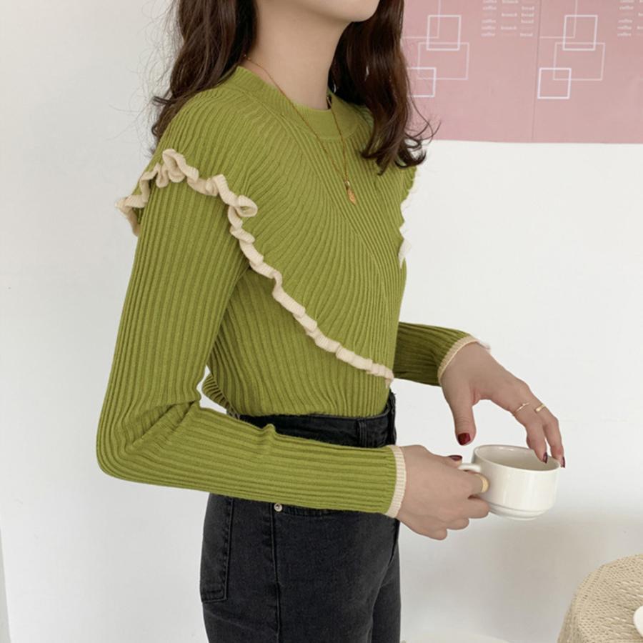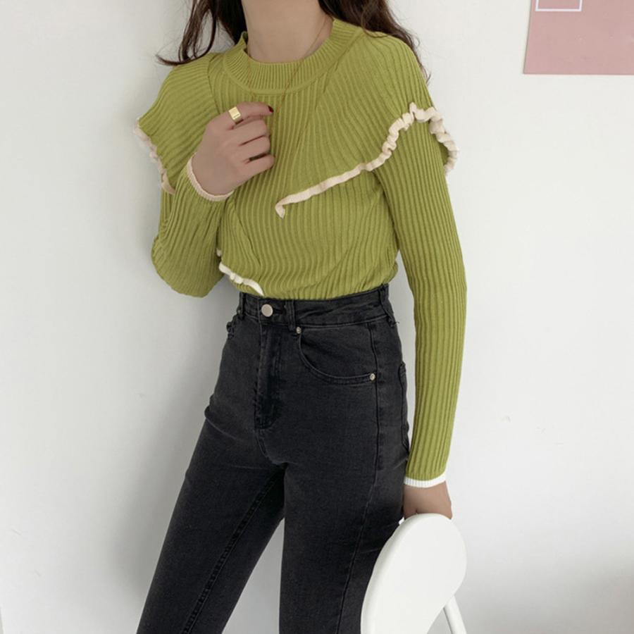 韓国風 モックネック ニットセーター フリルトップス長袖 秋冬 ニットソー スリムフィット 無地 ニットプルオーバー