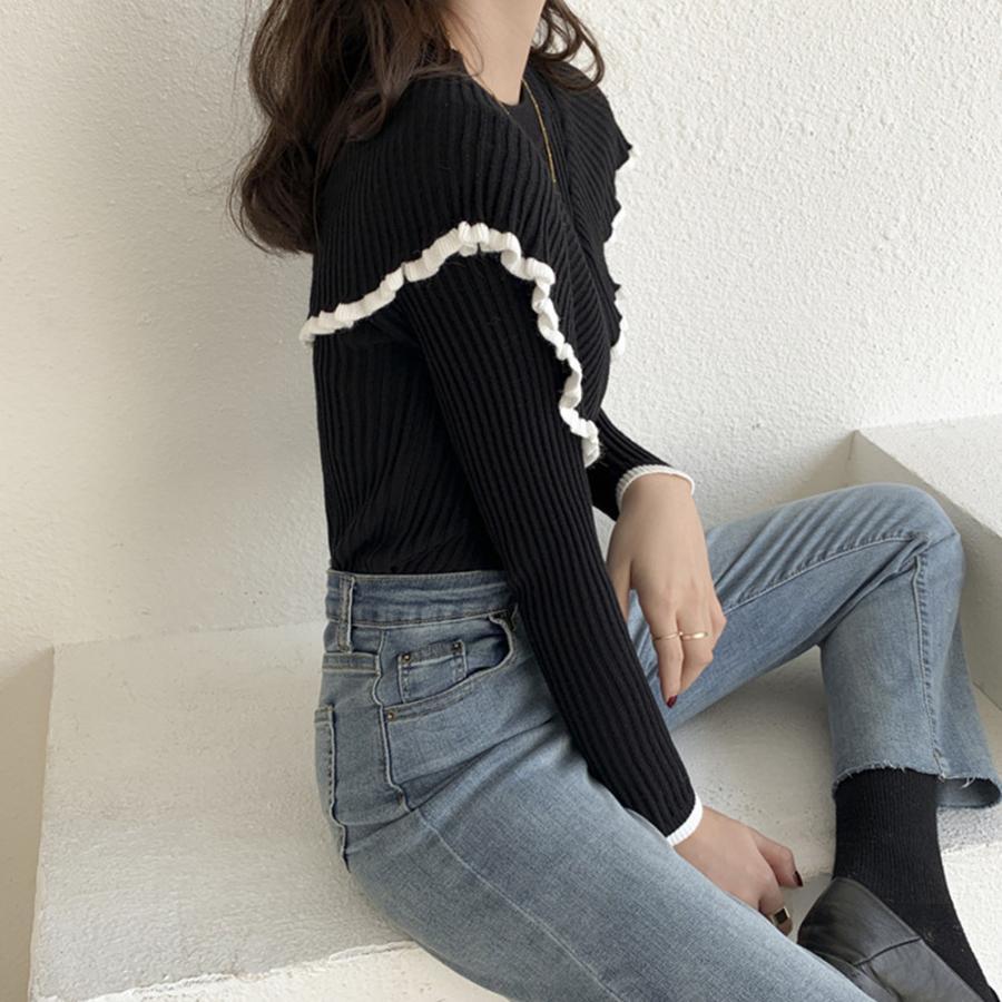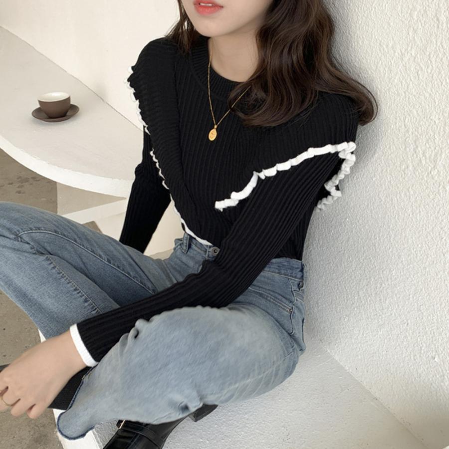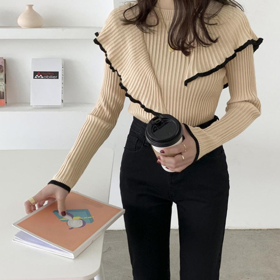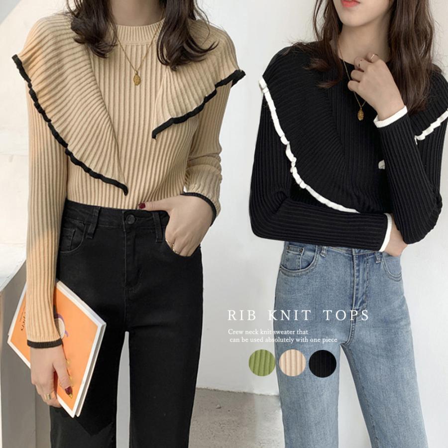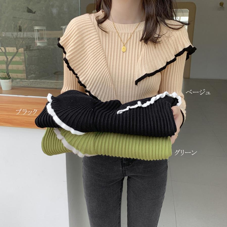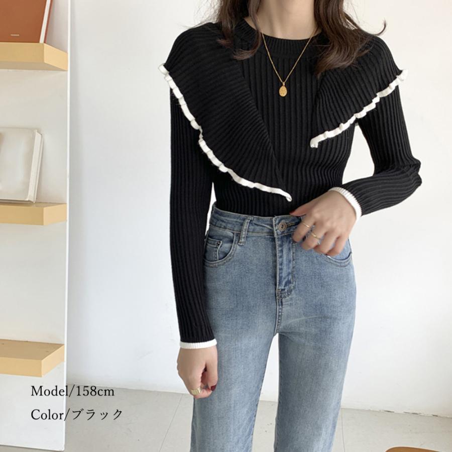 肩周りフリルのデザインが可愛くて、よい厚みのリブニット素材で暖かく、ロングシーズン活躍