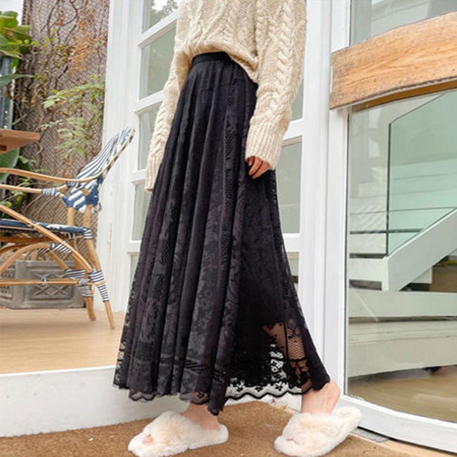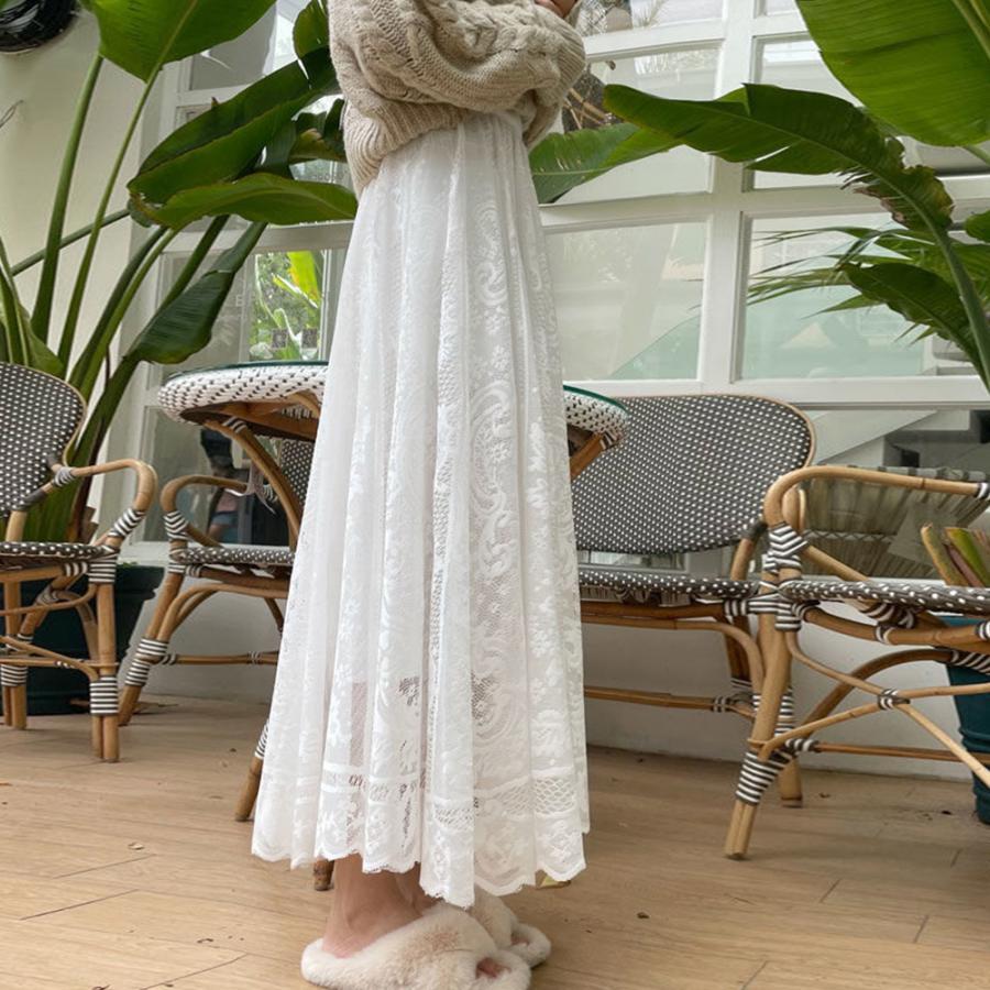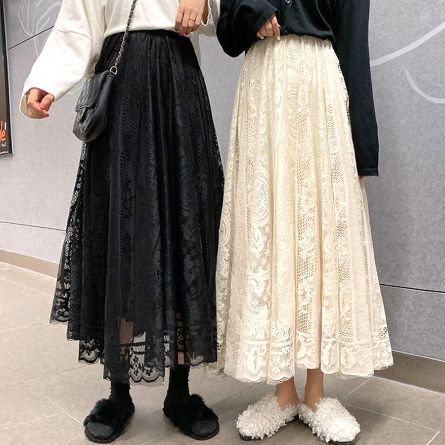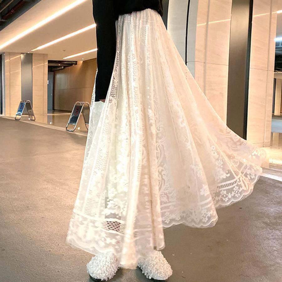 フレアスカート ウエストゴム シースルースカート 裏地付き エレガント ミモレスカート 韓国 フラワーレース お洒落