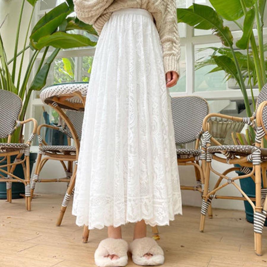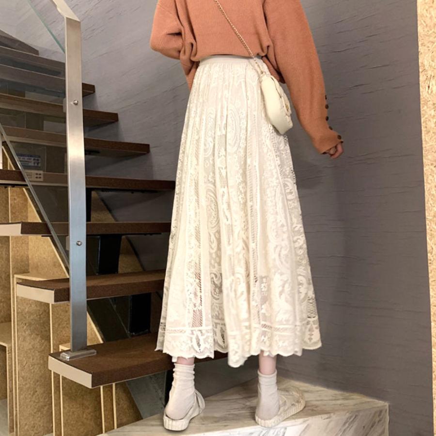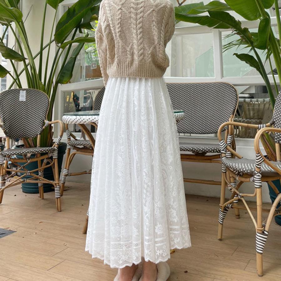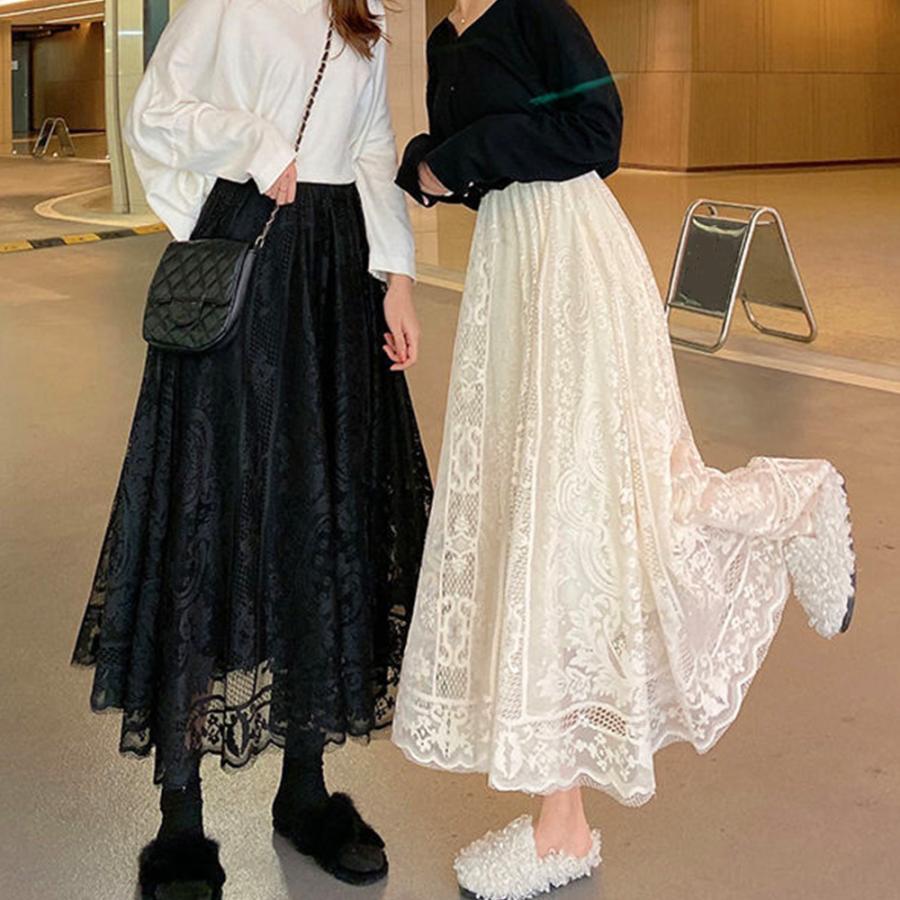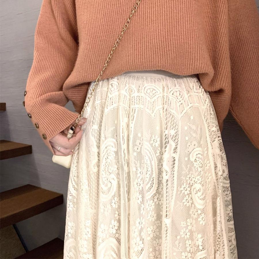 フレアスカート ウエストゴム シースルースカート 裏地付き エレガント ミモレスカート 韓国 フラワーレース お洒落
