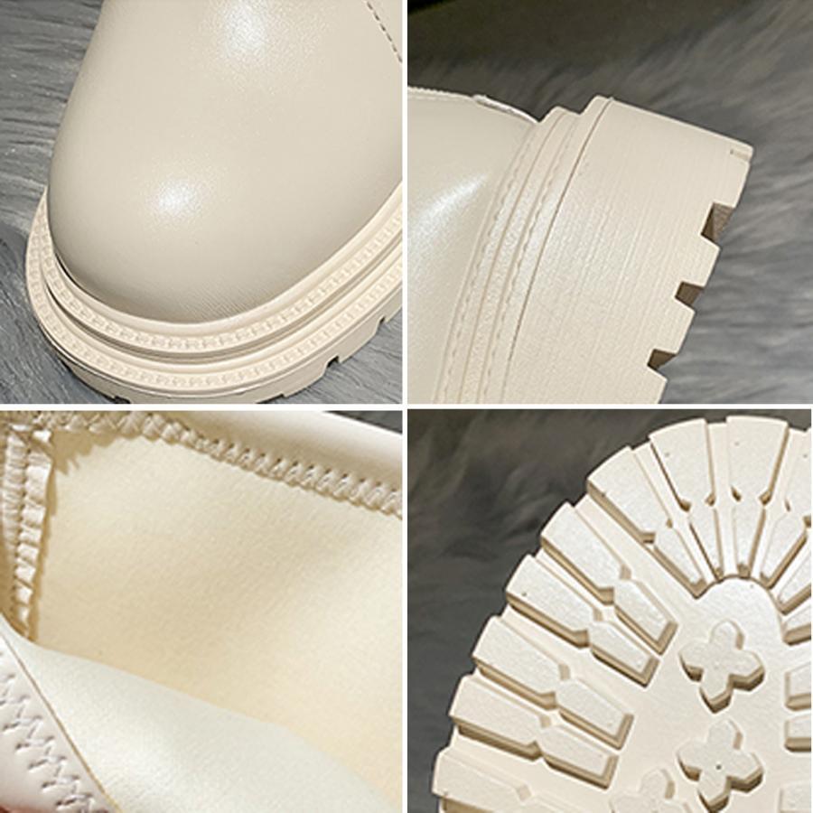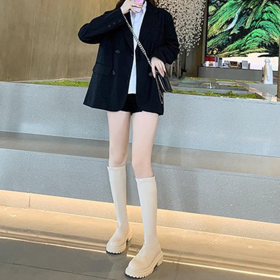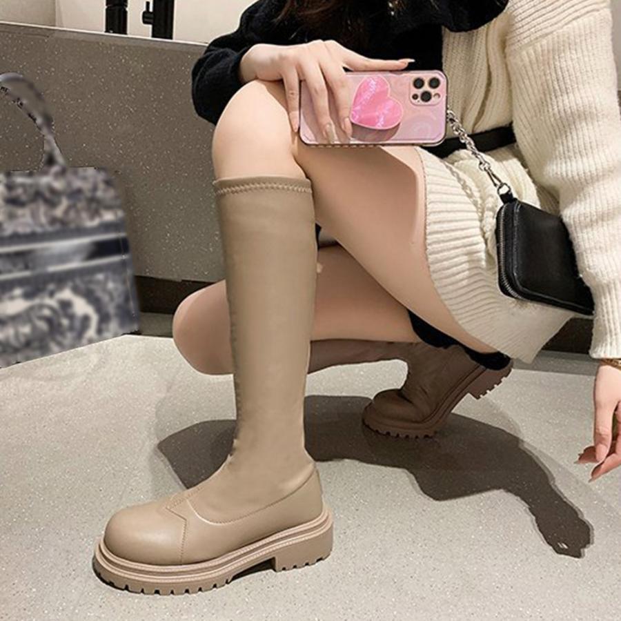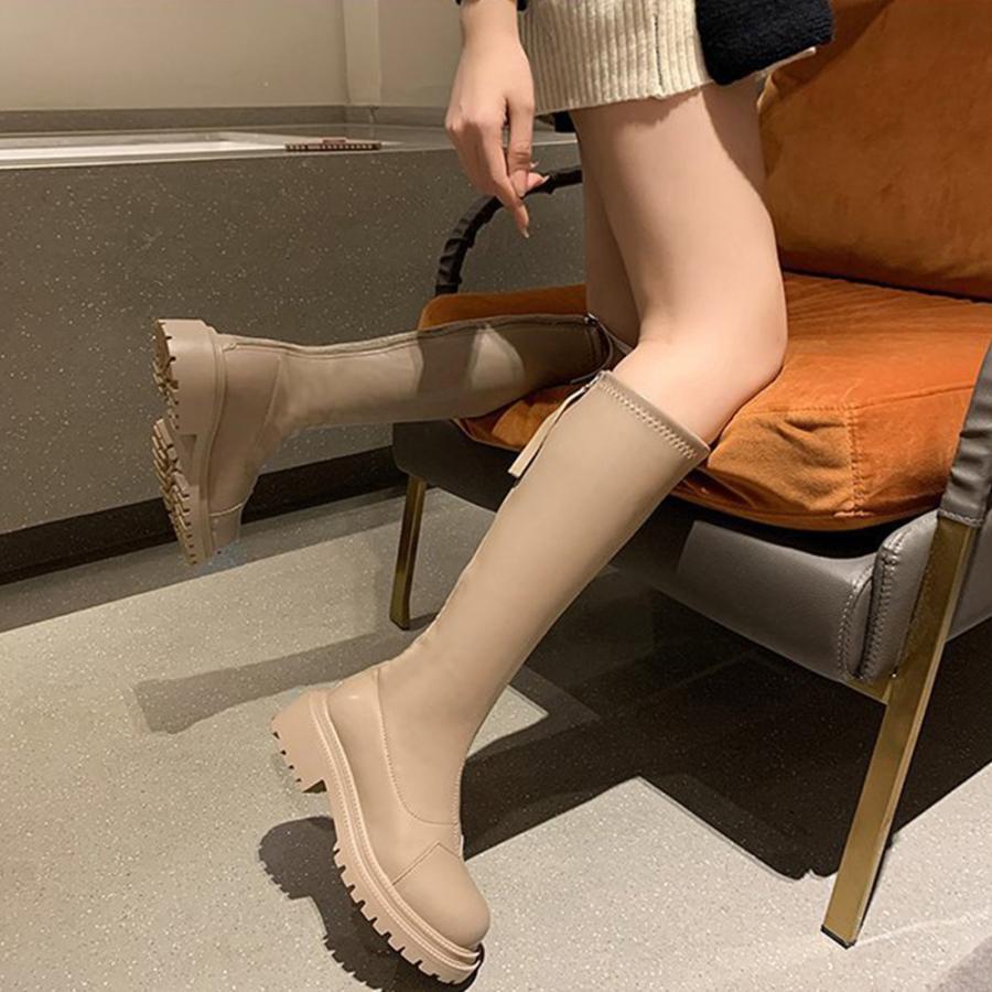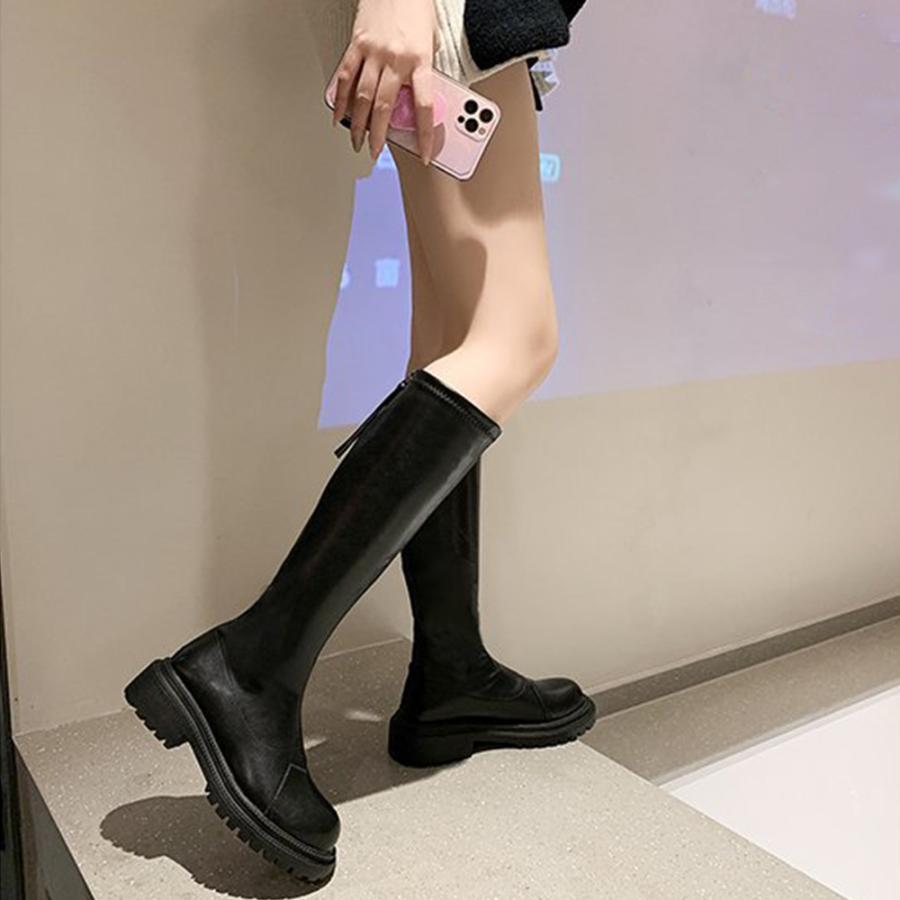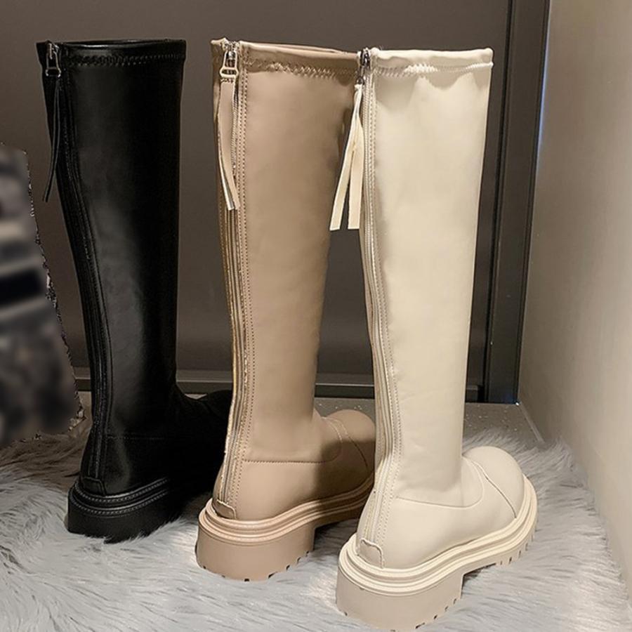 ストレッチブーツ 膝下 ジョッキーブーツ バックジップ ギザギザ厚底 PUブーツ 太ヒール おでこ靴 履きやすい