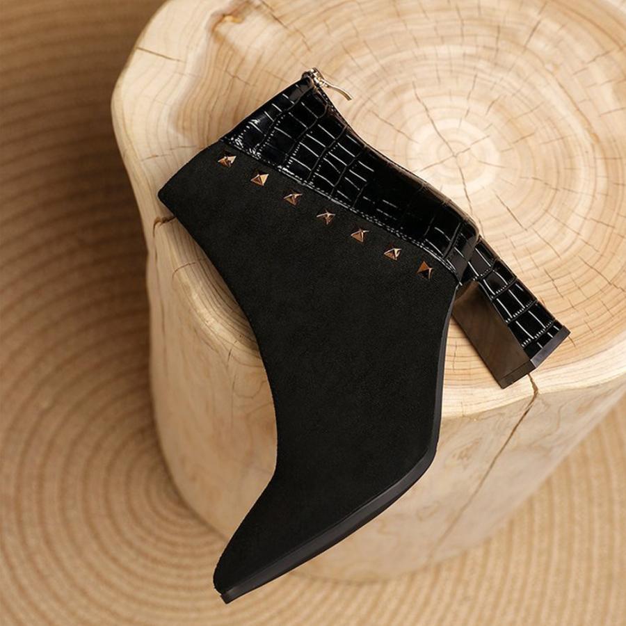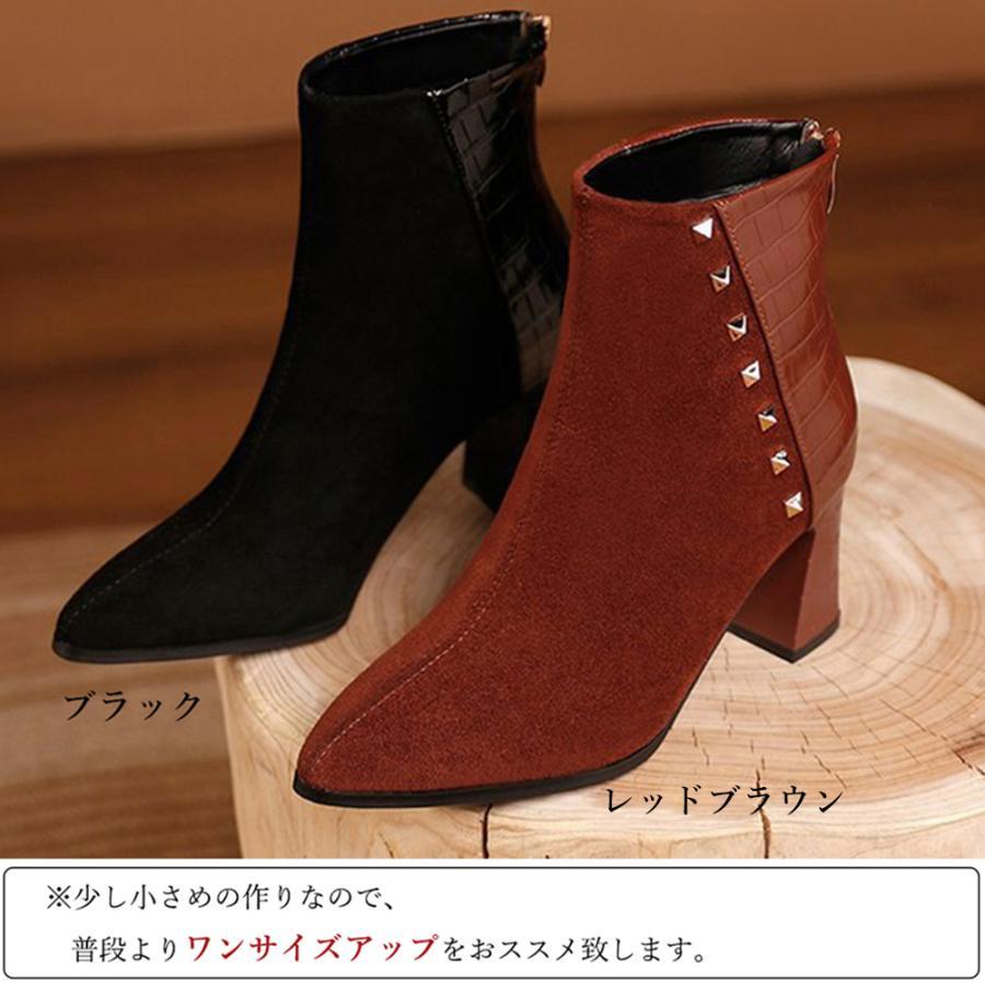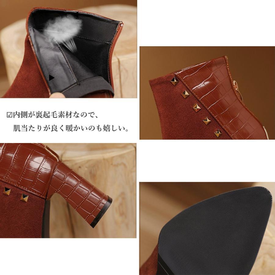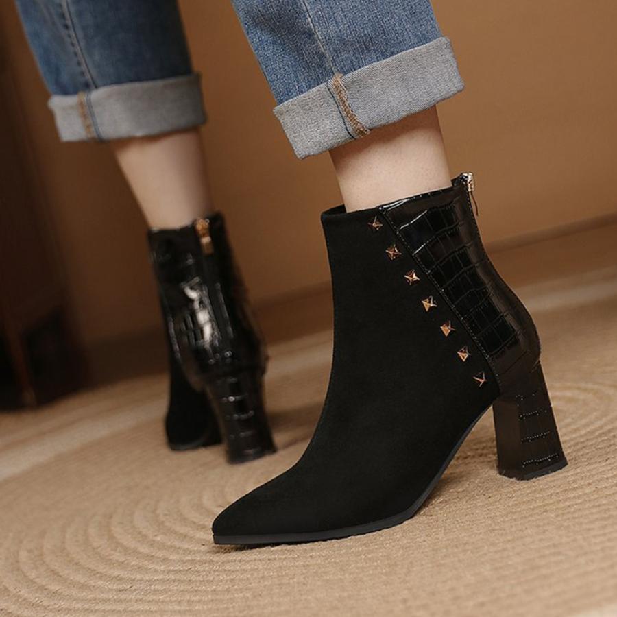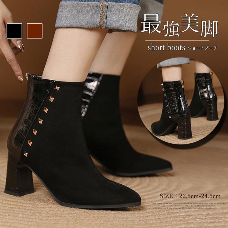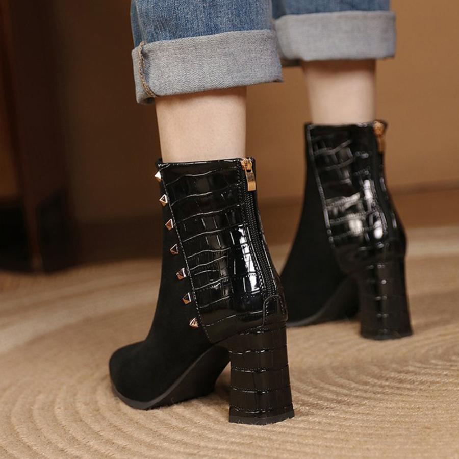チャンキーヒール クロコ型押しブーツ 韓国 ポインテッドトゥ アンクルブーツ ブーティ 太ヒール 秋冬 靴 スエード調