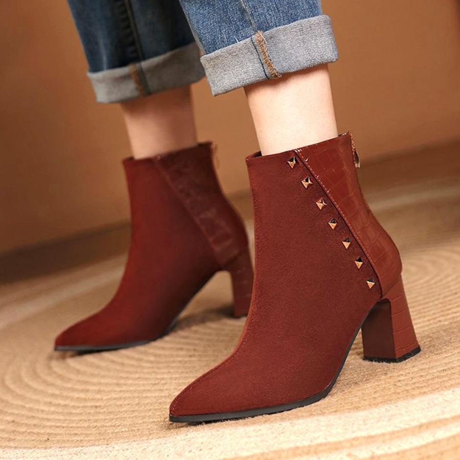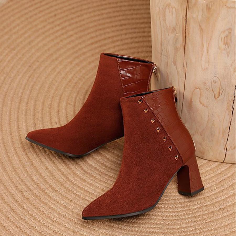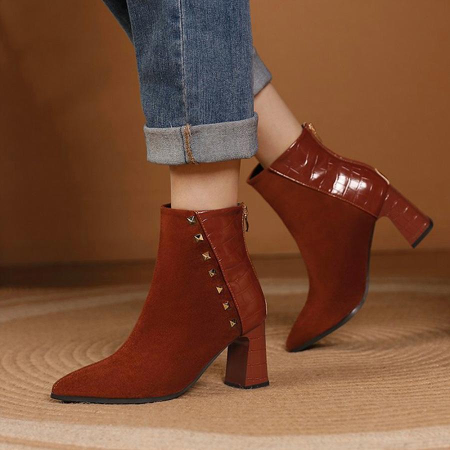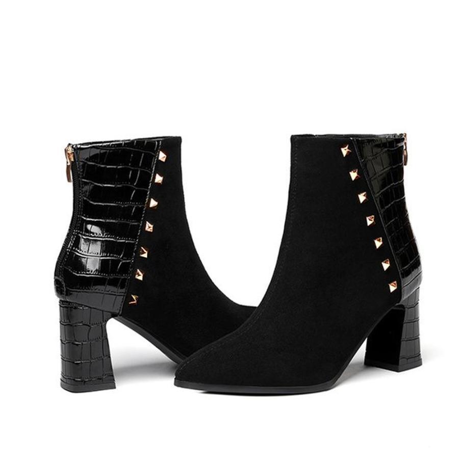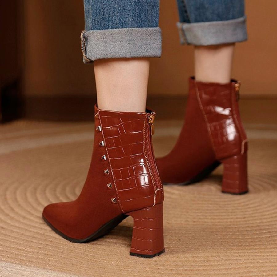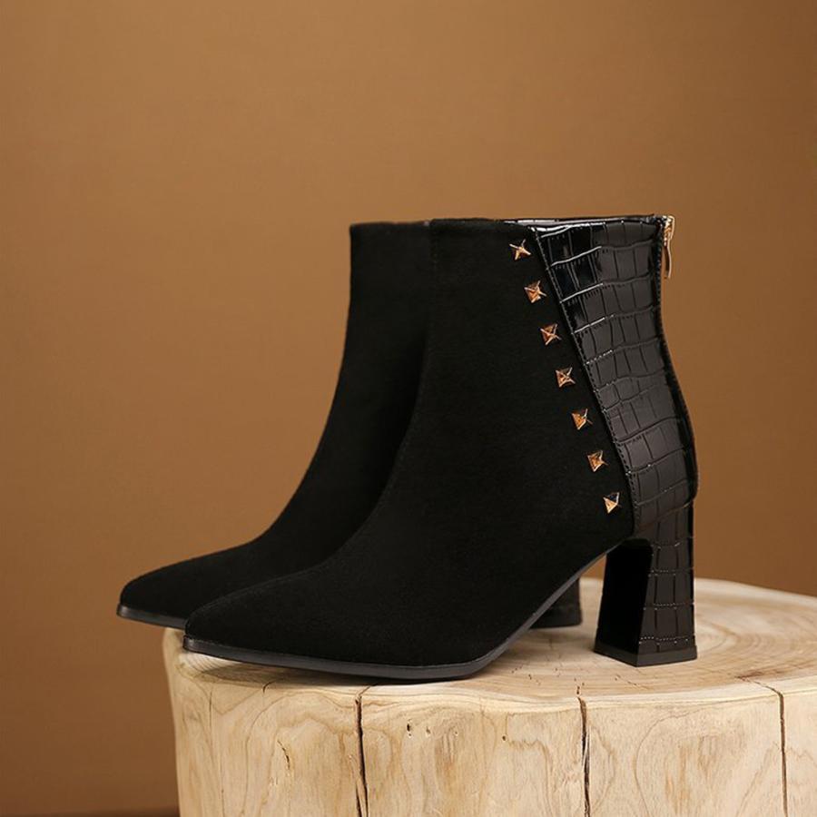 チャンキーヒール クロコ型押しブーツ 韓国 ポインテッドトゥ アンクルブーツ ブーティ 太ヒール 秋冬 靴 スエード調