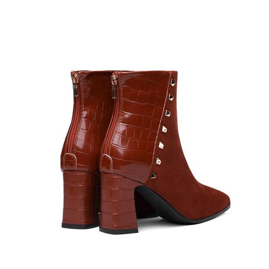 スエード調素材にクロコダイル模様型押しのエナメル調素材を加え、洗練された雰囲気を醸し出すスタッズ付きの異素材mixブーティ