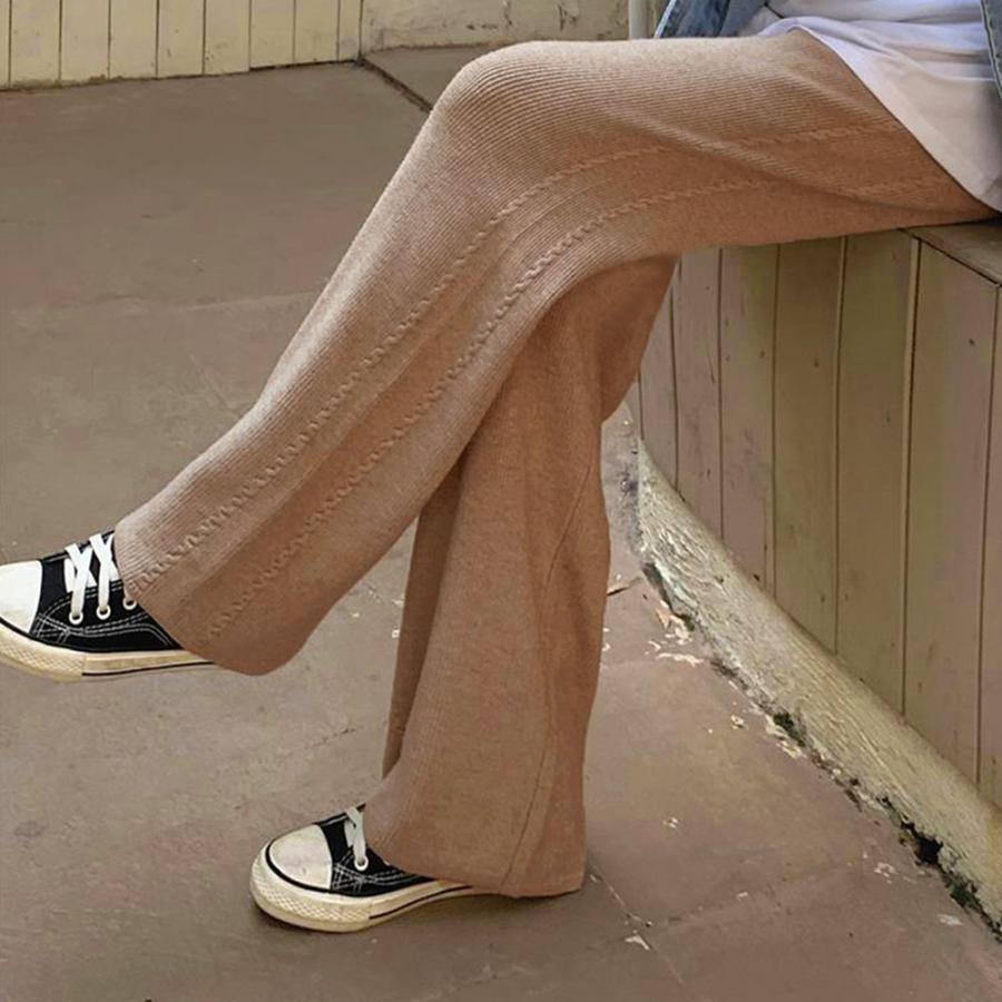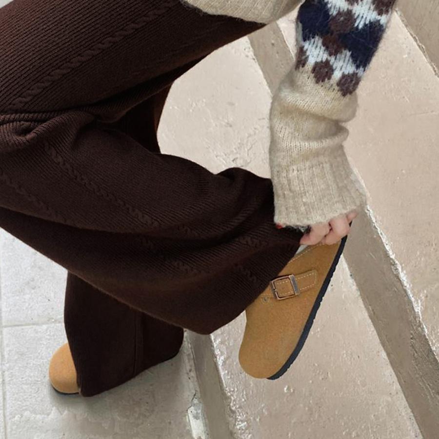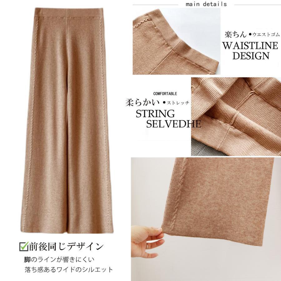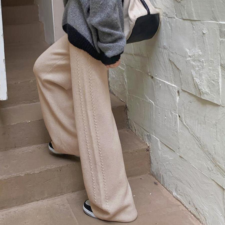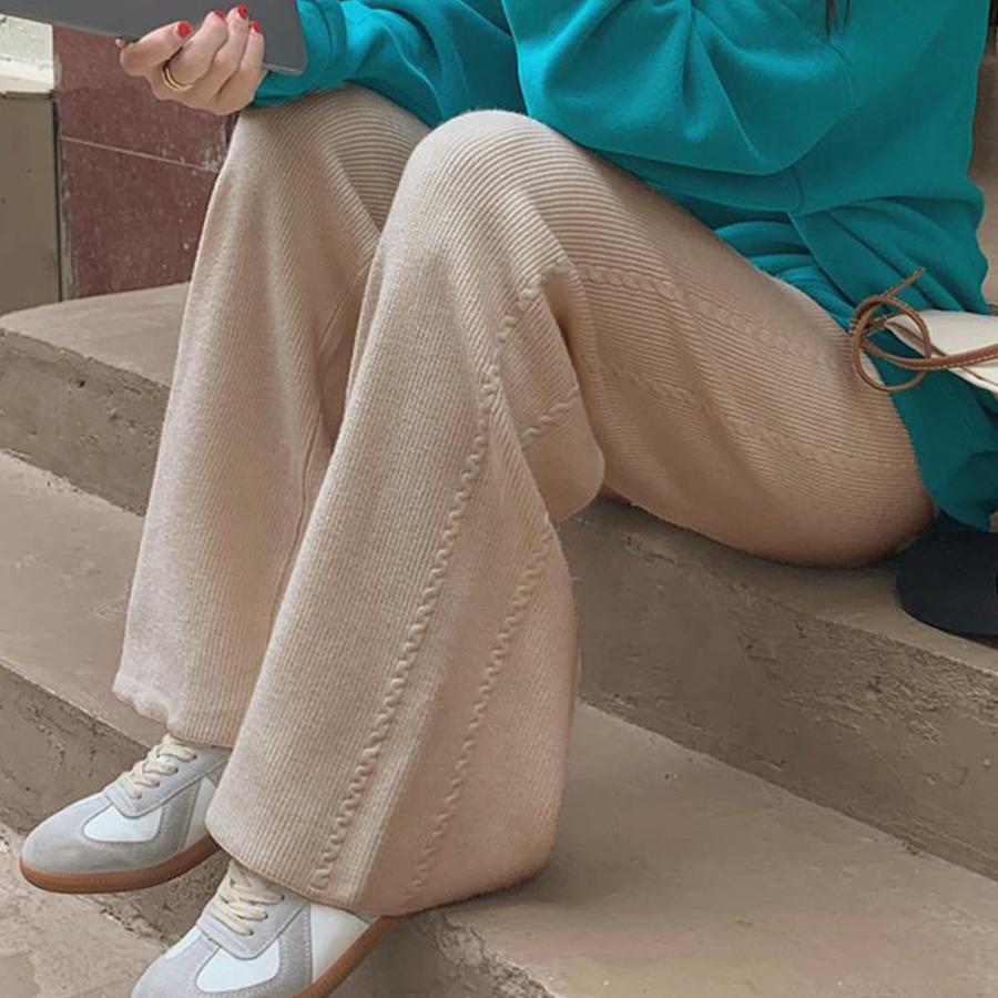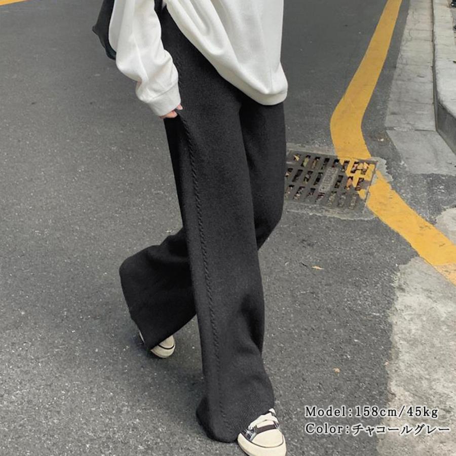 サイドに施した表情豊かなケーブル編みが目を惹くニットワイドパンツ