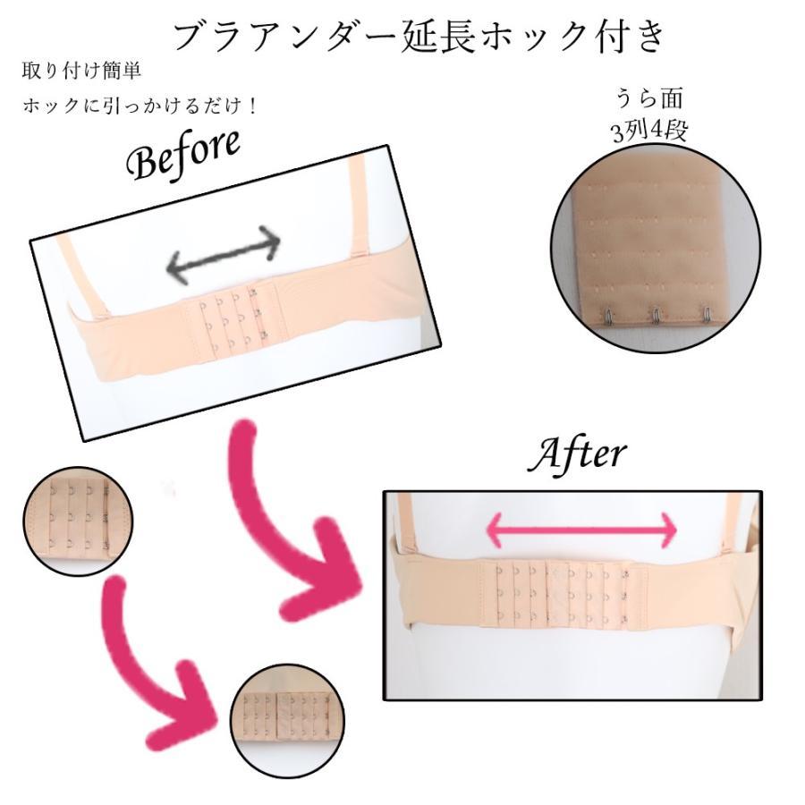 3/4カップ、ホック3列4段階調節、肩紐取外し可、ワイヤー:なし