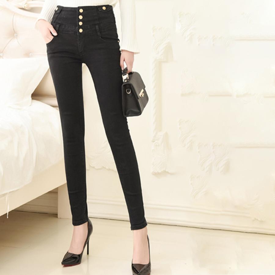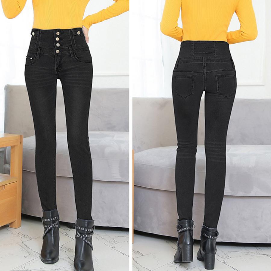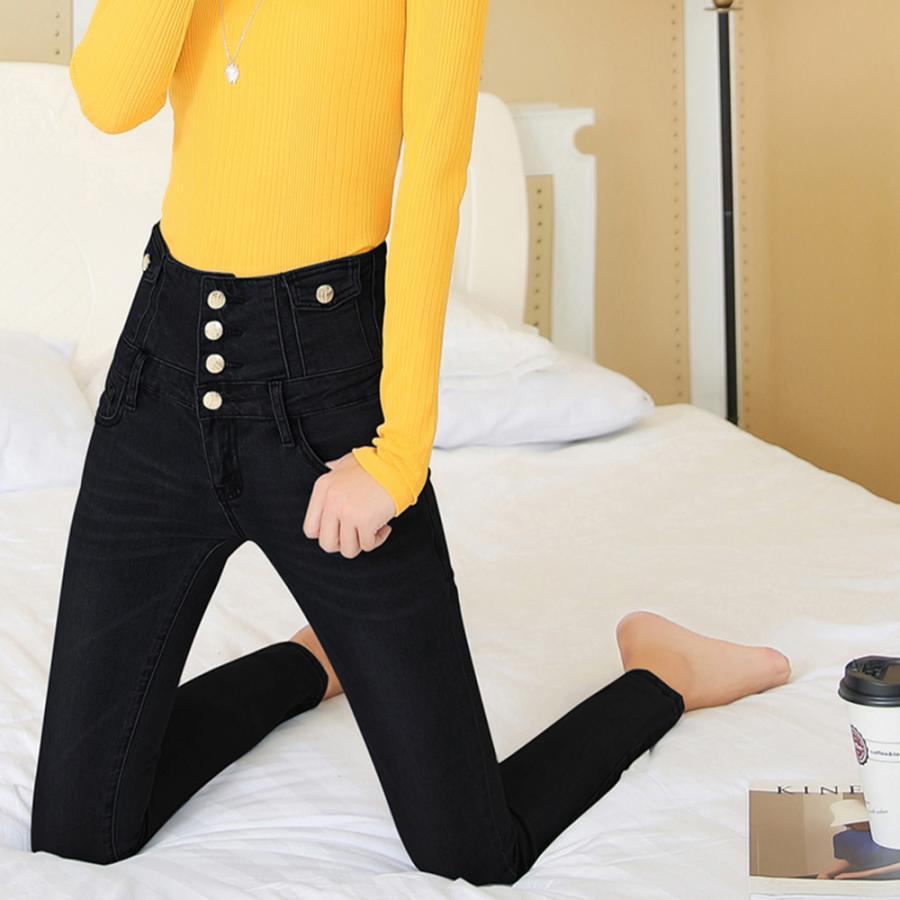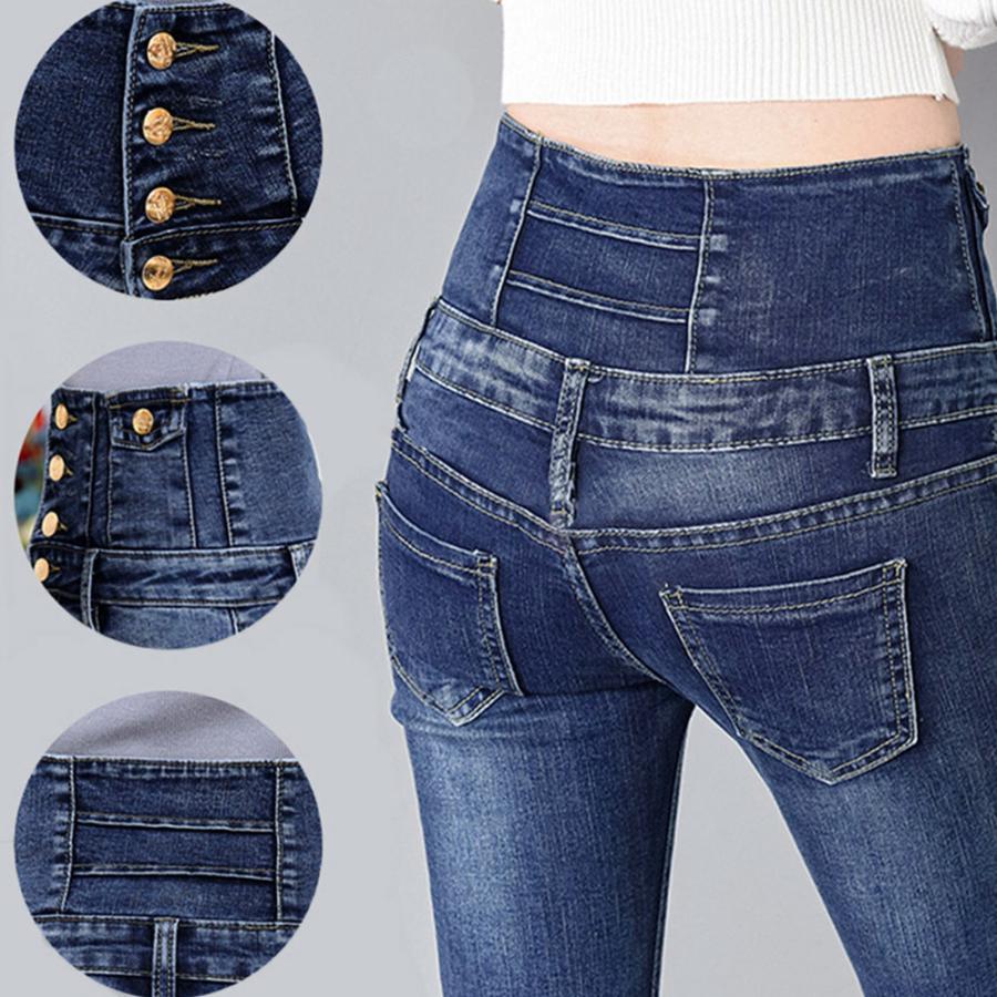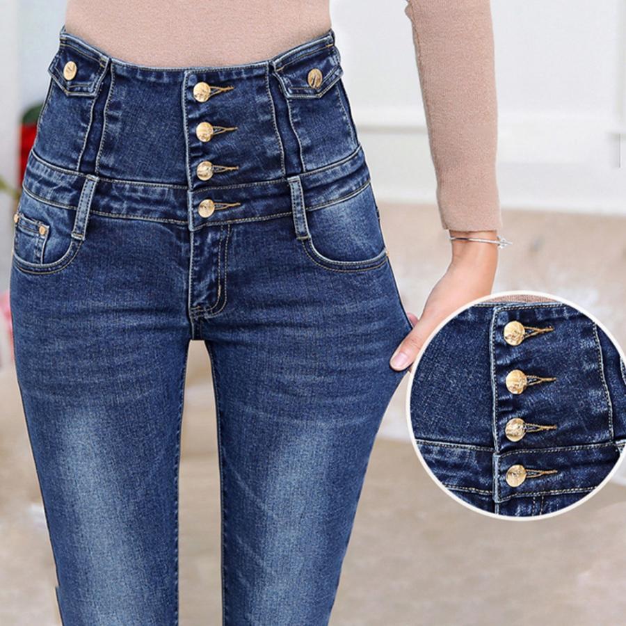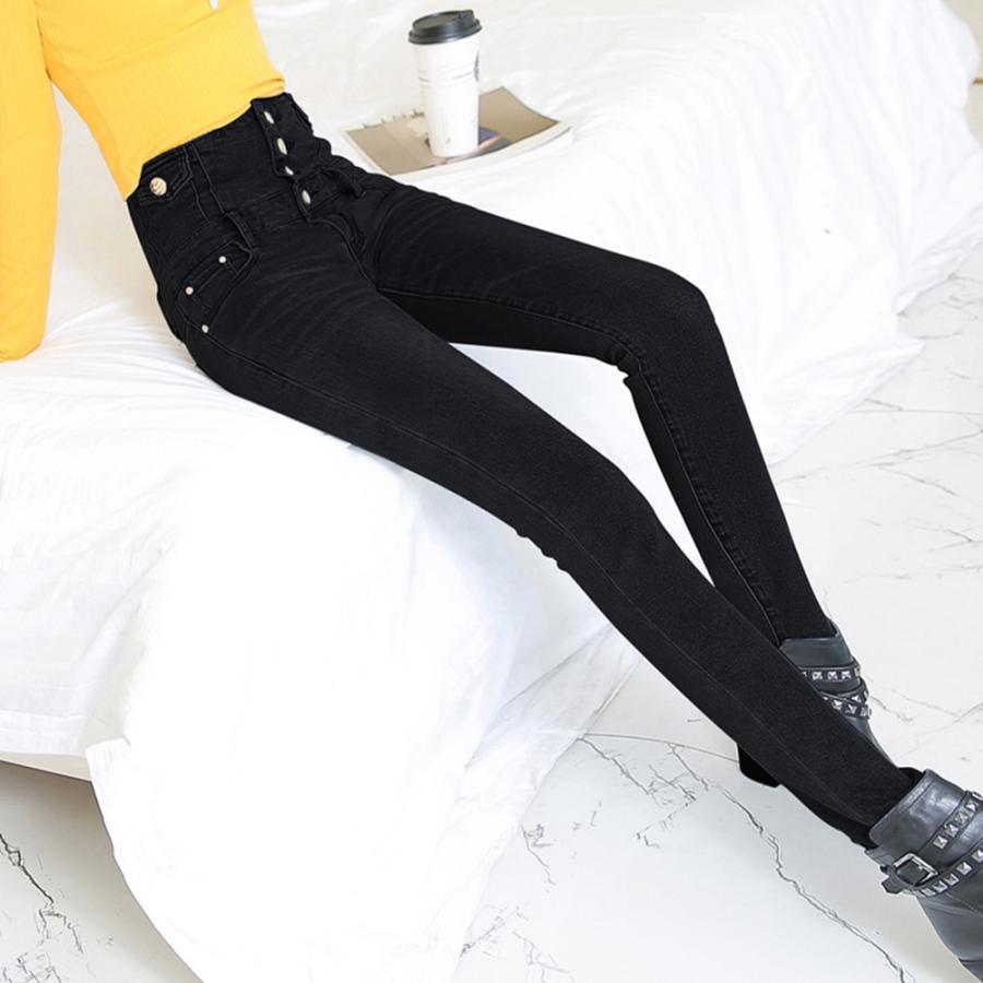 脚長、スタイルアップ抜群のハイウエストボタンスキニーデニムパンツ
