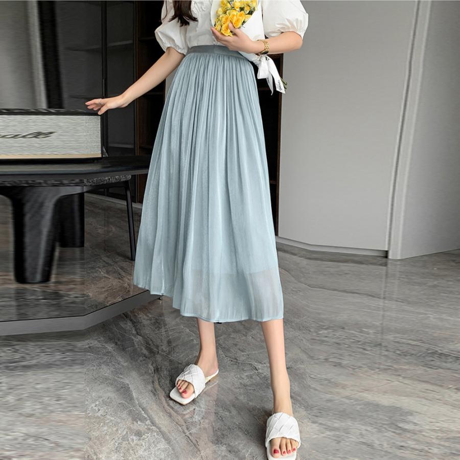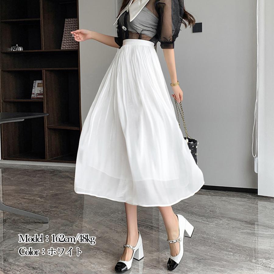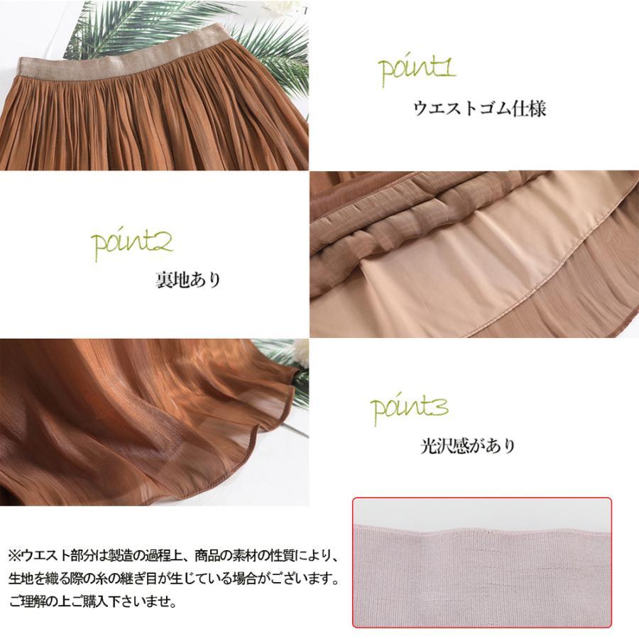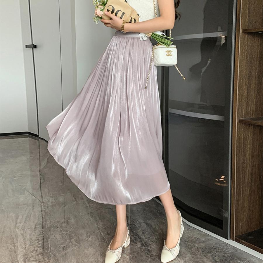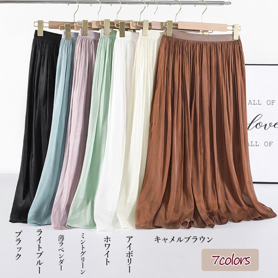 大人可愛い 体型カバー サテン風スカート ウエストゴム 春夏 ミモレスカート ハイウエストふんわり 無地ボトムス 光沢感