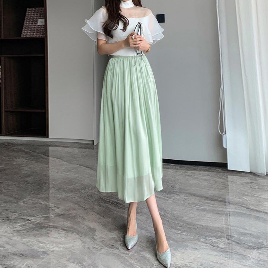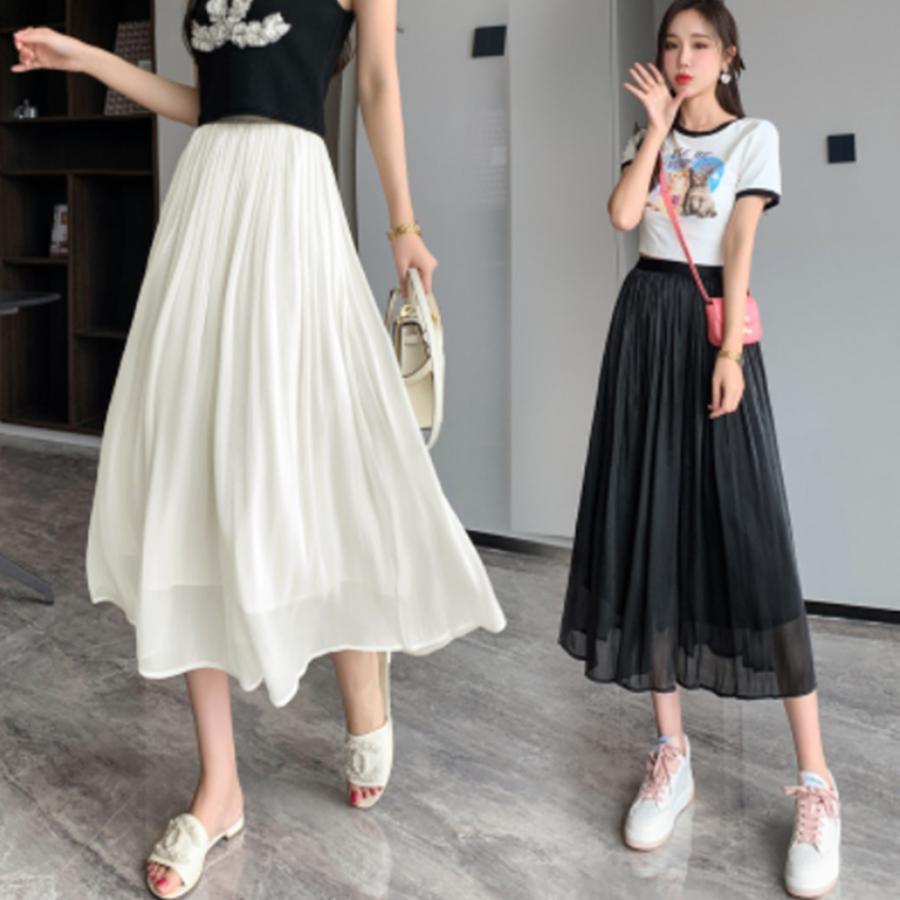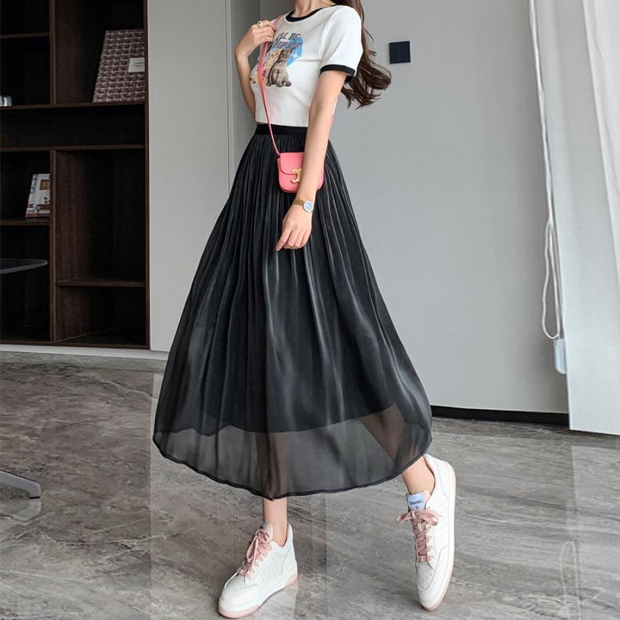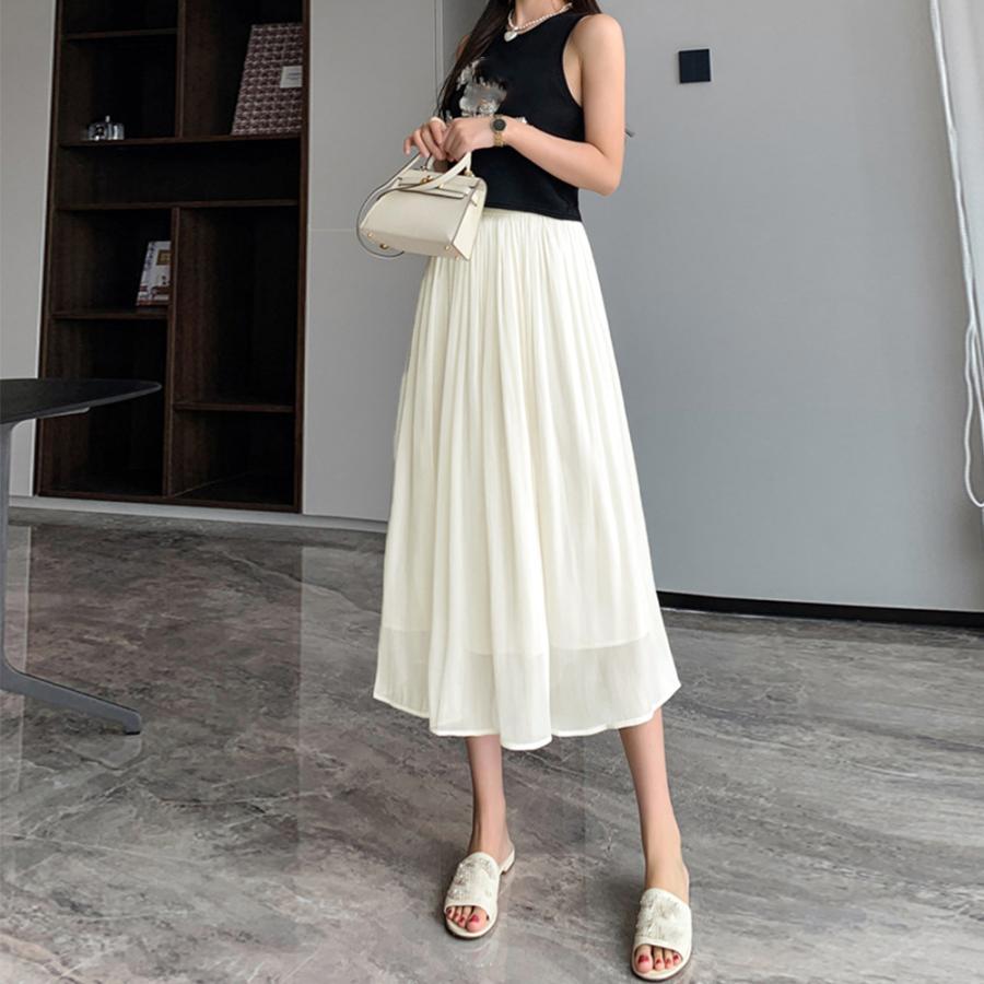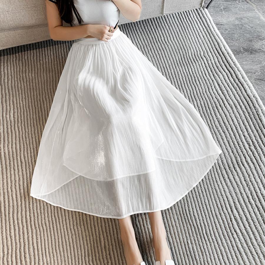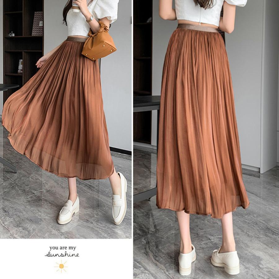 大人可愛い 体型カバー サテン風スカート ウエストゴム 春夏 ミモレスカート ハイウエストふんわり 無地ボトムス 光沢感