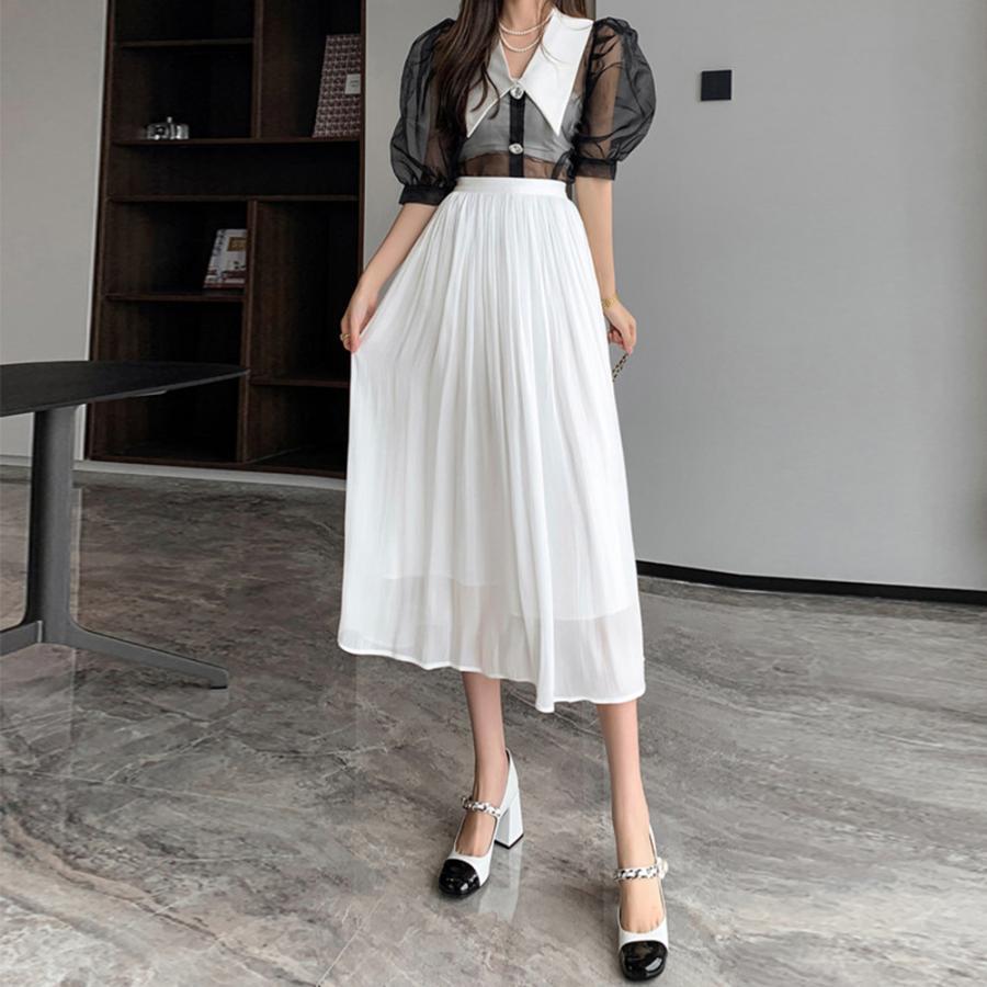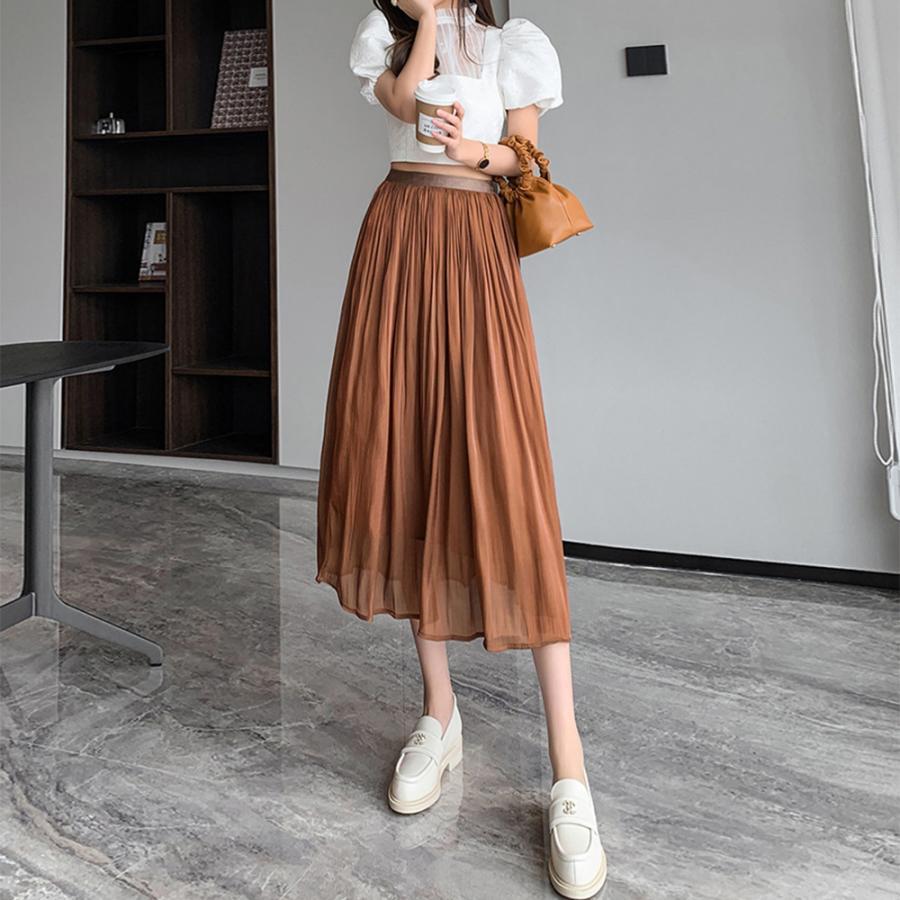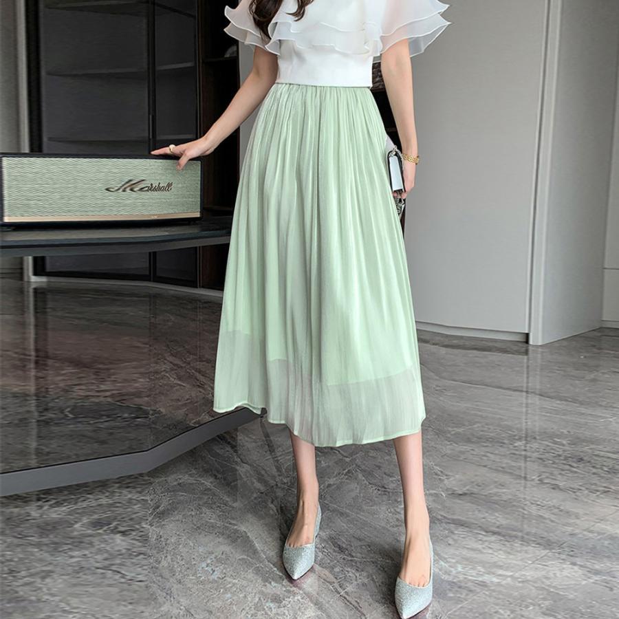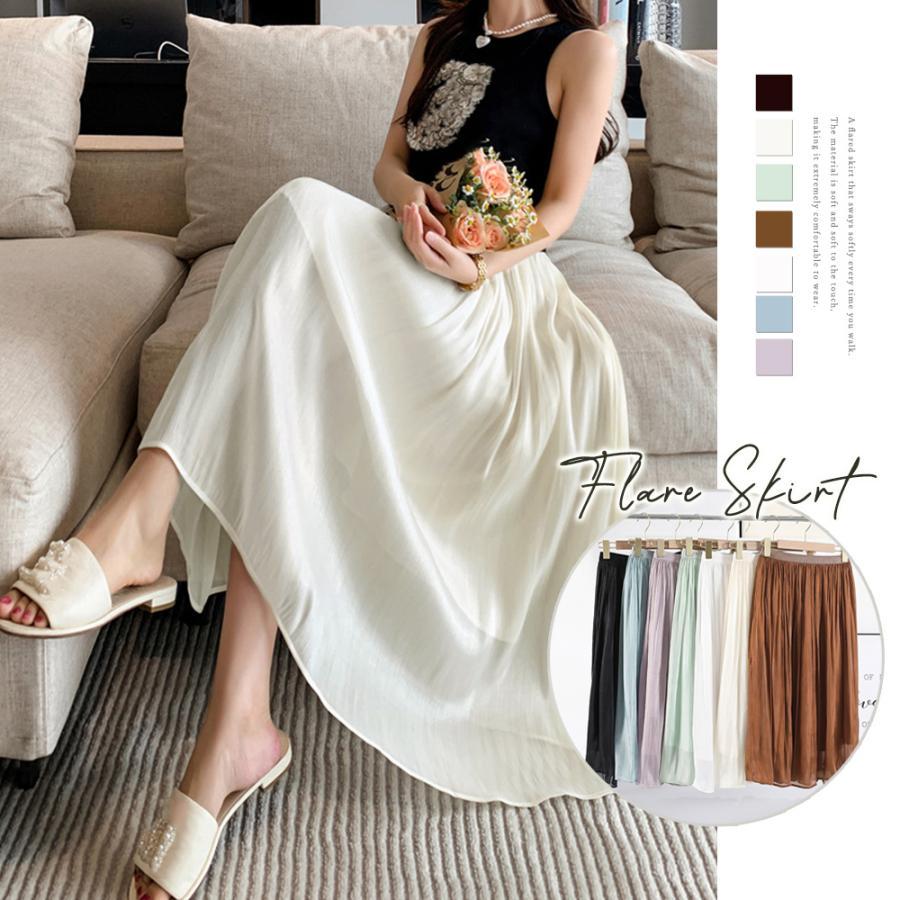 光沢感があり、なめらかな質感が特徴のフレアスカート