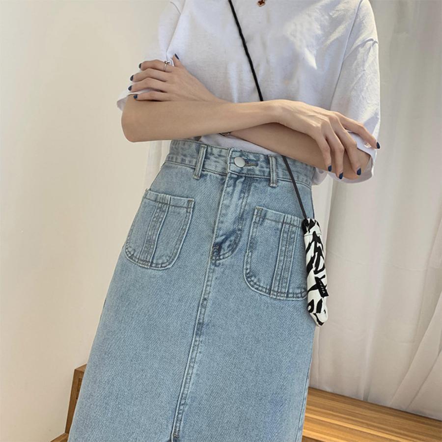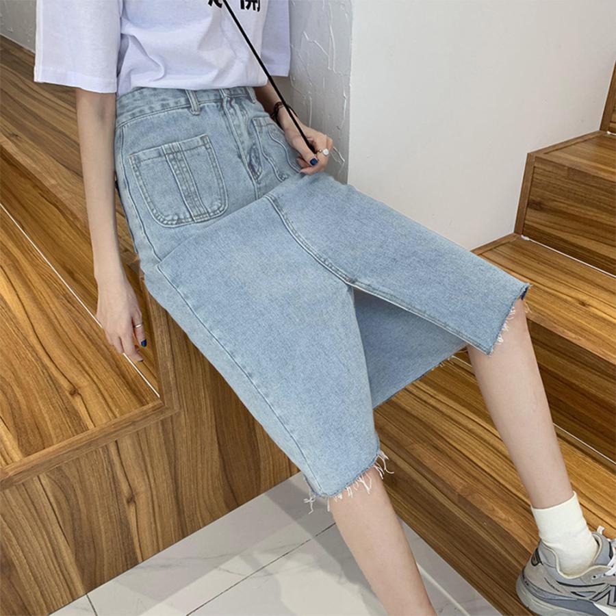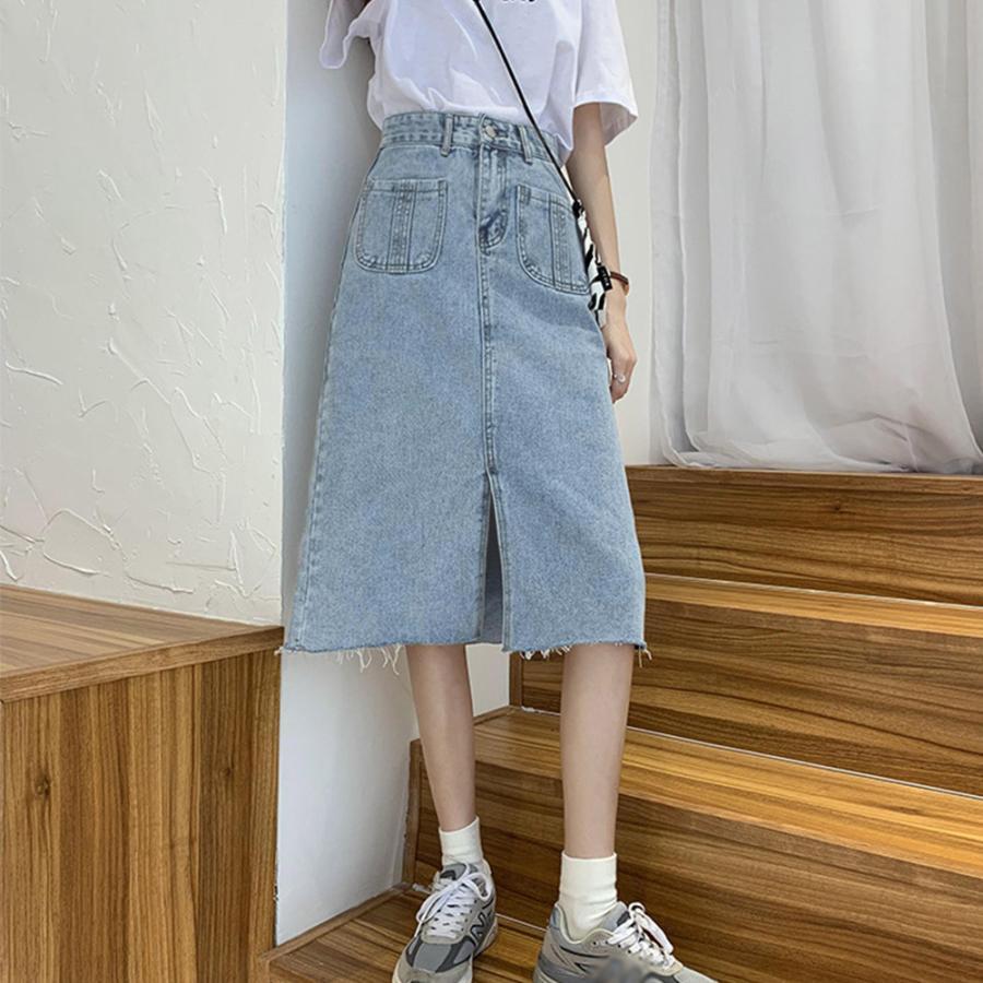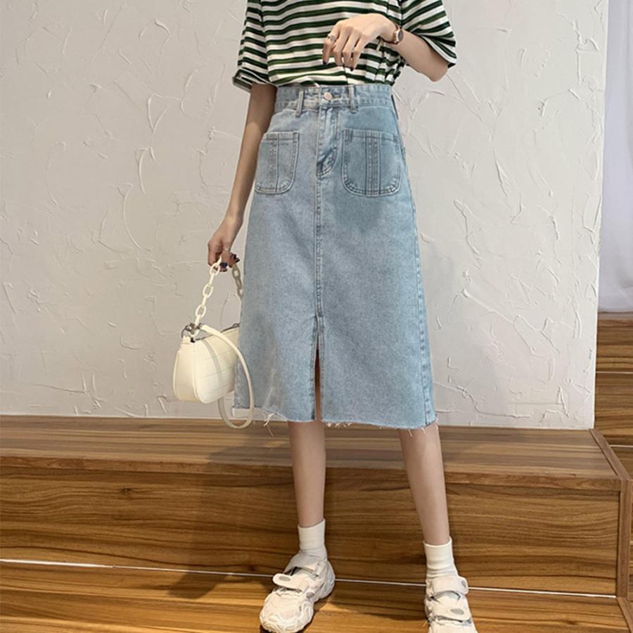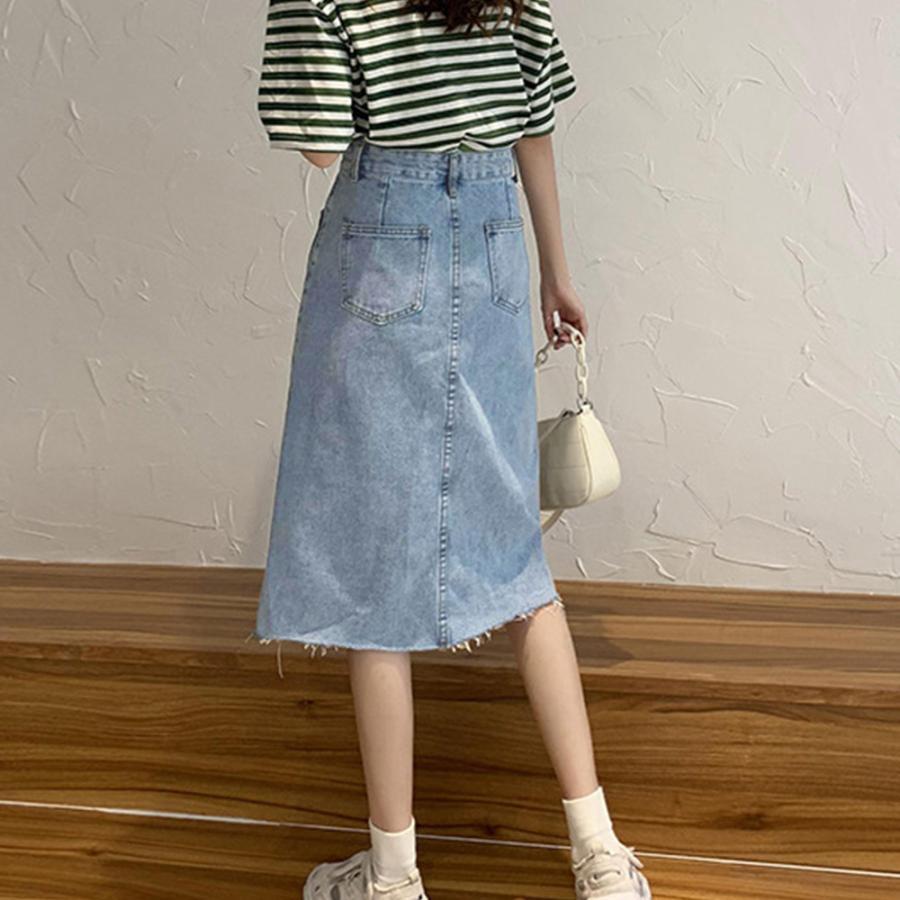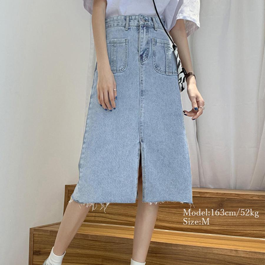 ひざ丈スカート | 膝下丈 デニムスカート レディース Aライン カジュアル ボトムス 裾フリンジ スリット