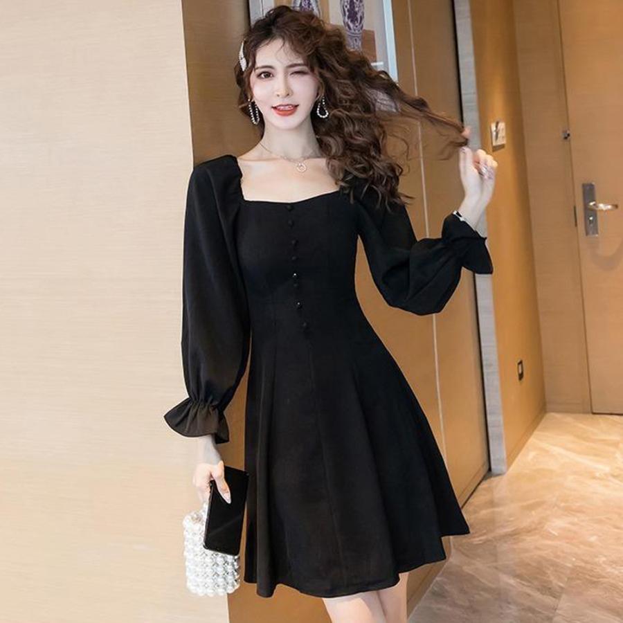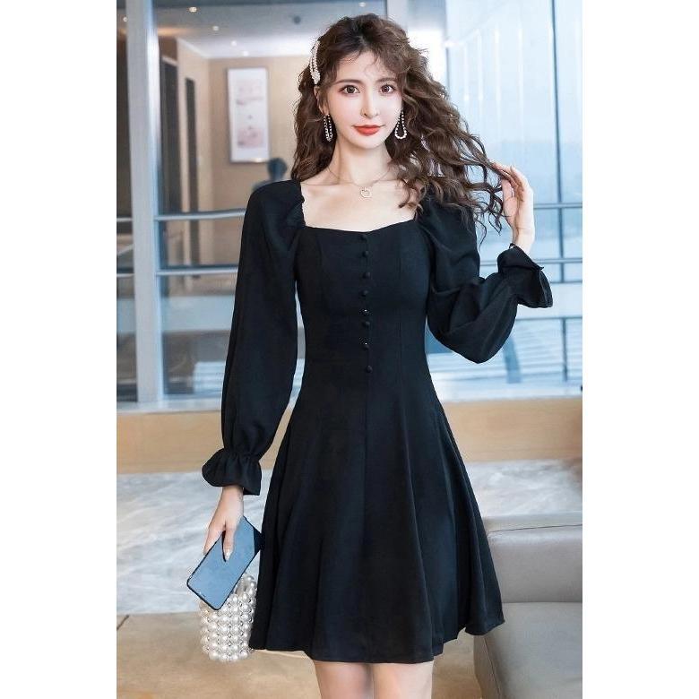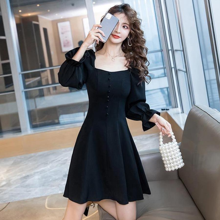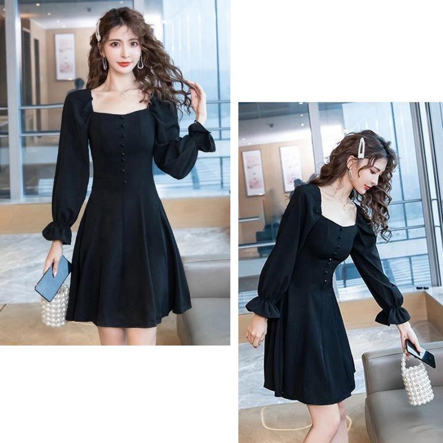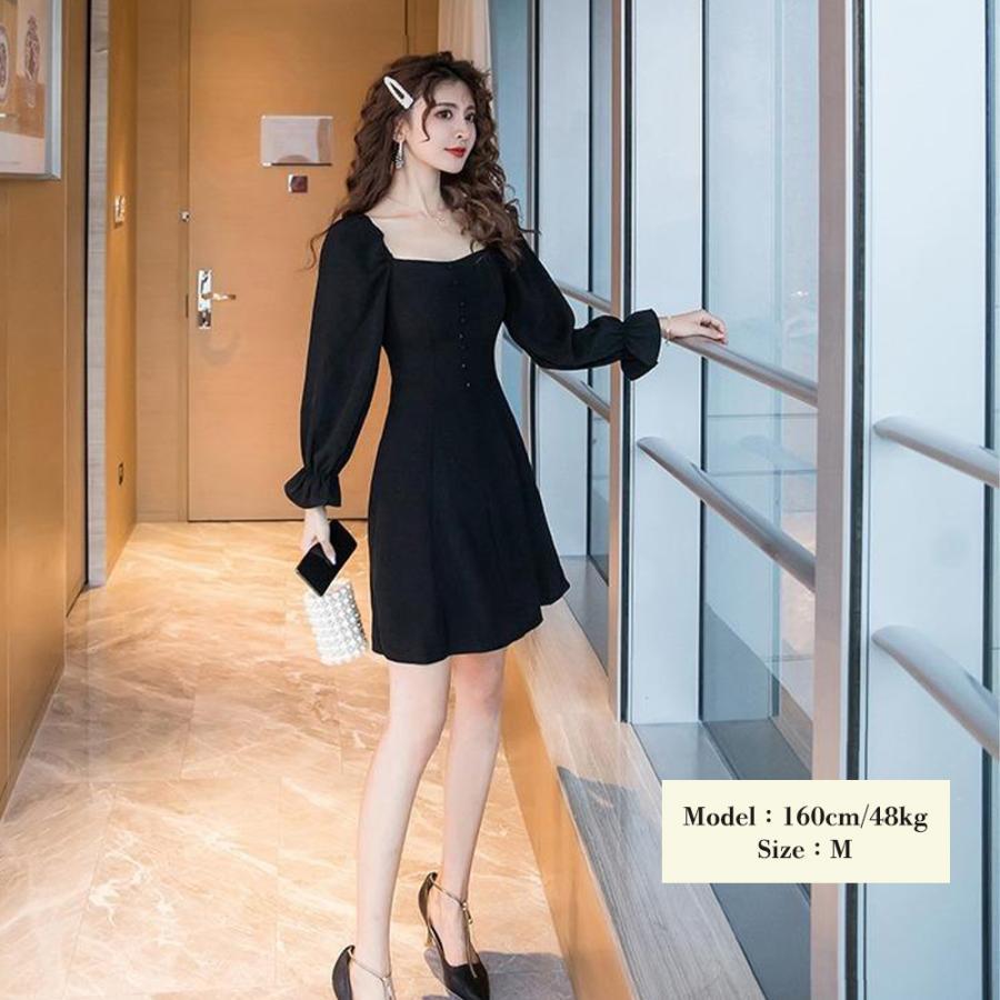 韓国風 ショート丈 長袖 ハイウエスト ボタン飾り レトロ風ワンピ 大人 可愛い デート おしゃれ 春秋冬