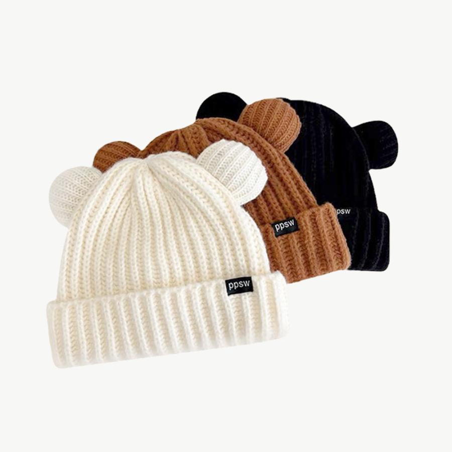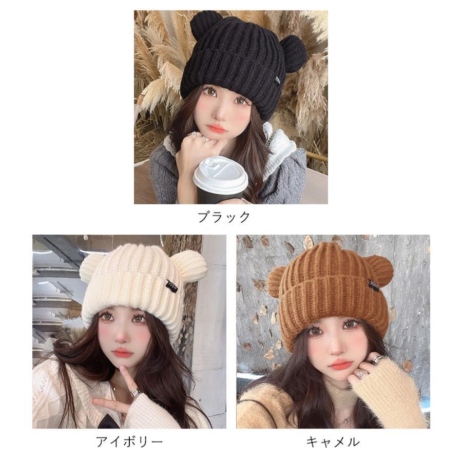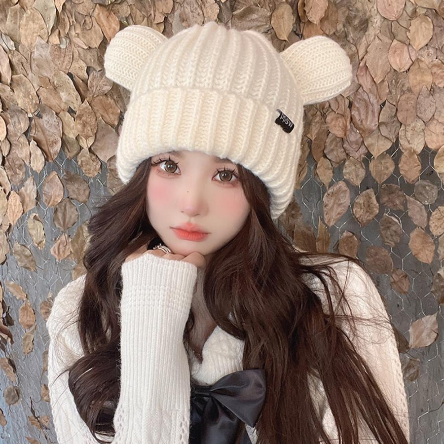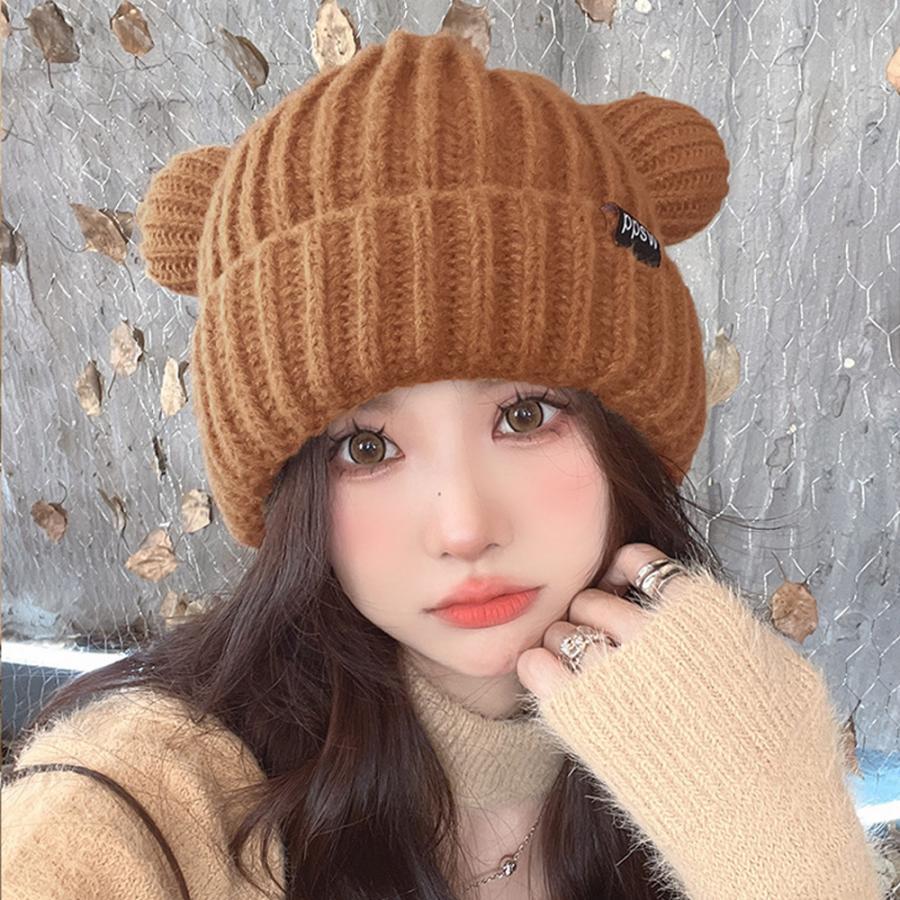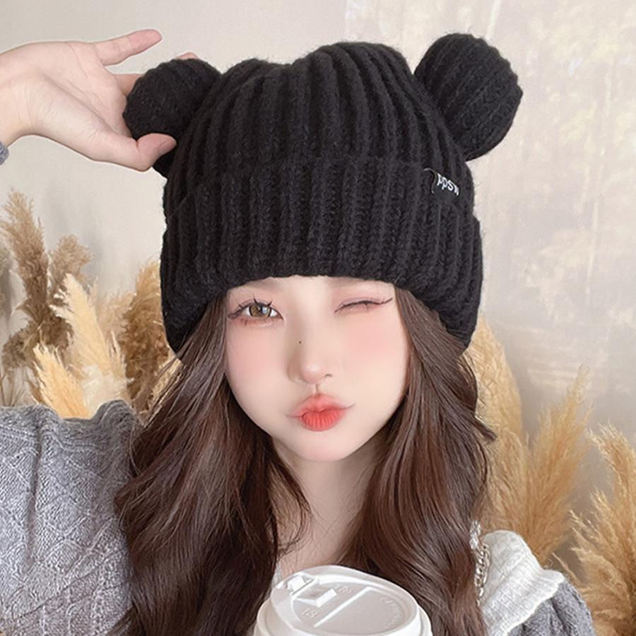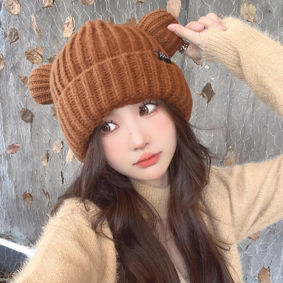 秋冬 耳付き 厚手 リブ編み帽子 小顔 可愛い 寒さ対策 おしゃれ コスプレ 仮装帽子 3色 黒