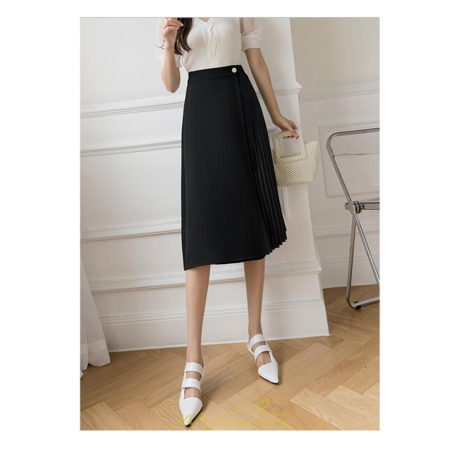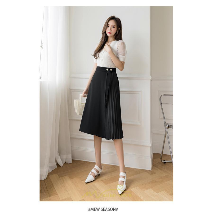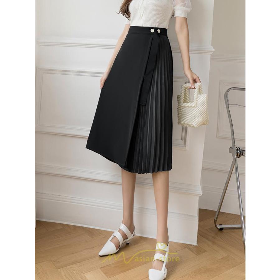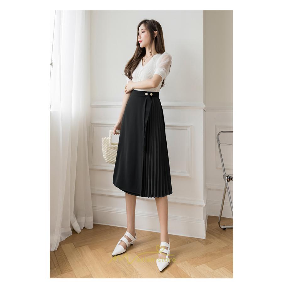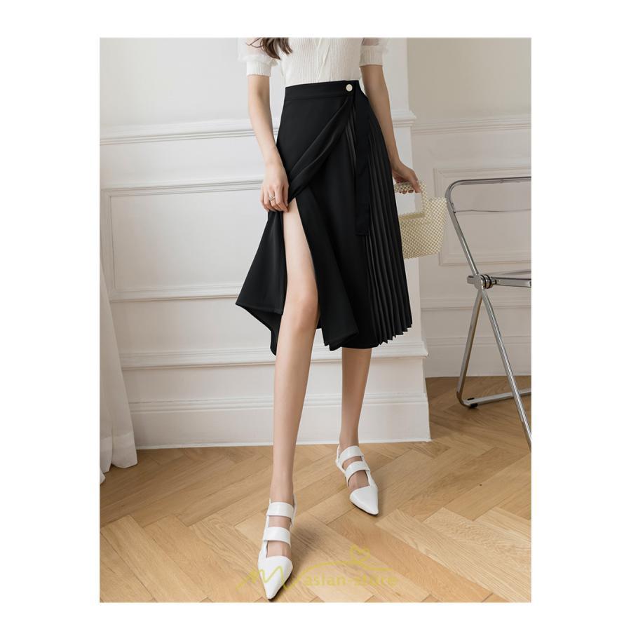 プリーツスカート レトロ ハイウエスト Aライン レース 脚長効果 細見え 黒