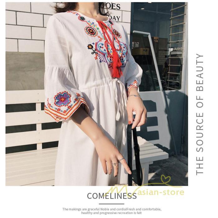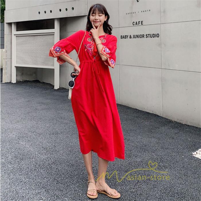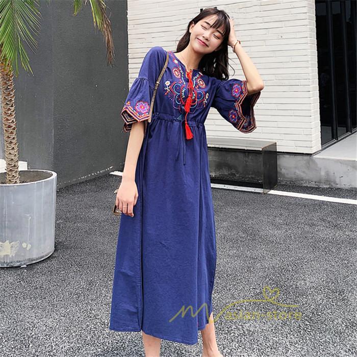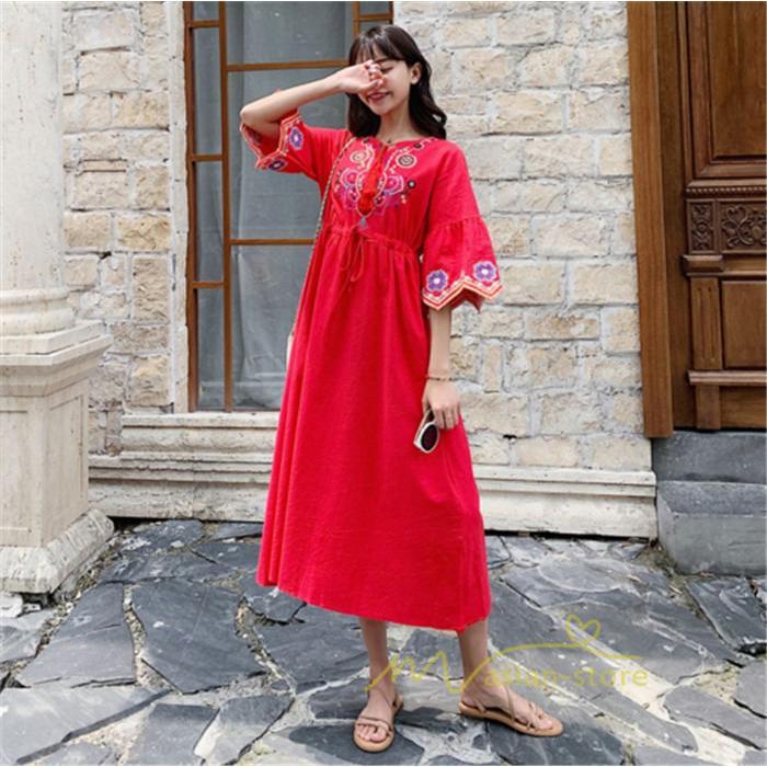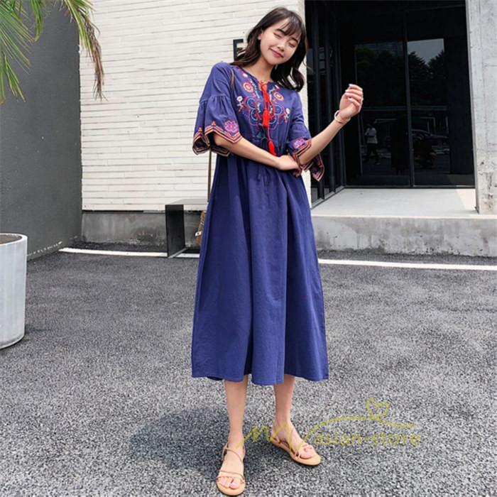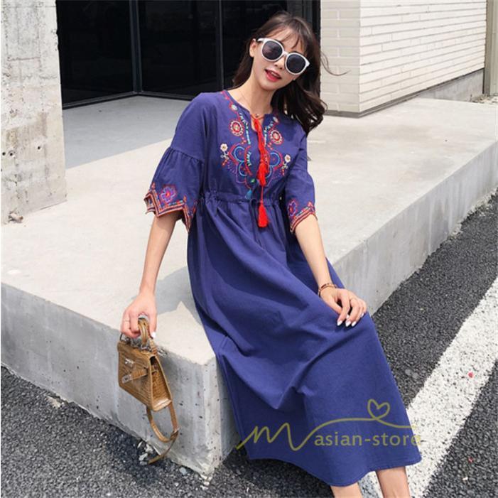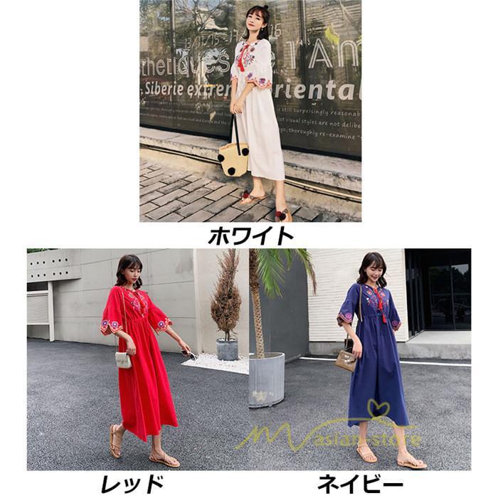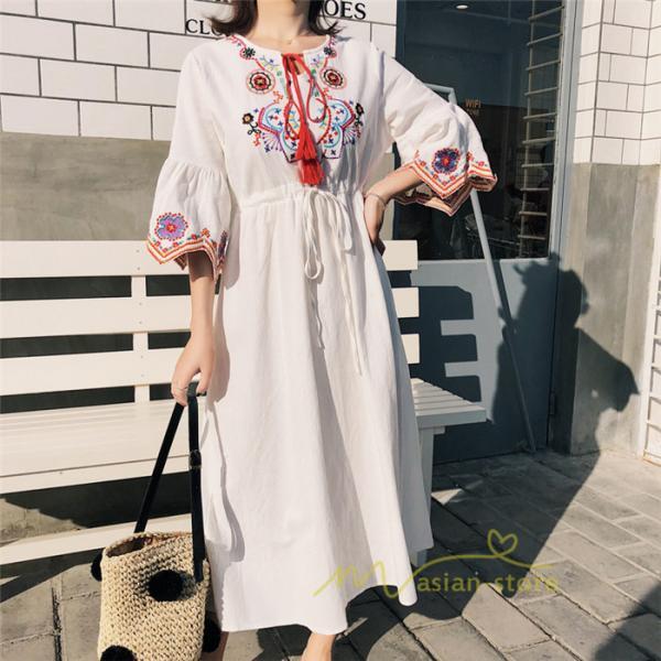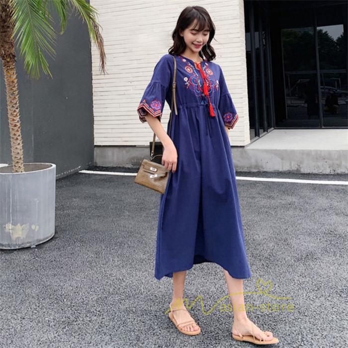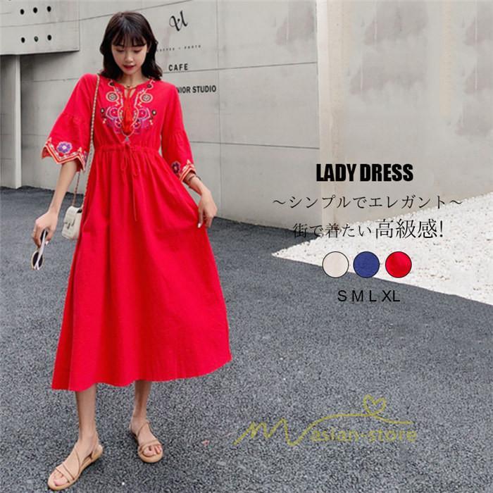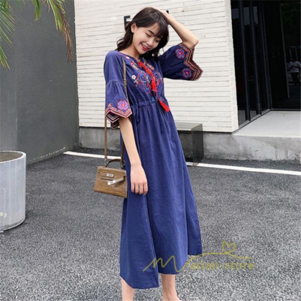マキシ | ワンピース 半袖 夏物 レディース 秋服 綿麻 刺繍 フレアスリーブ ロングワンピース ミモレ丈 五分袖 ウエストゴム 大人 30代40代 Aラインワンピ リボン付き