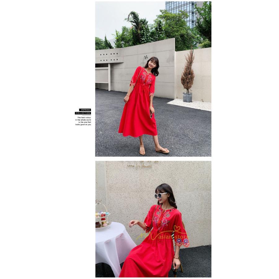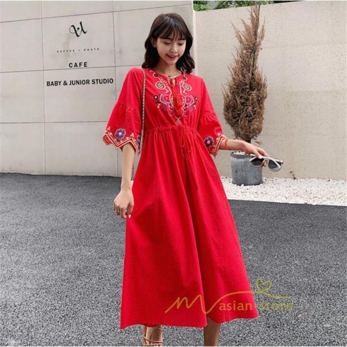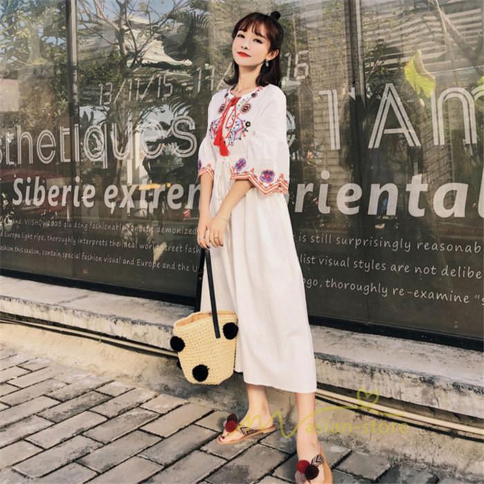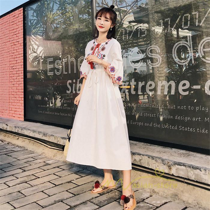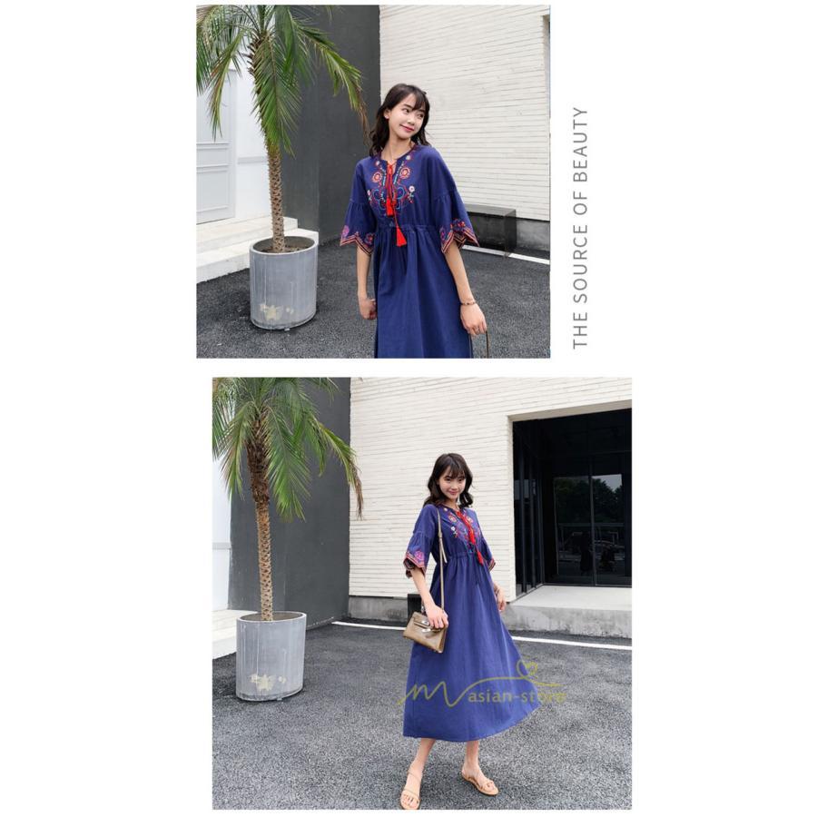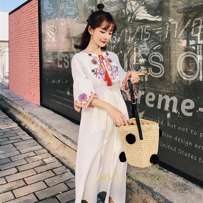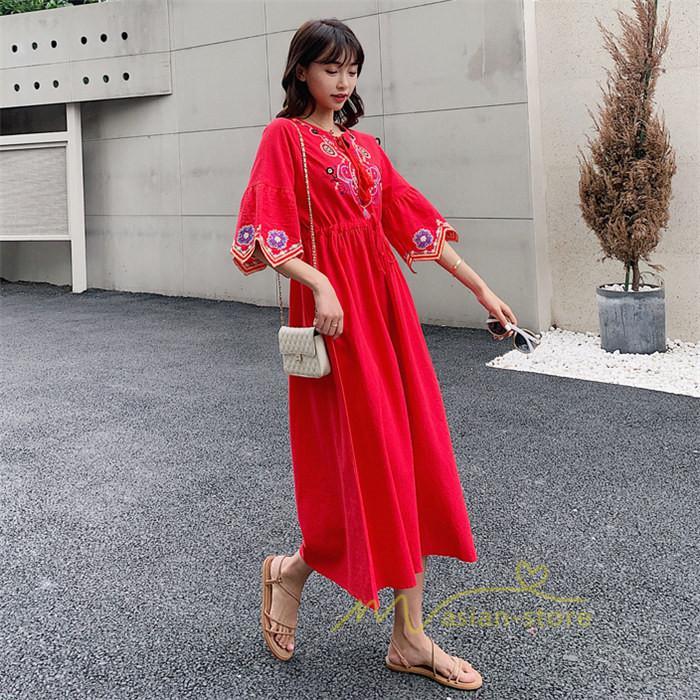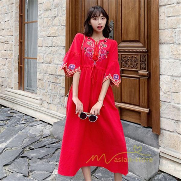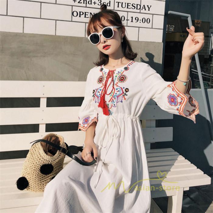 マキシ | ワンピース 半袖 夏物 レディース 秋服 綿麻 刺繍 フレアスリーブ ロングワンピース ミモレ丈 五分袖 ウエストゴム 大人 30代40代 Aラインワンピ リボン付き