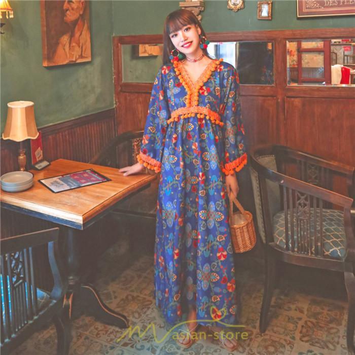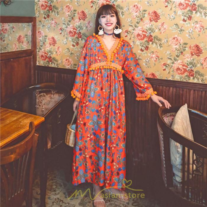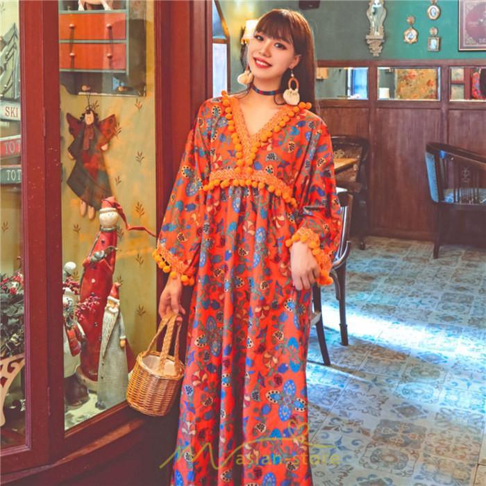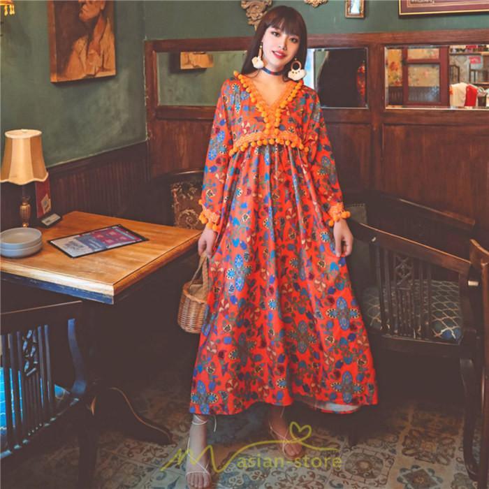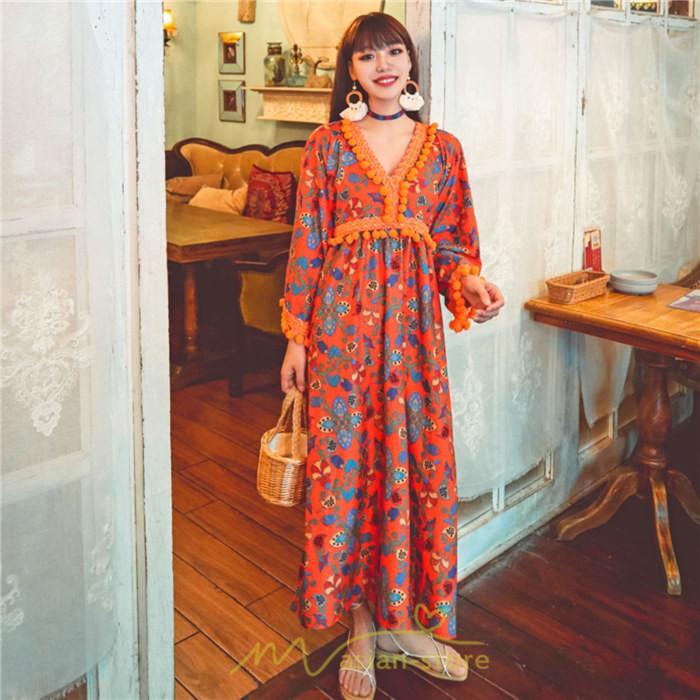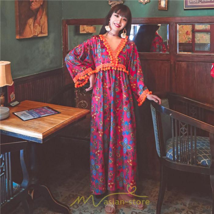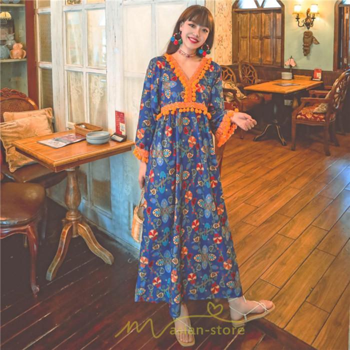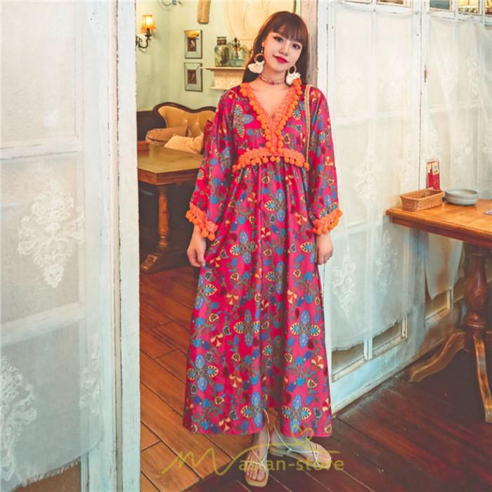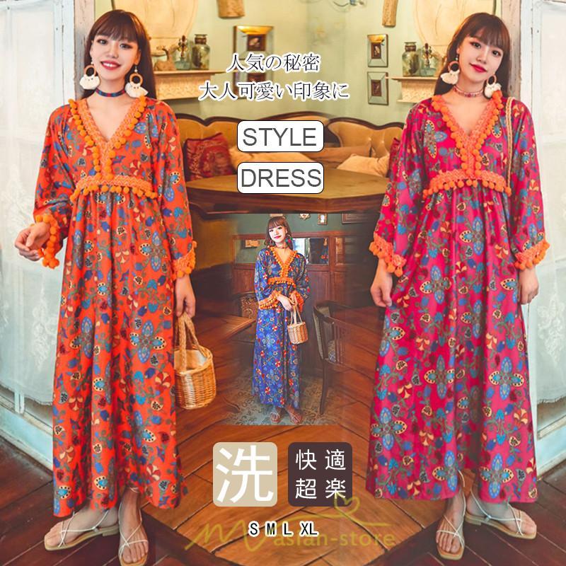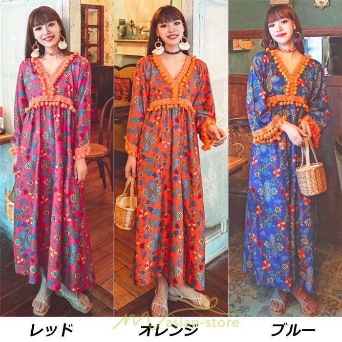 マキシ | ワンピース 長袖 ゆったり 夏秋 レディース 個性的 マキシ丈 楽ちん 体型カバー エスニック 着痩せ 赤 青 オレンジ レトロ 高品質 民族風 20代30代40代 旅行 海