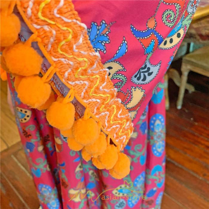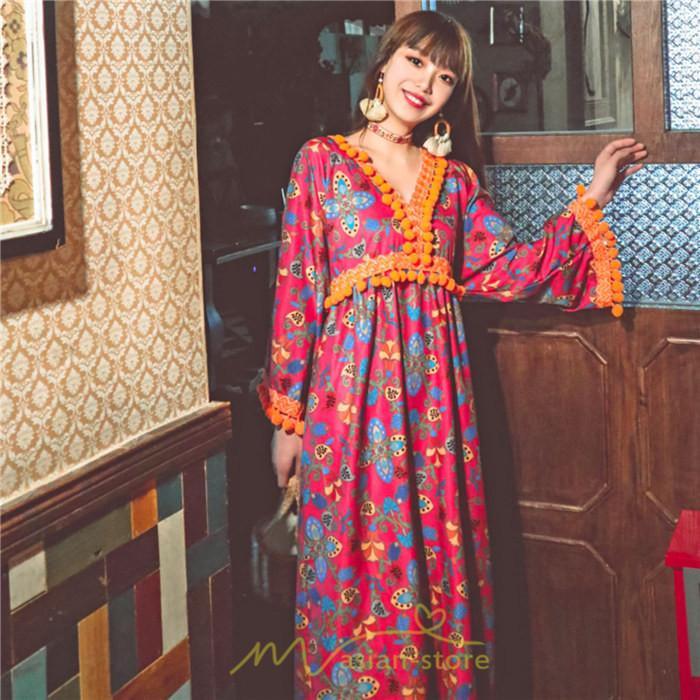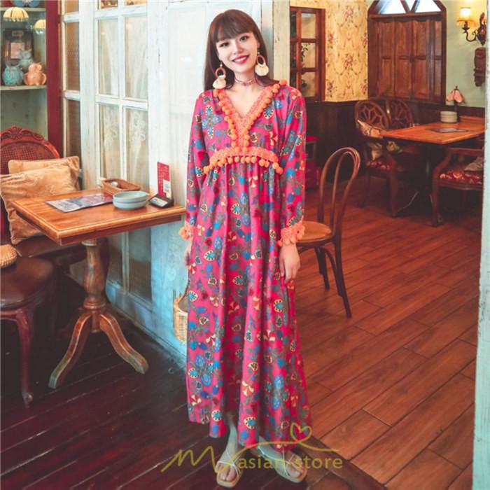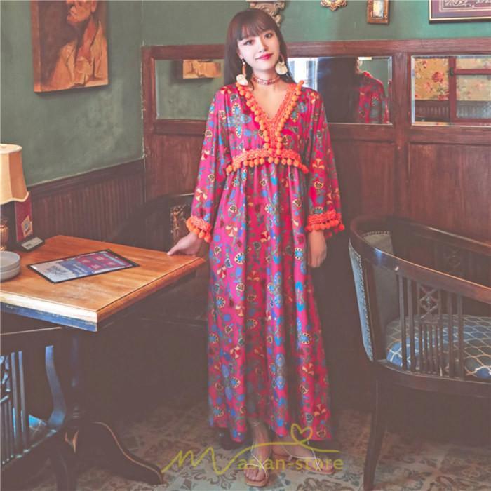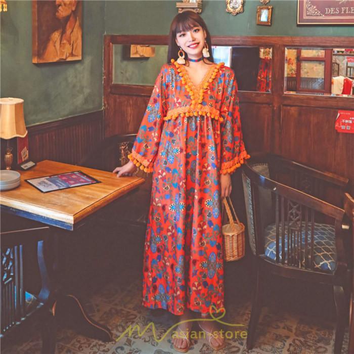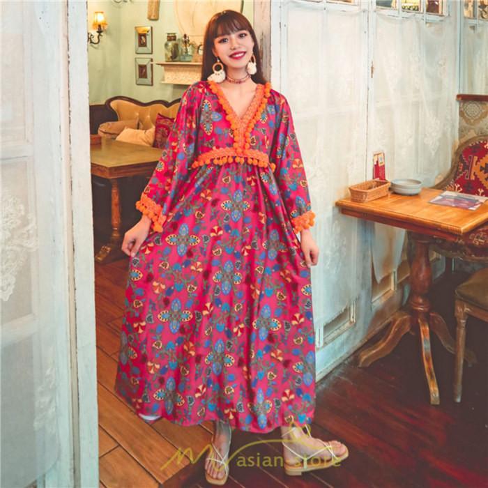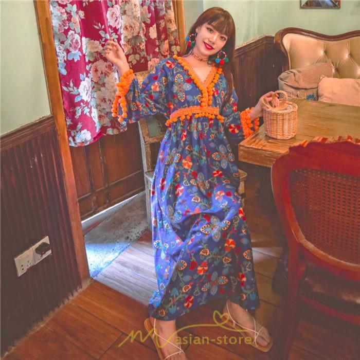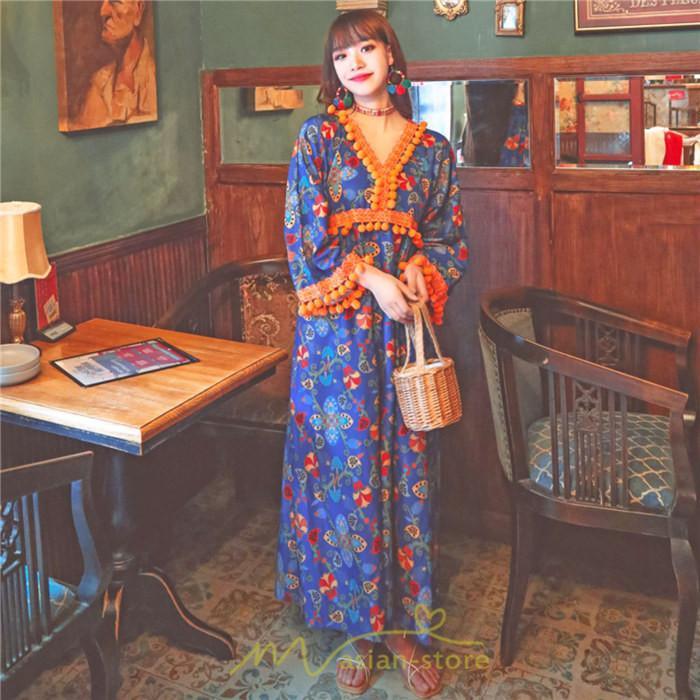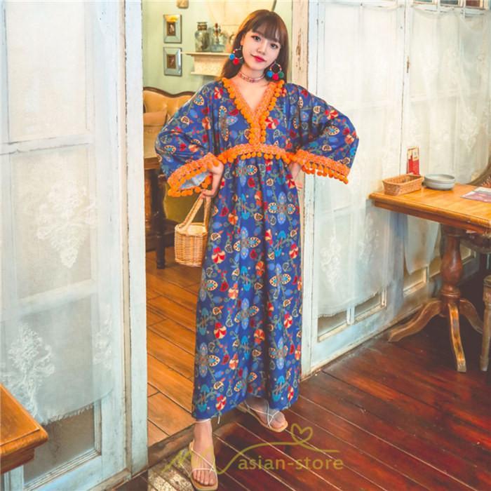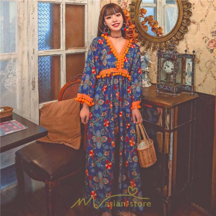 マキシ | ワンピース 長袖 ゆったり 夏秋 レディース 個性的 マキシ丈 楽ちん 体型カバー エスニック 着痩せ 赤 青 オレンジ レトロ 高品質 民族風 20代30代40代 旅行 海