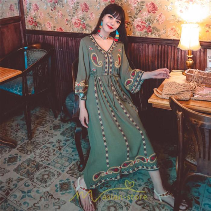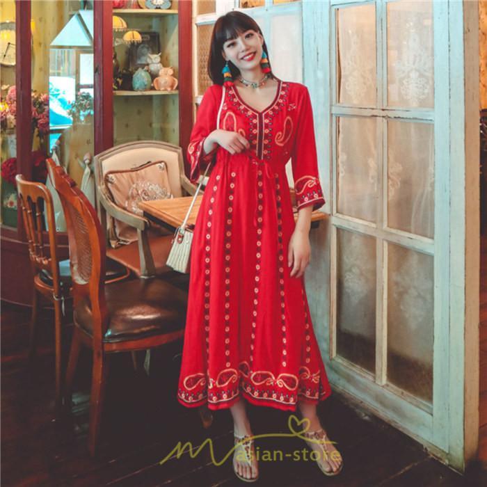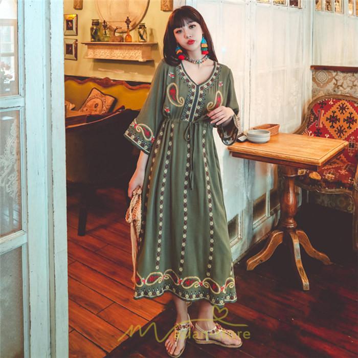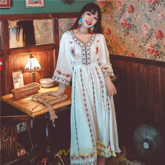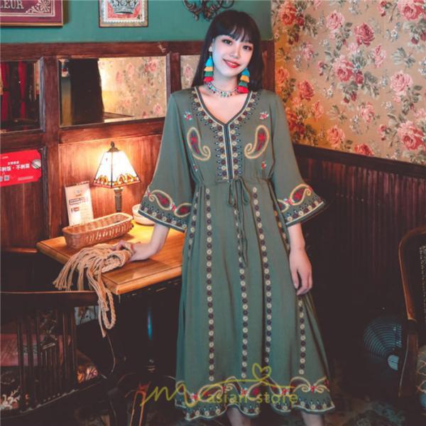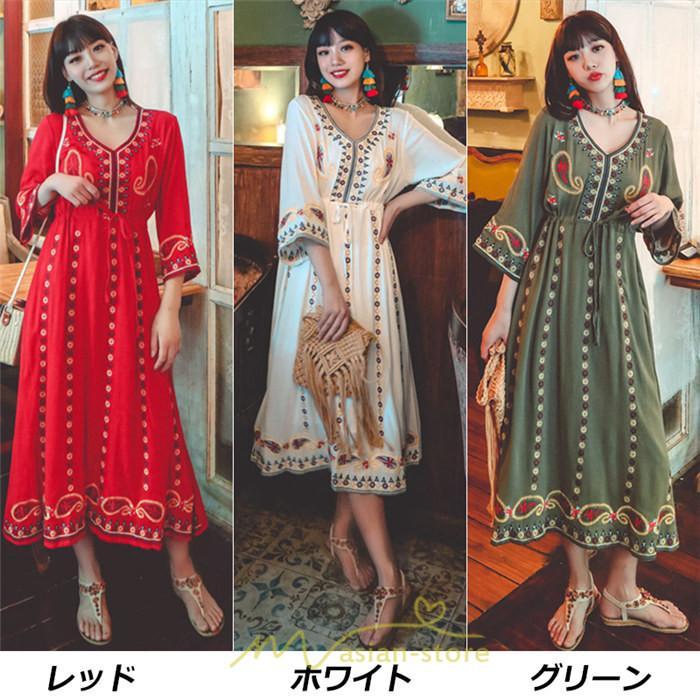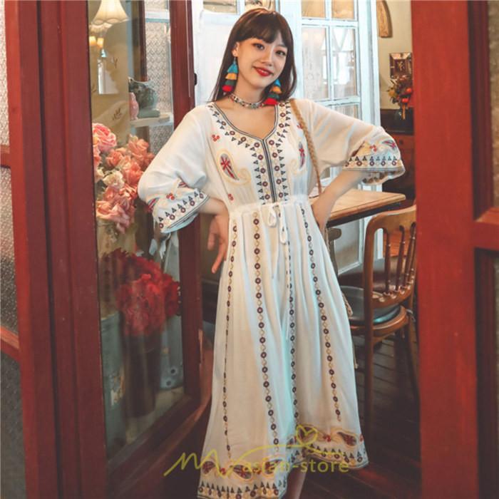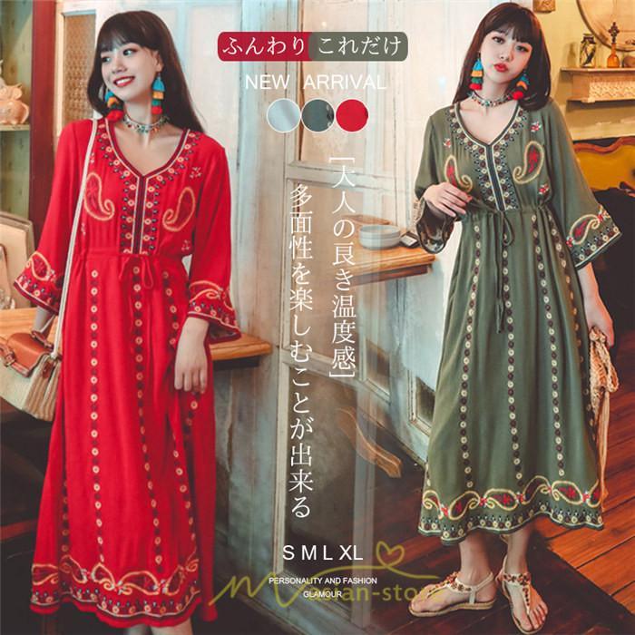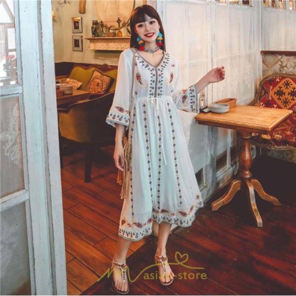 七分袖ワンピース Vネック マキシ丈 ロング丈 エスニック ボヘミアン 綿麻