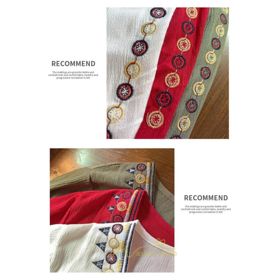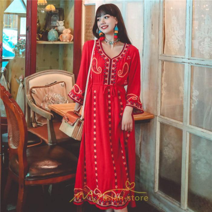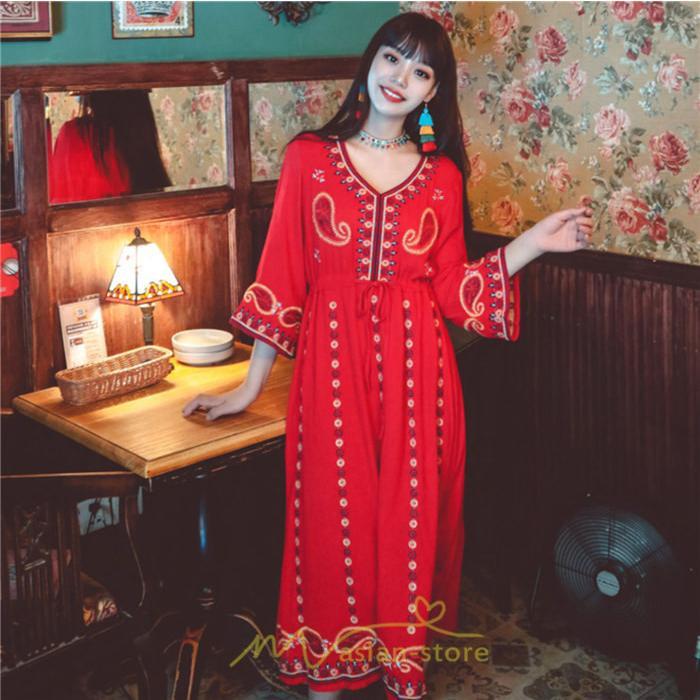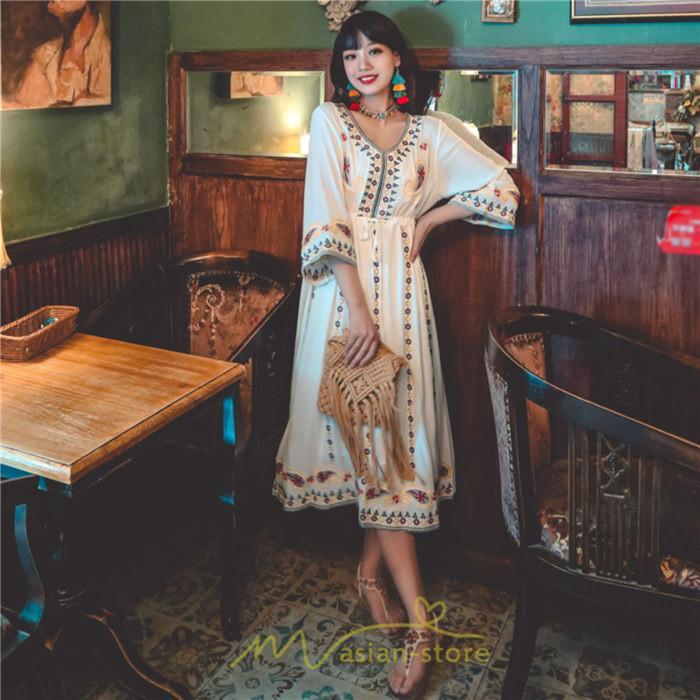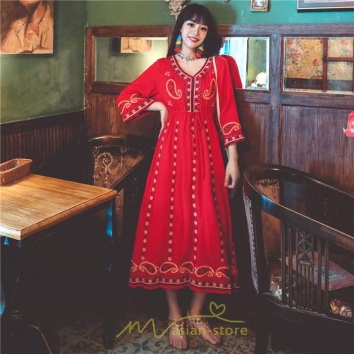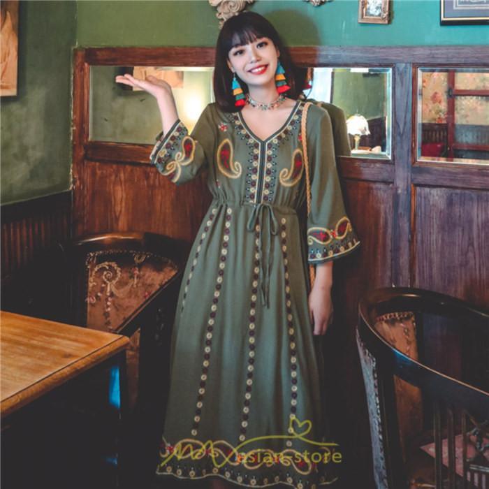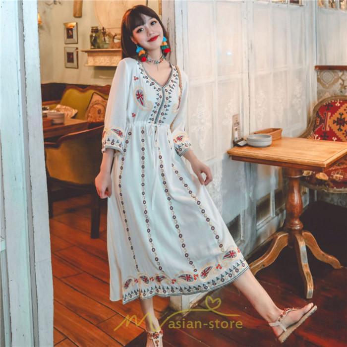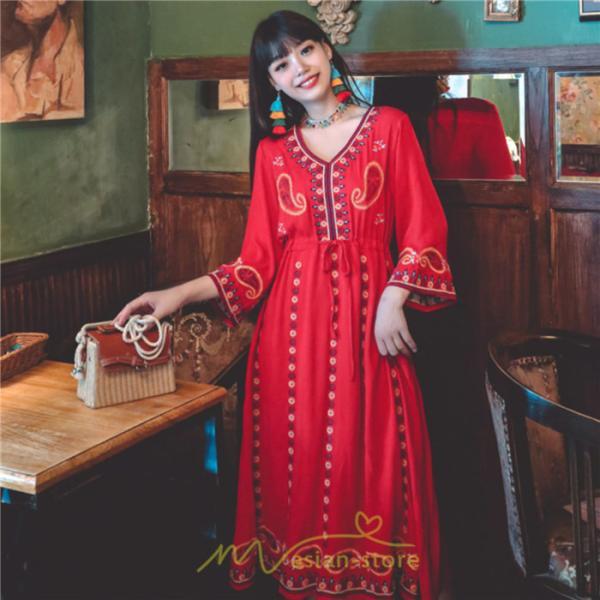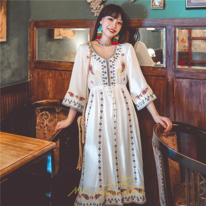 七分袖ワンピース Vネック マキシ丈 ロング丈 エスニック ボヘミアン 綿麻