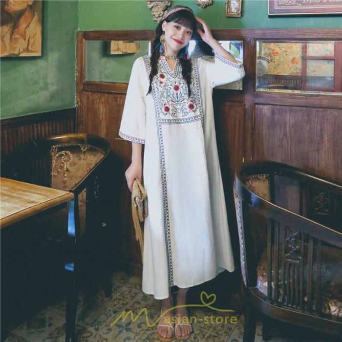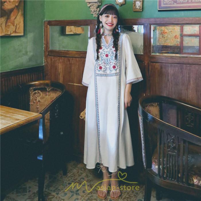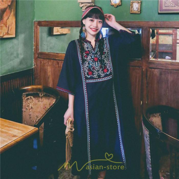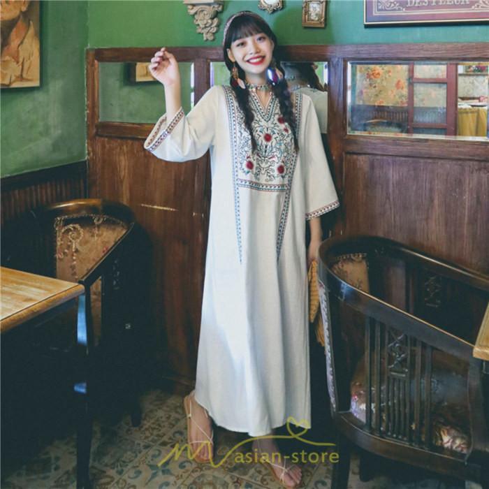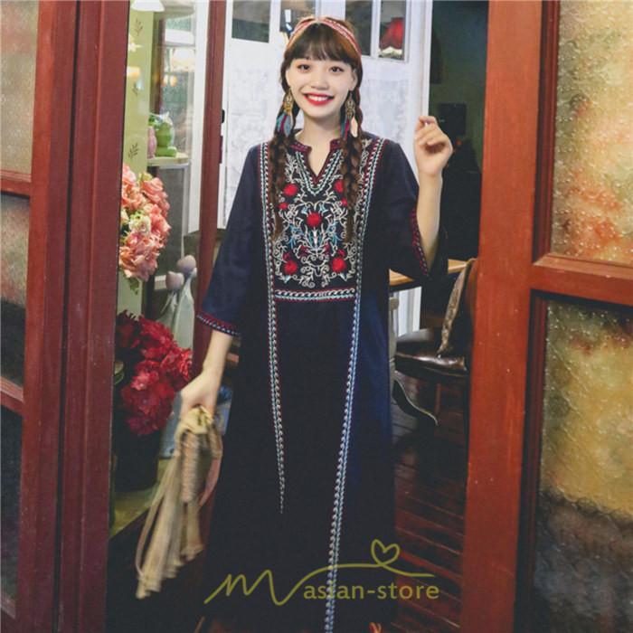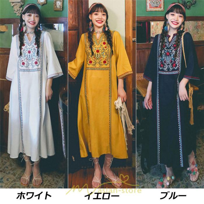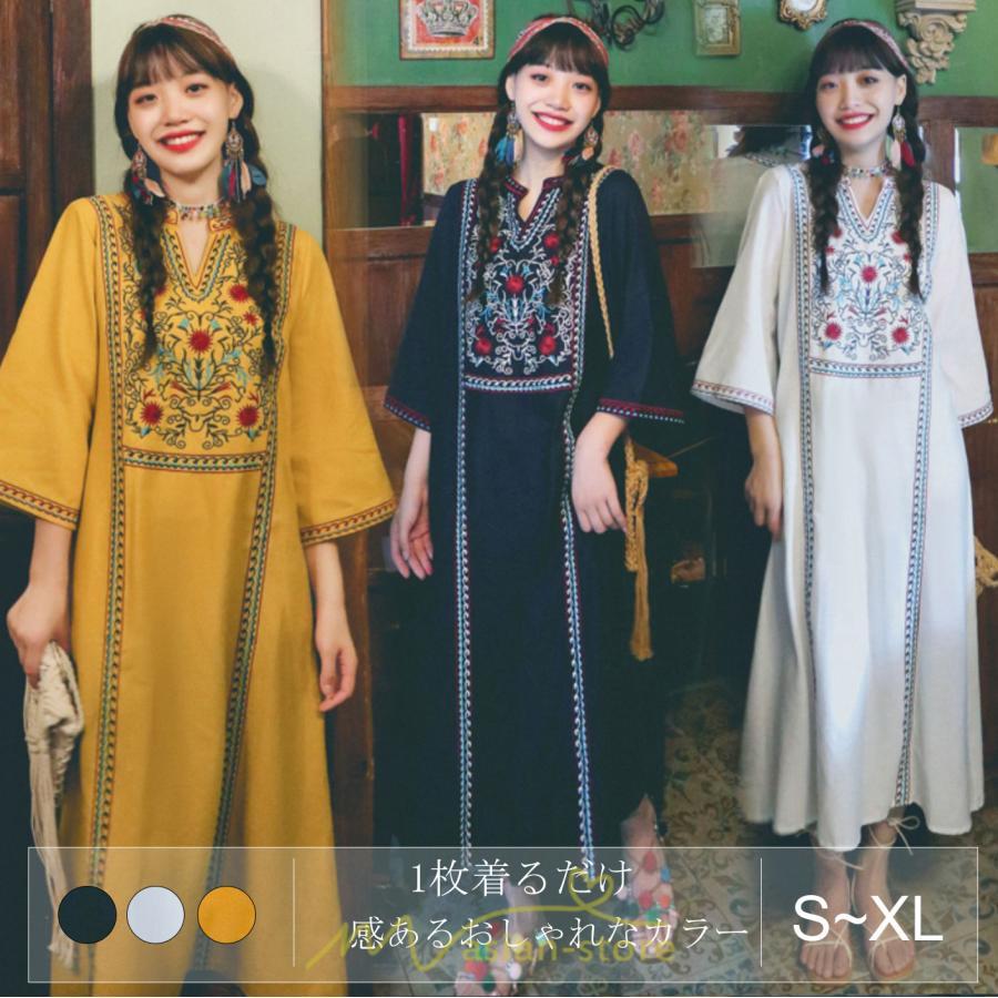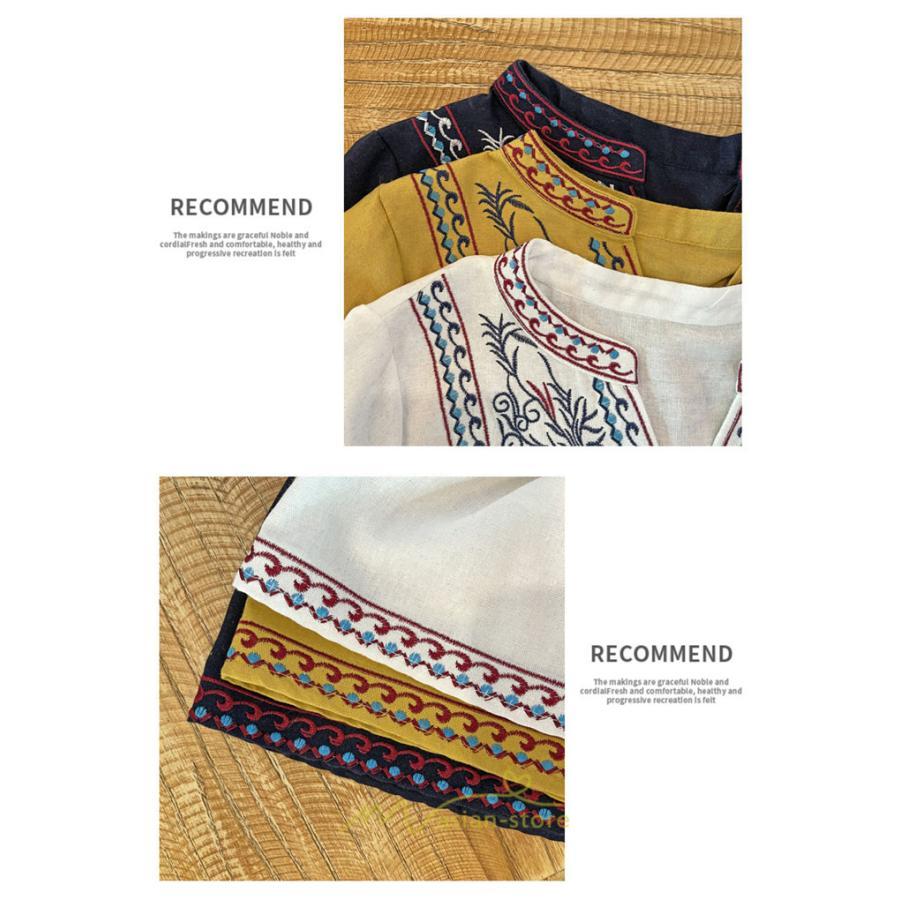 七分袖 綿麻 Aライン 休み 旅行 刺繍 上品