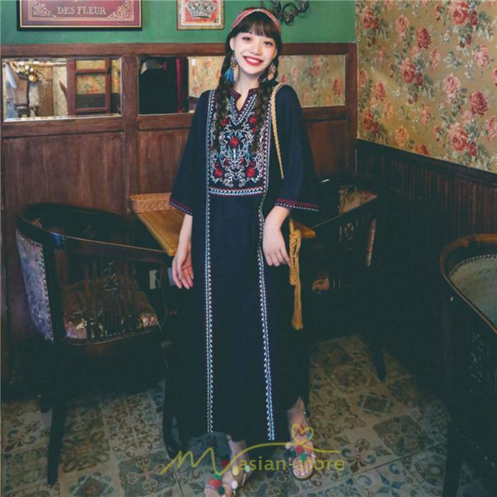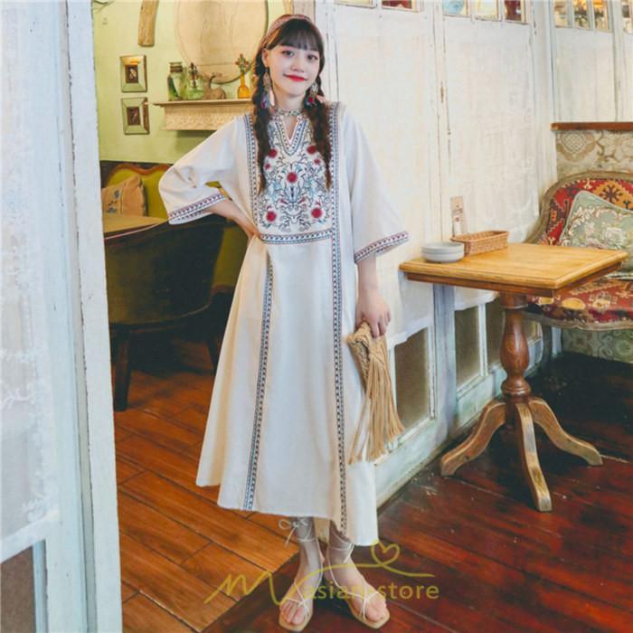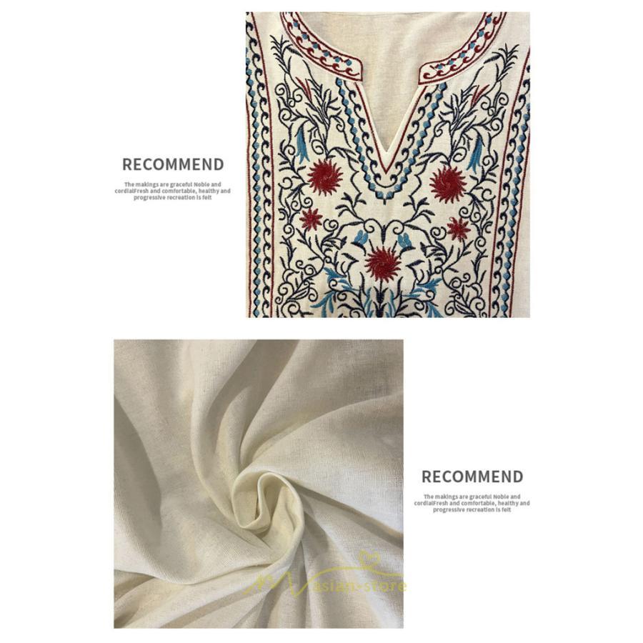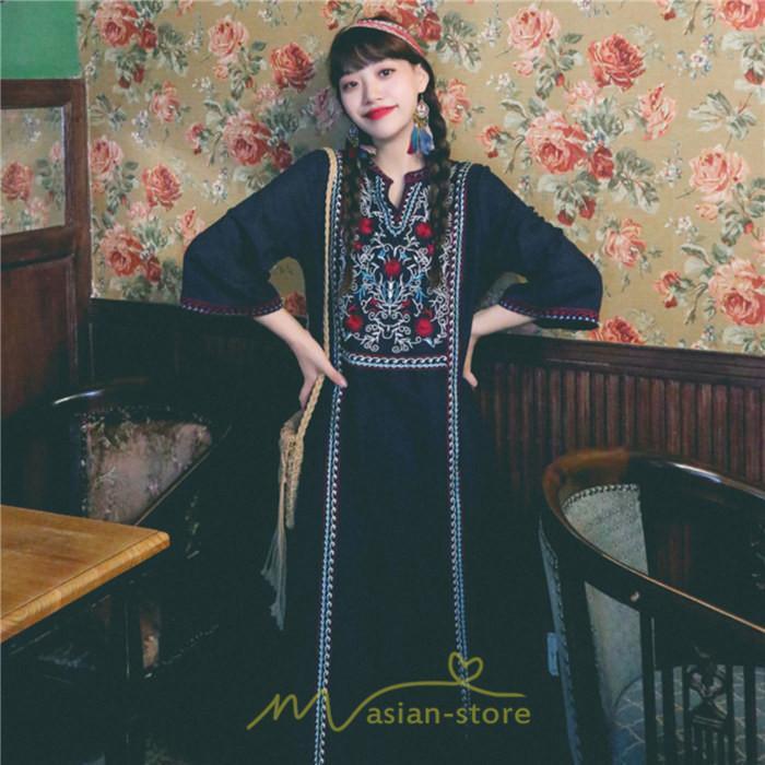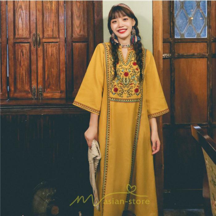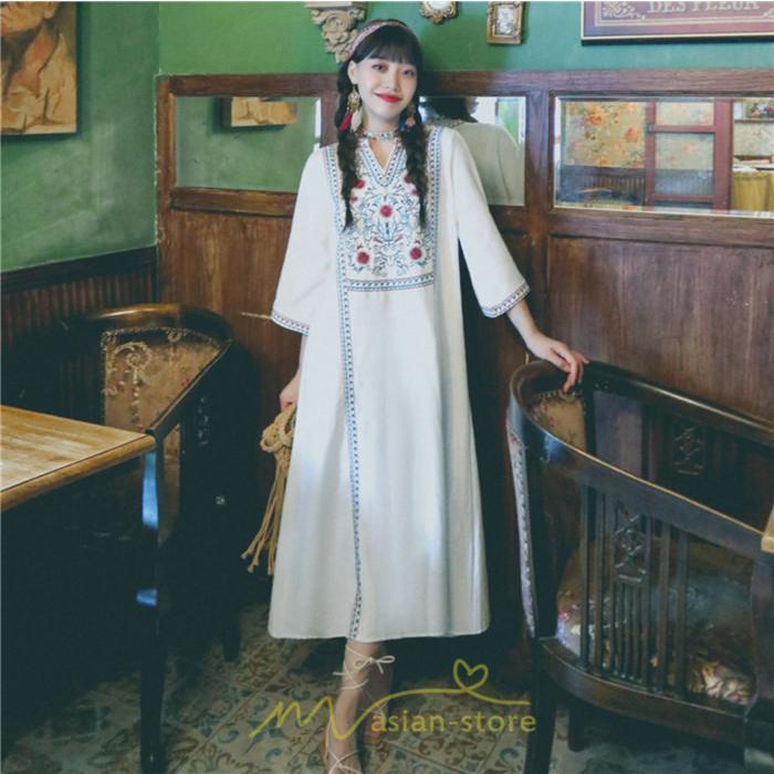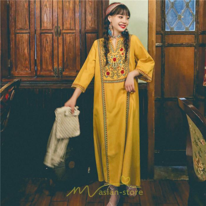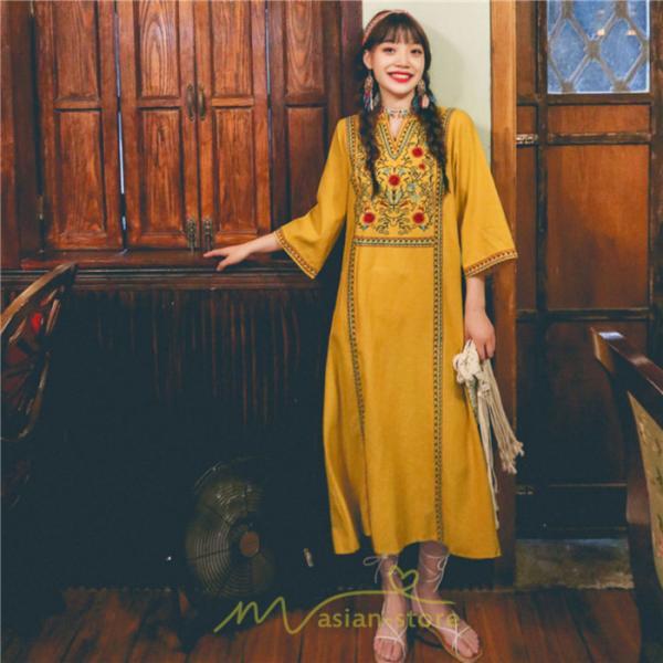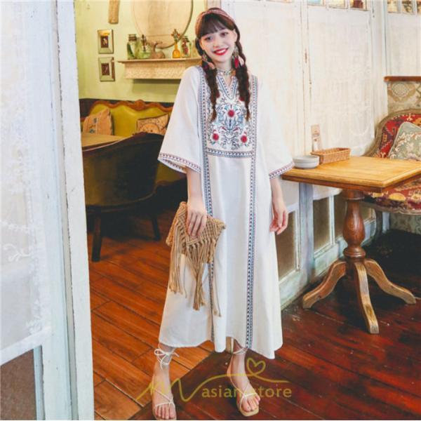 七分袖 綿麻 Aライン 休み 旅行 刺繍 上品