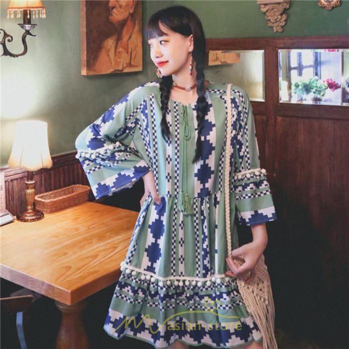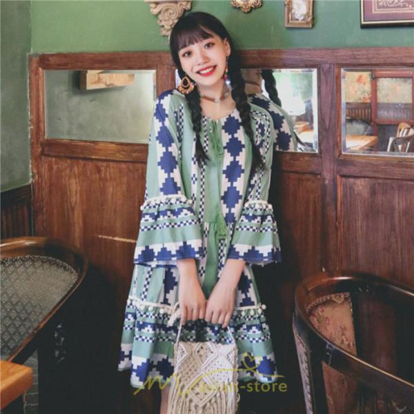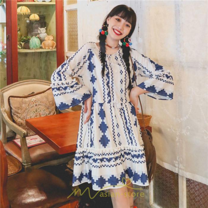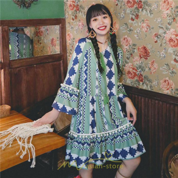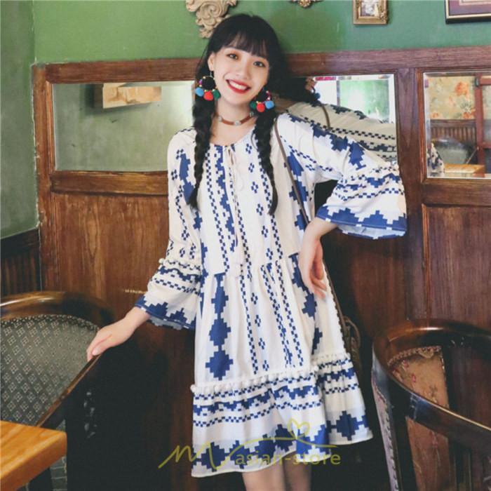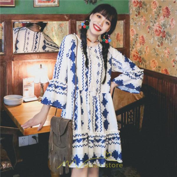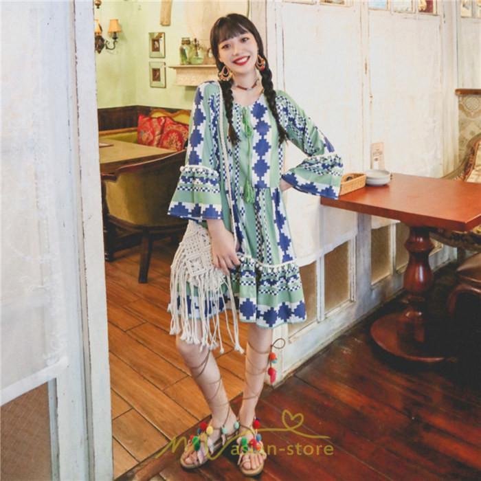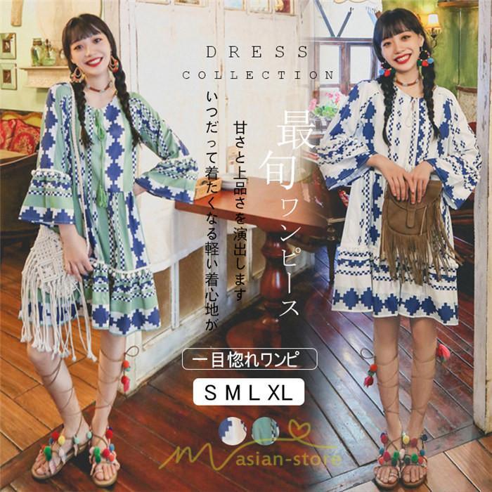 ワンピース 夏秋 レディース 長袖 綿麻 ひざ上 ミニ かわいい リゾート 休み 旅行 お出かけ 華やか 民族風 エスニック風 vネック 鎖骨 ゆったり 着痩せ 幾何学柄