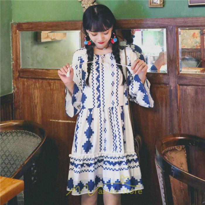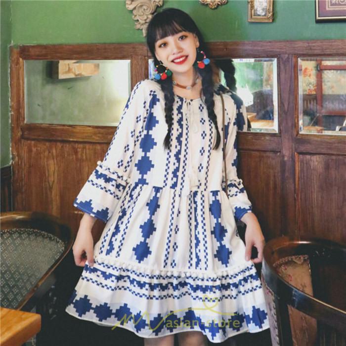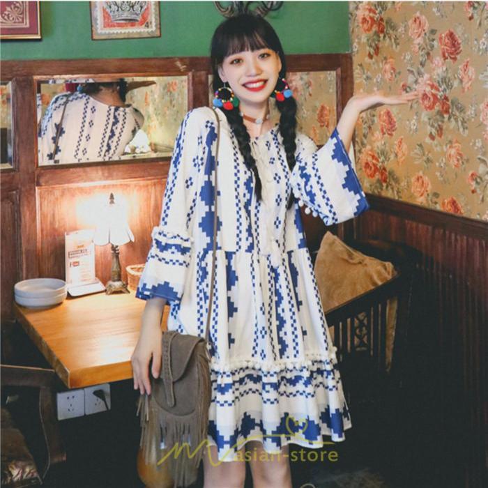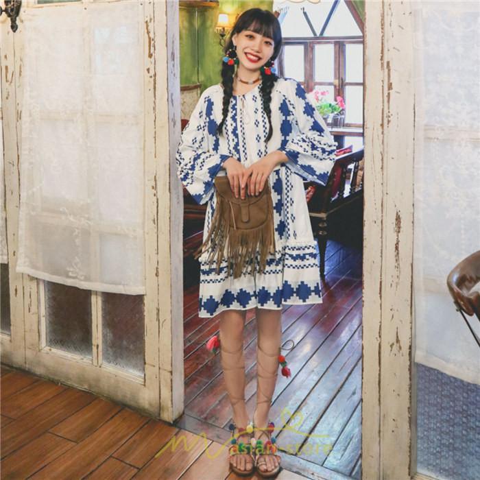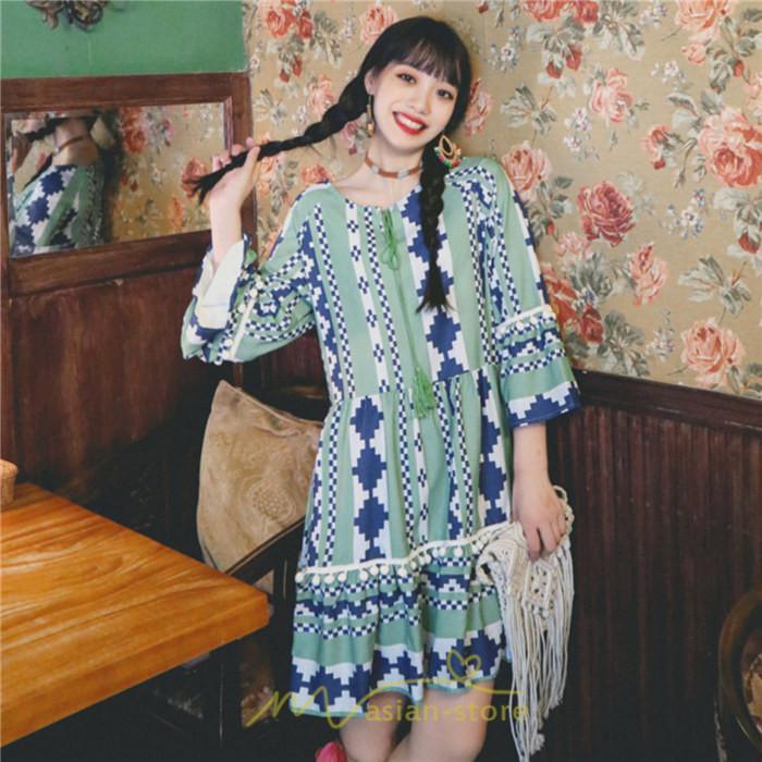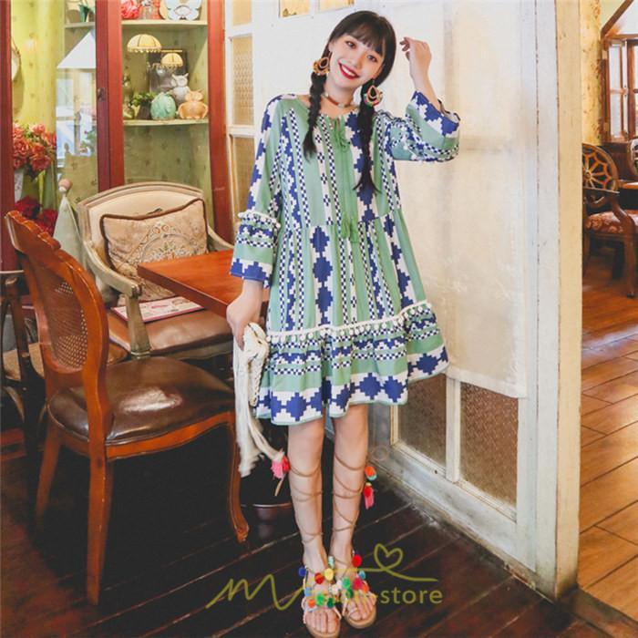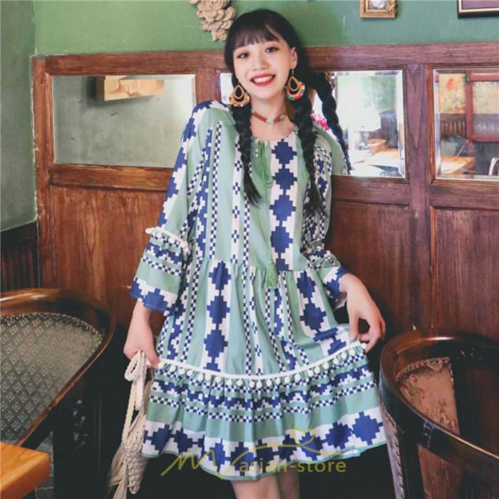 ワンピース 夏秋 レディース 長袖 綿麻 ひざ上 ミニ かわいい リゾート 休み 旅行 お出かけ 華やか 民族風 エスニック風 vネック 鎖骨 ゆったり 着痩せ 幾何学柄