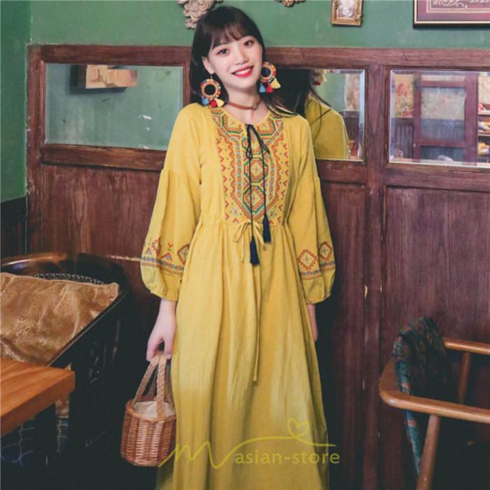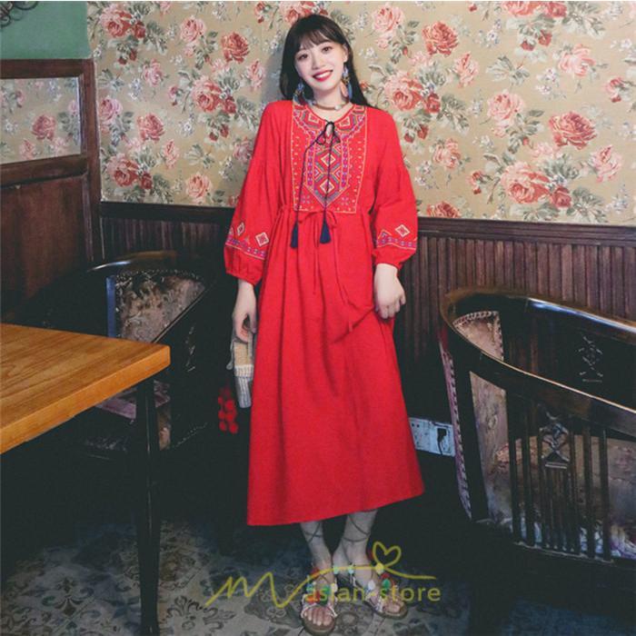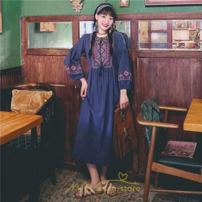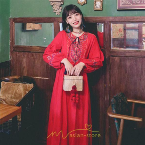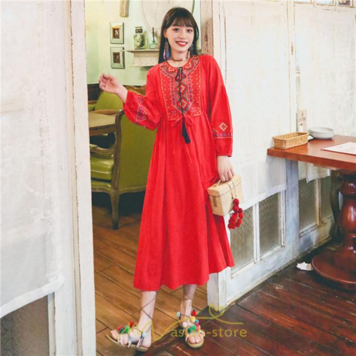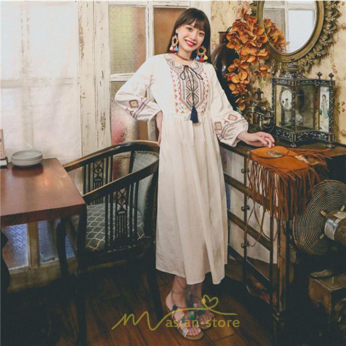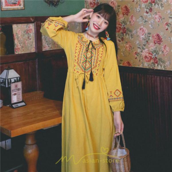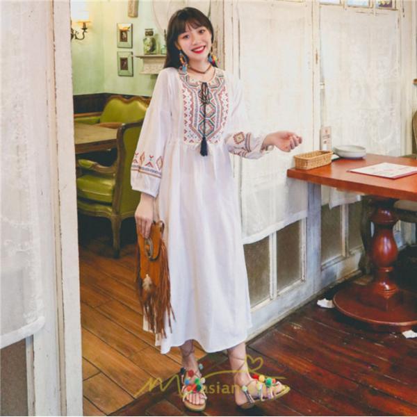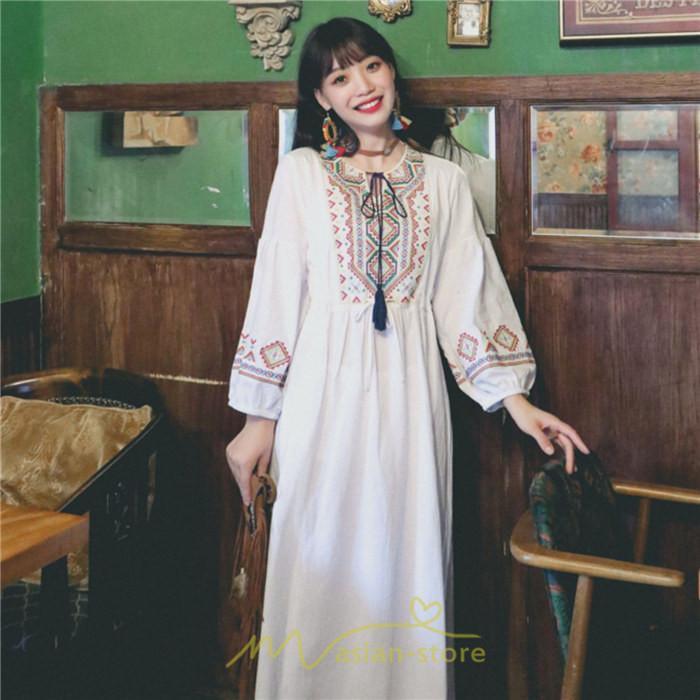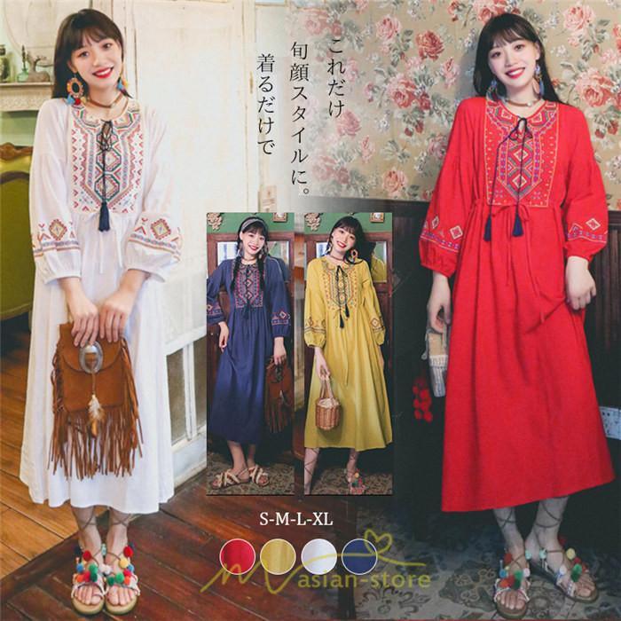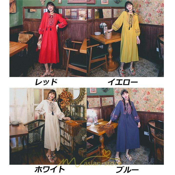 マキシ | ワンピース レディース 刺繍 綿麻 レトロ調 インスタ映え ナチュラル エスニック風 民族風 ボヘミアン 撮影 リゾート 柔らかい ウエストリボン長袖 イベント
