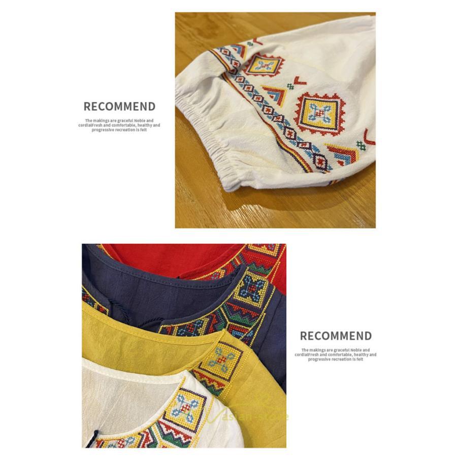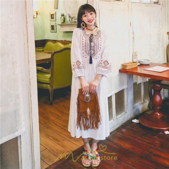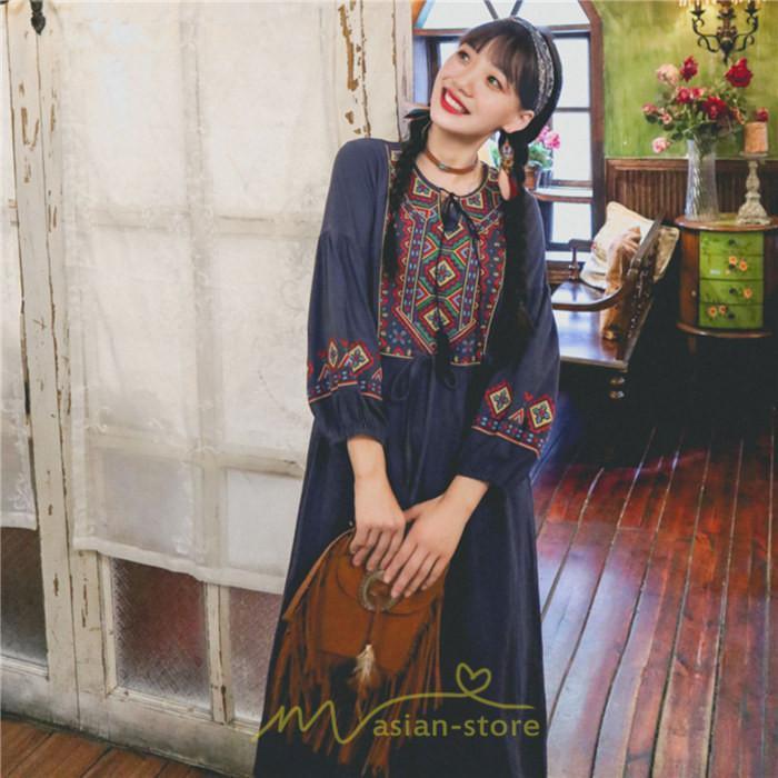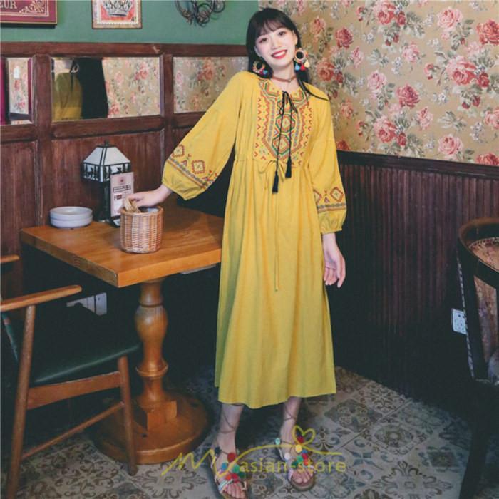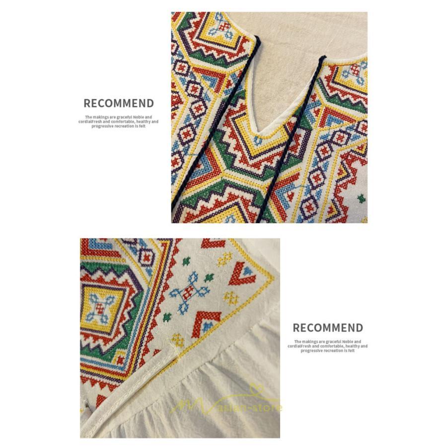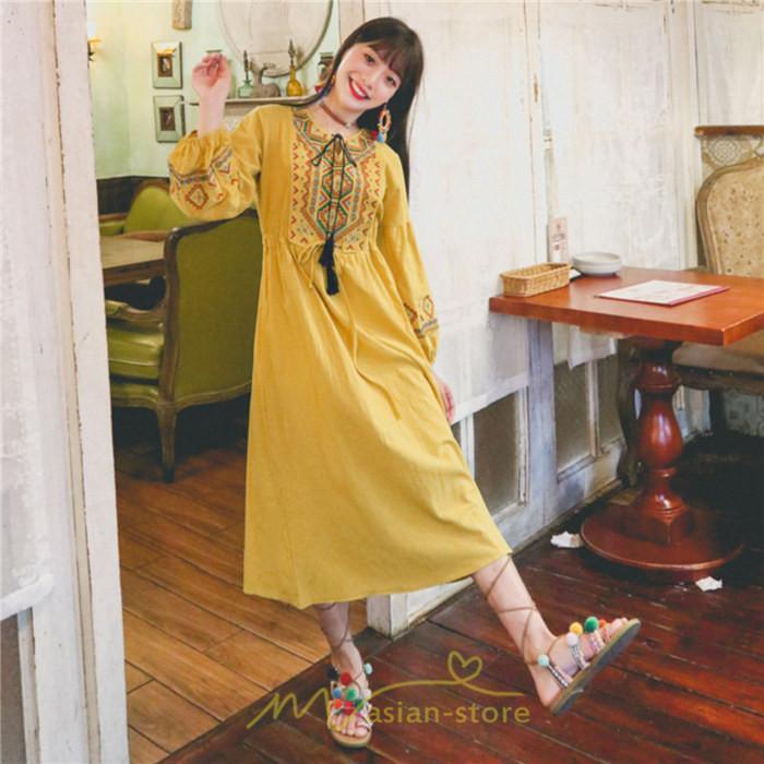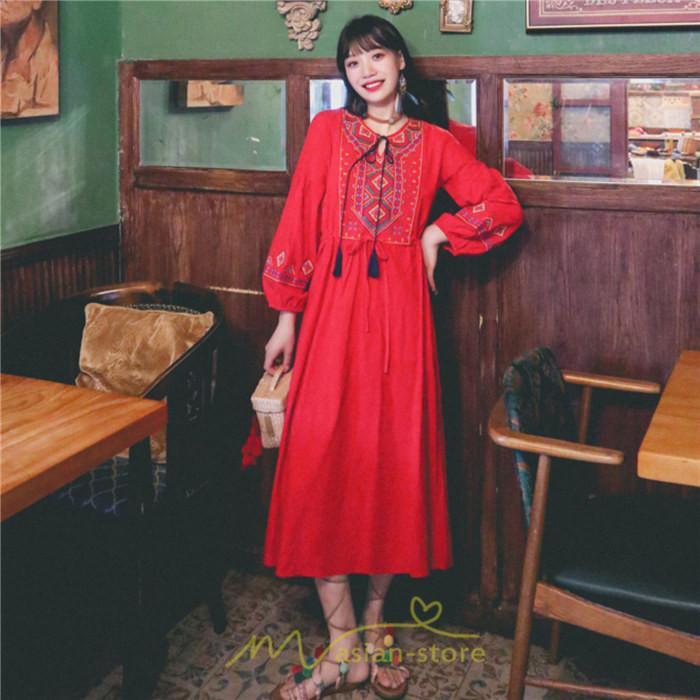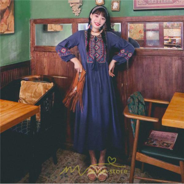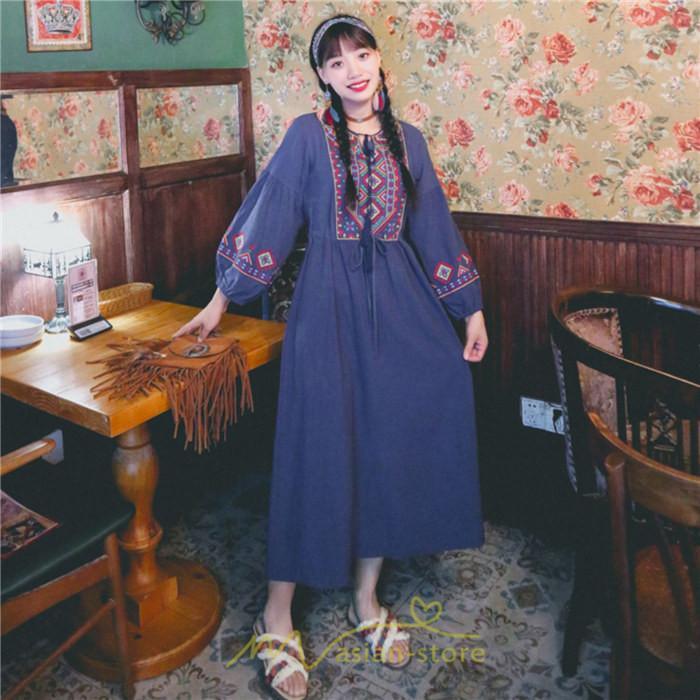 マキシ | ワンピース レディース 刺繍 綿麻 レトロ調 インスタ映え ナチュラル エスニック風 民族風 ボヘミアン 撮影 リゾート 柔らかい ウエストリボン長袖 イベント