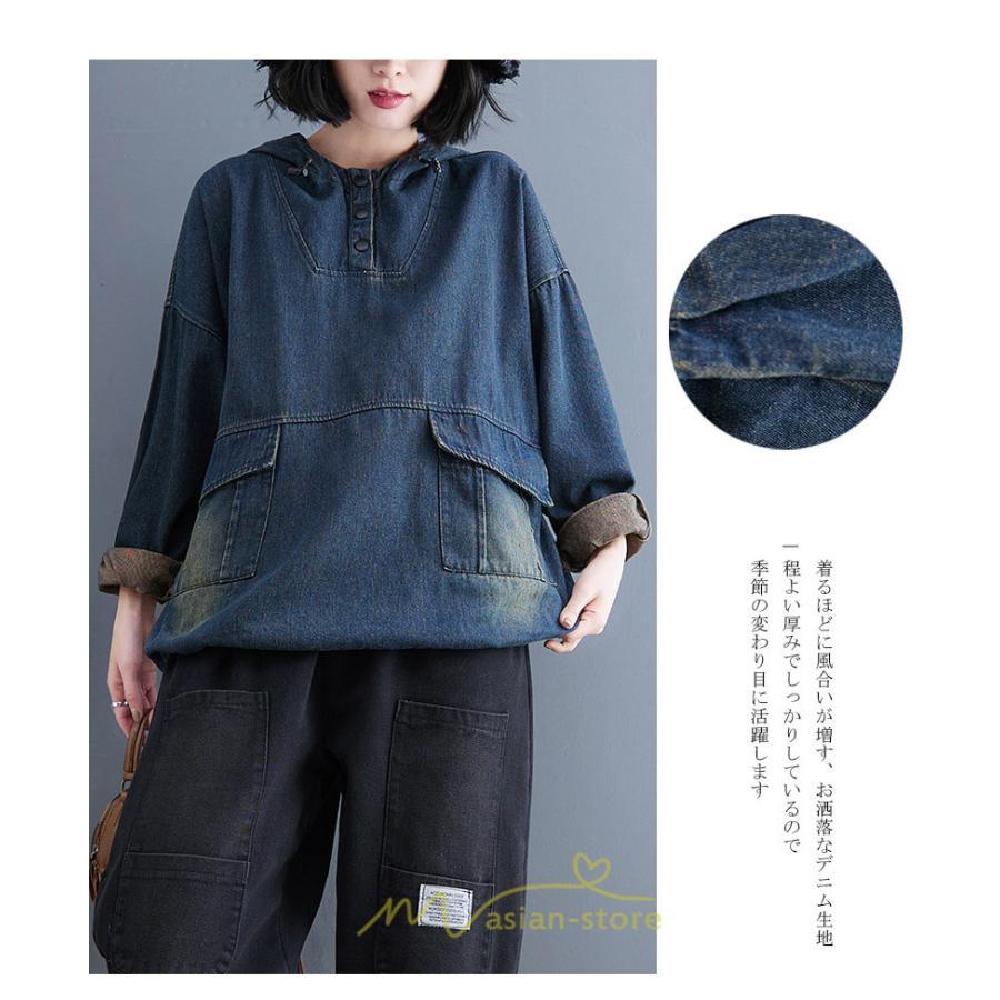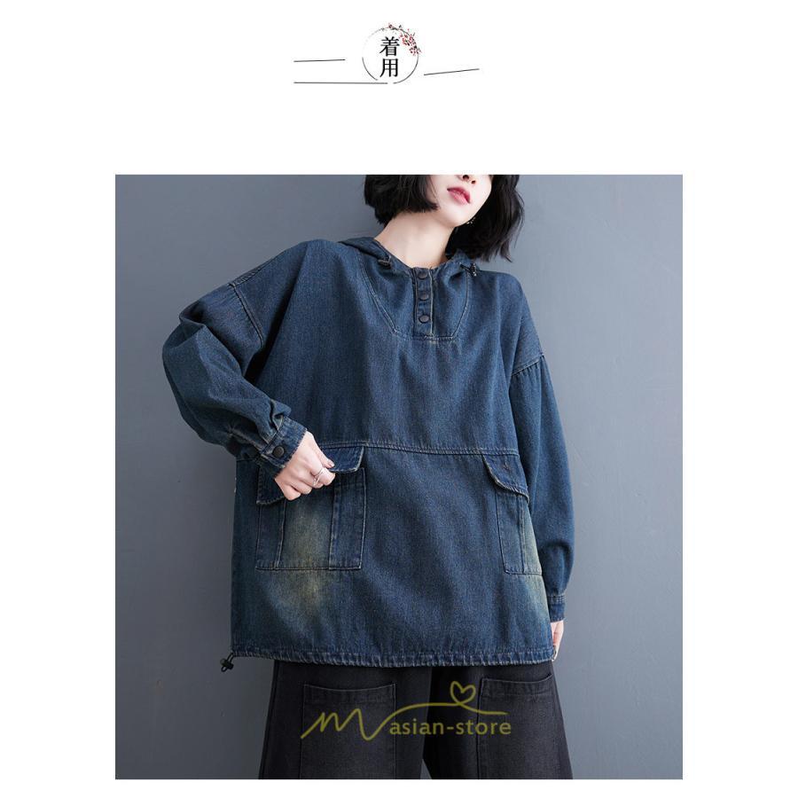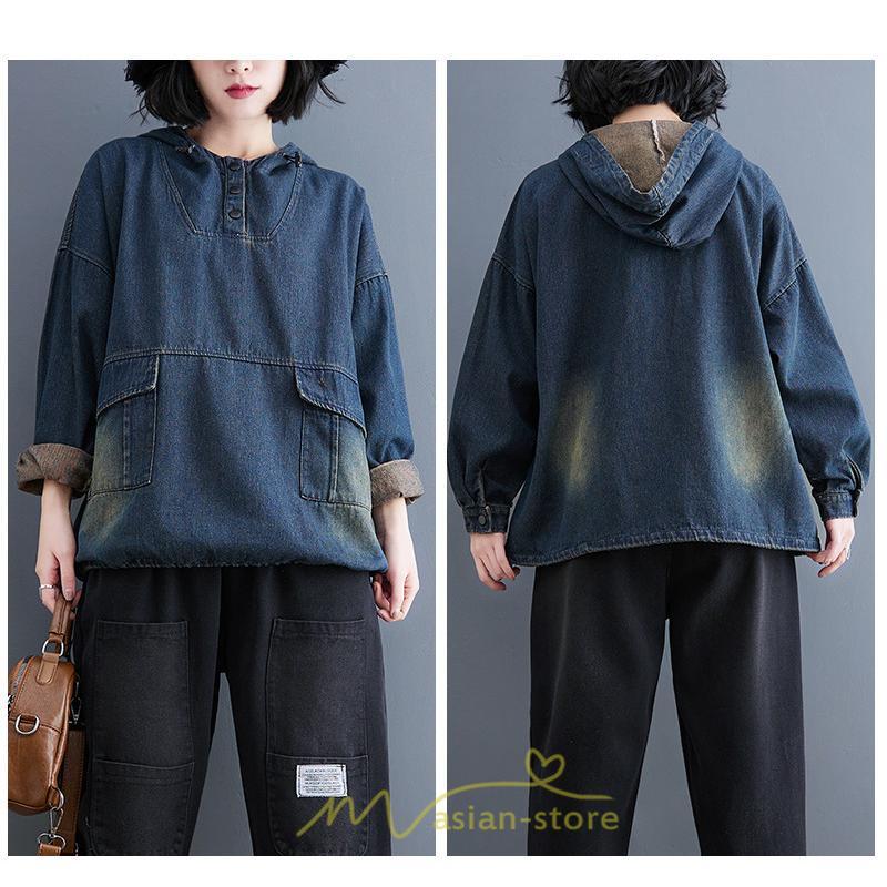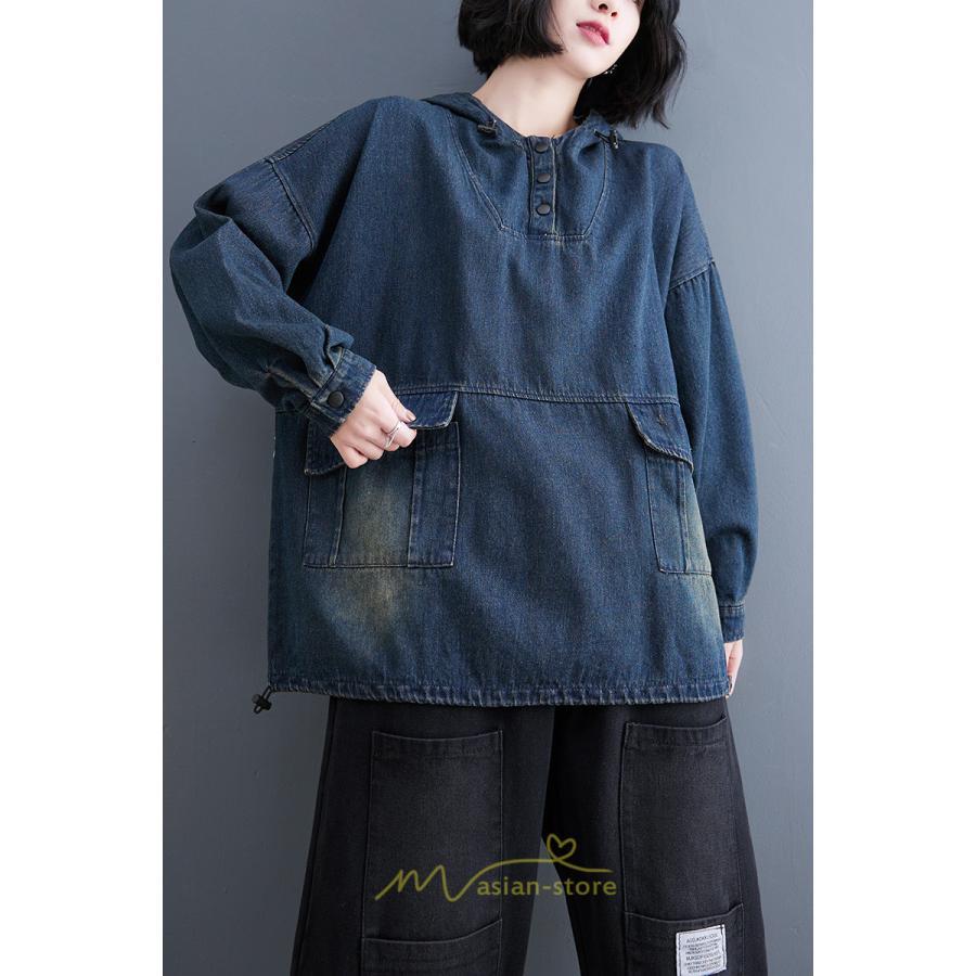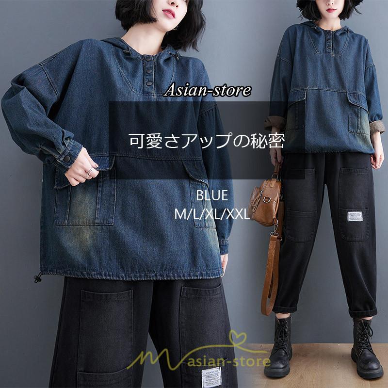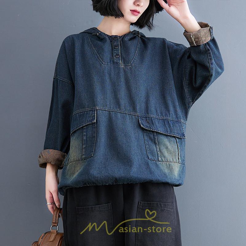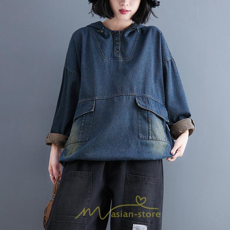 シャツ・ブラウス | デニムシャツ レディース長袖 トップス ブラウス ブルー 春 秋 カジュアル シャツ おしゃれ 可愛い マタニティ フード カジュアル 大きいサイズ 送料無料