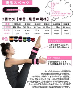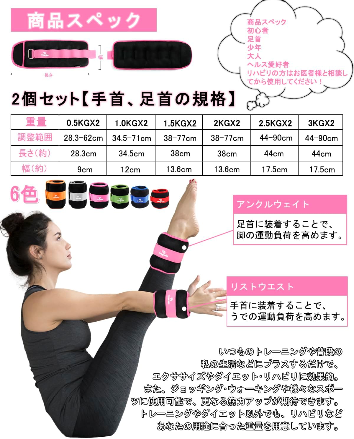 - 【仕様】アンクルウェイト重量:0.5kg×2個、1.0kg×2個、1.5kg×2個、2.0kg×2個、2.5kg×2個、3.0kg×2個。素材:生地(ネオプレン)、マジック部分(ナイロン)、中身(極小鉄玉)。※商品は2個セットでの販売となります。