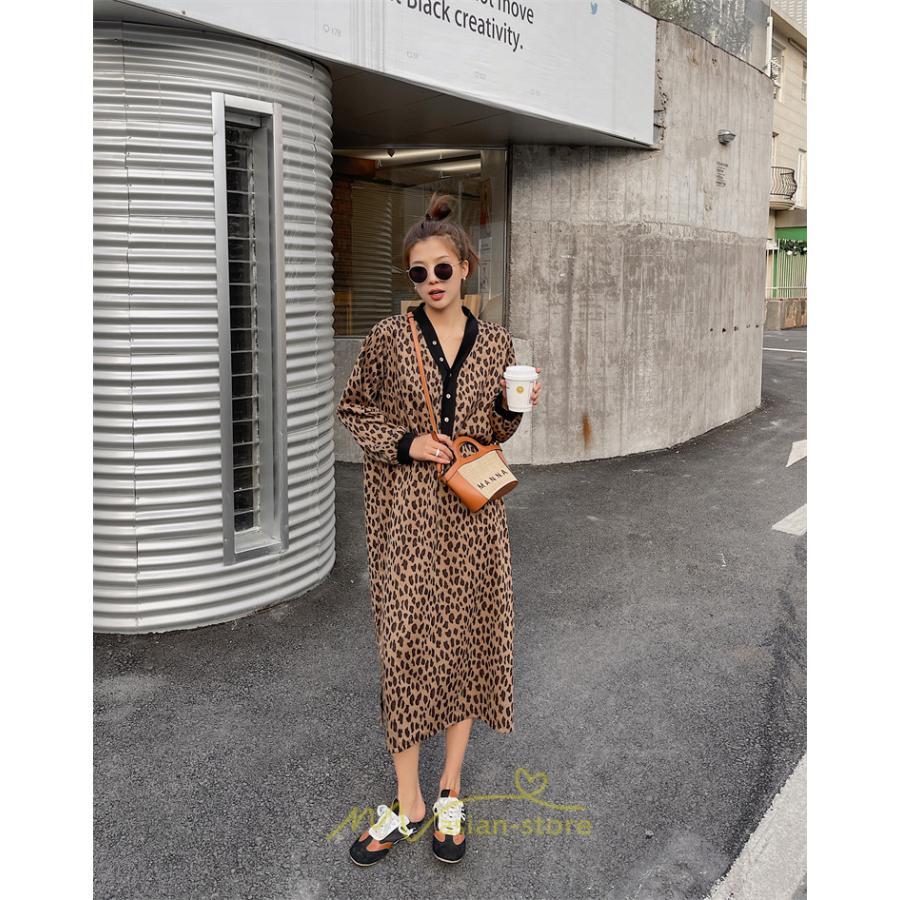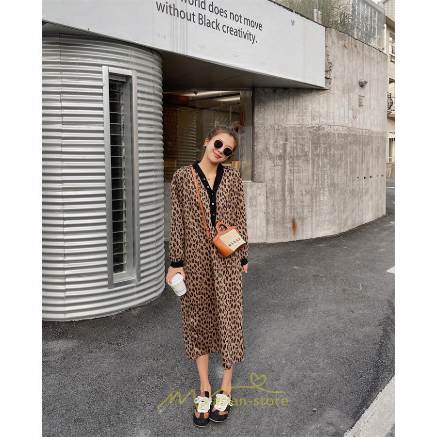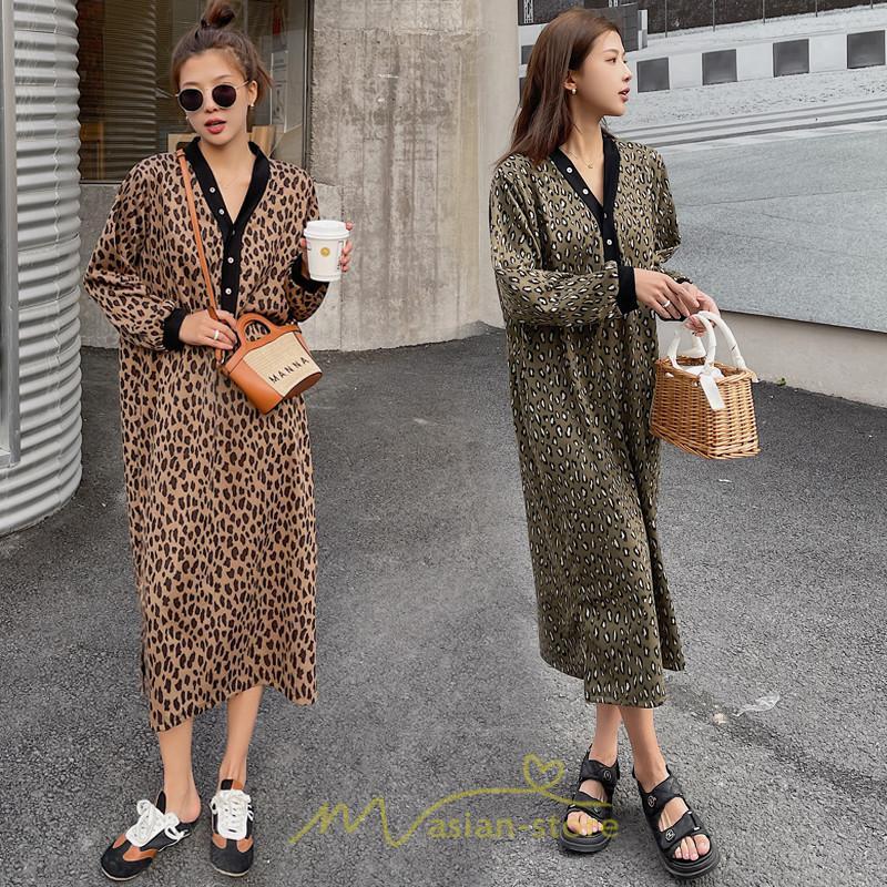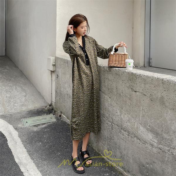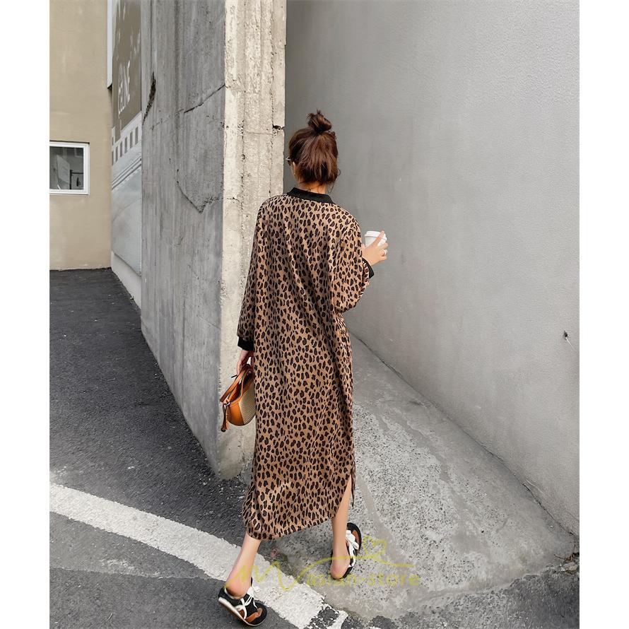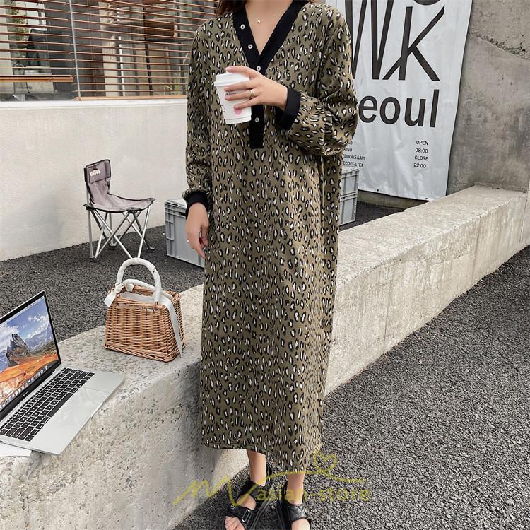 マキシ | レオパードワンピース 秋 レディース ヒョウ柄 Vネック ワンピース ロングワンピース 長袖ワンピース 大人 ゆったり 裾スリット 秋冬 30代40代50代 大きいサイズ