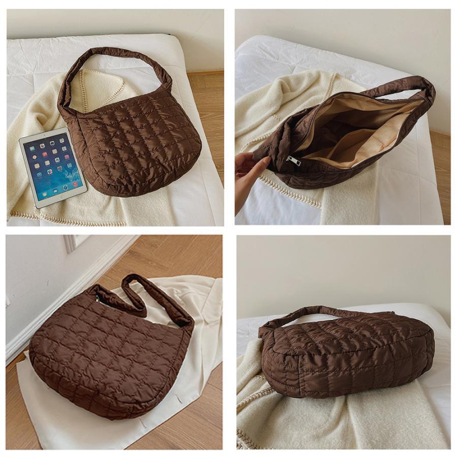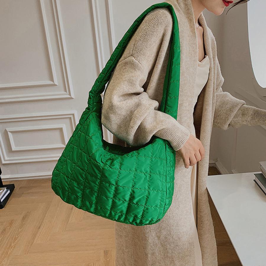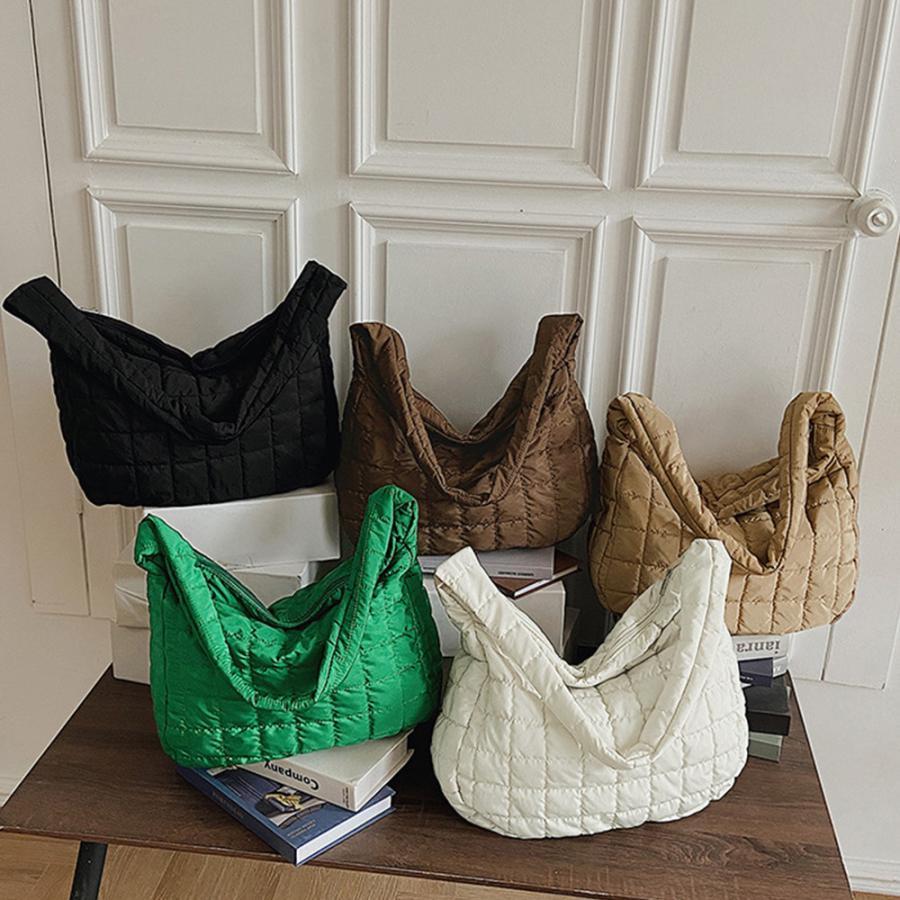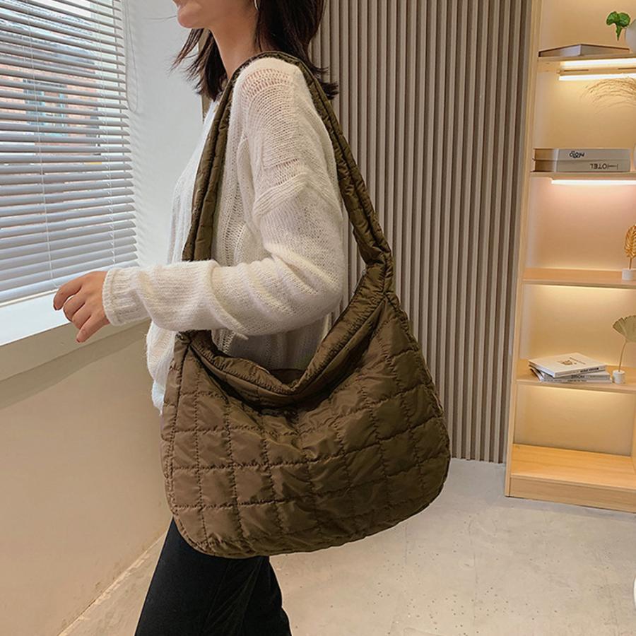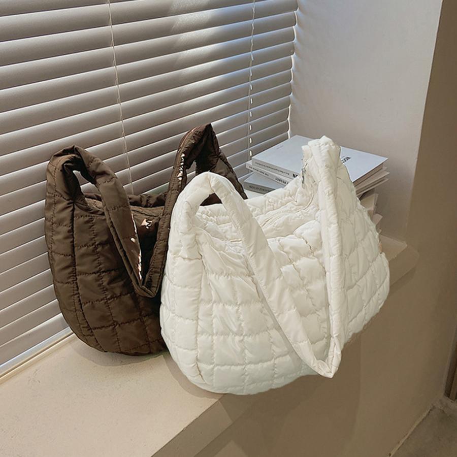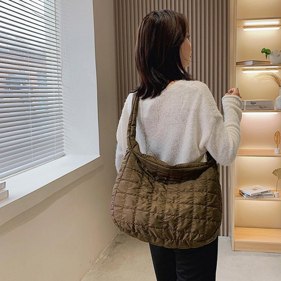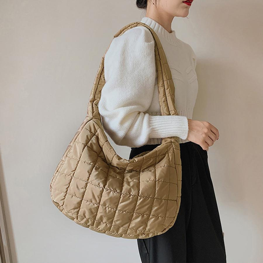 くったりと柔らかい綿入り、ナイロン素材を使用し、キルティング模様で落ち着いた雰囲気のショルダーバッグ