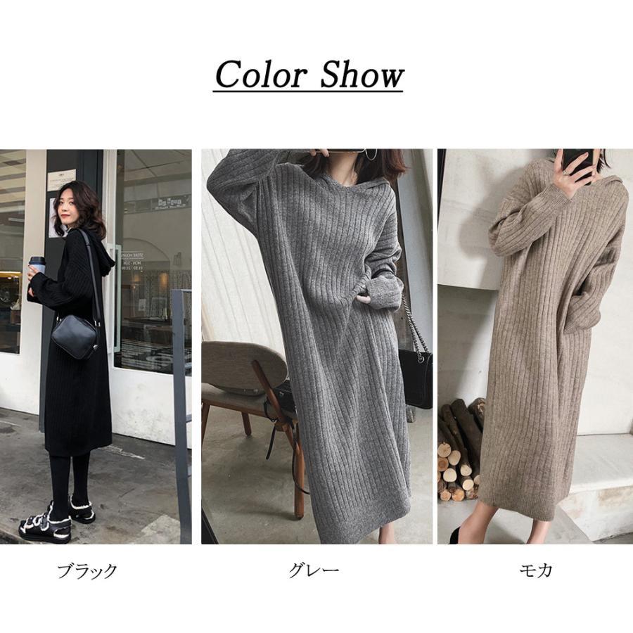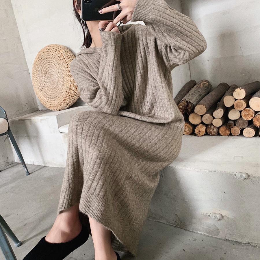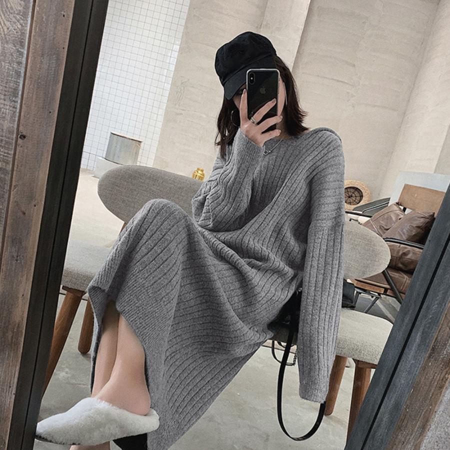 レディース リブニットワンピー きれいめ 長袖 無地 ロングワンピース カジュアル フェミニン 暖かいセーターワンピ 黒