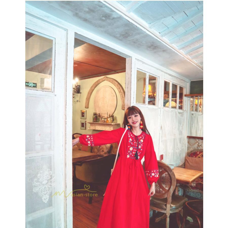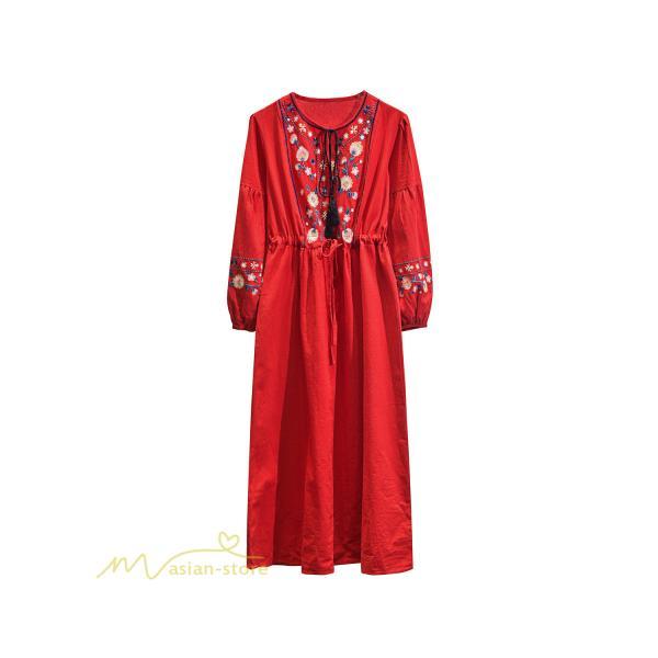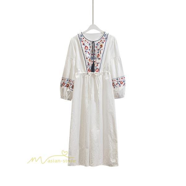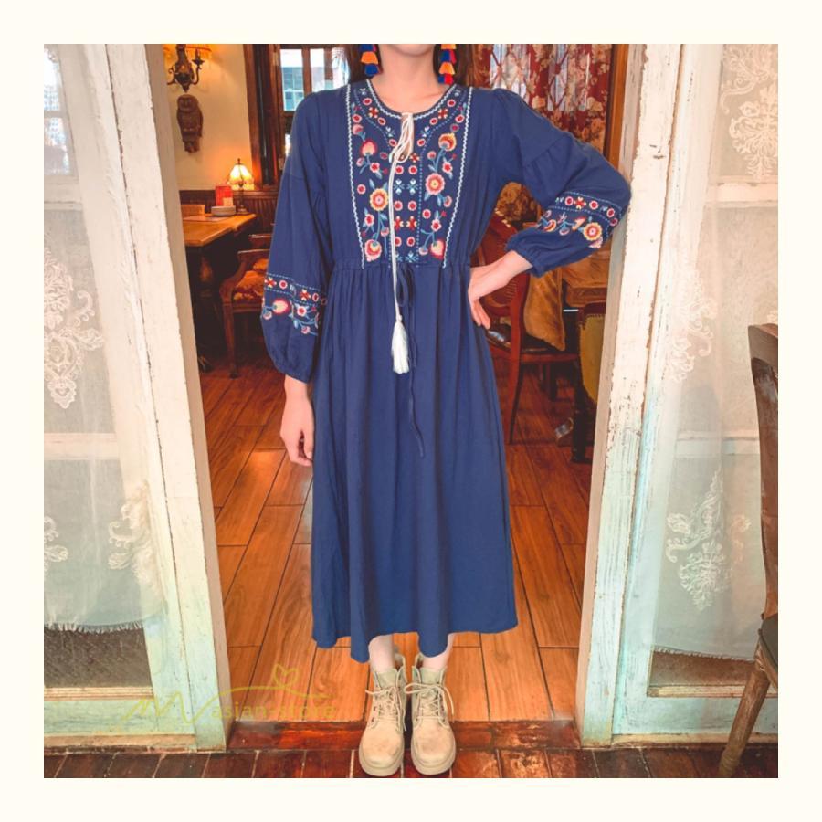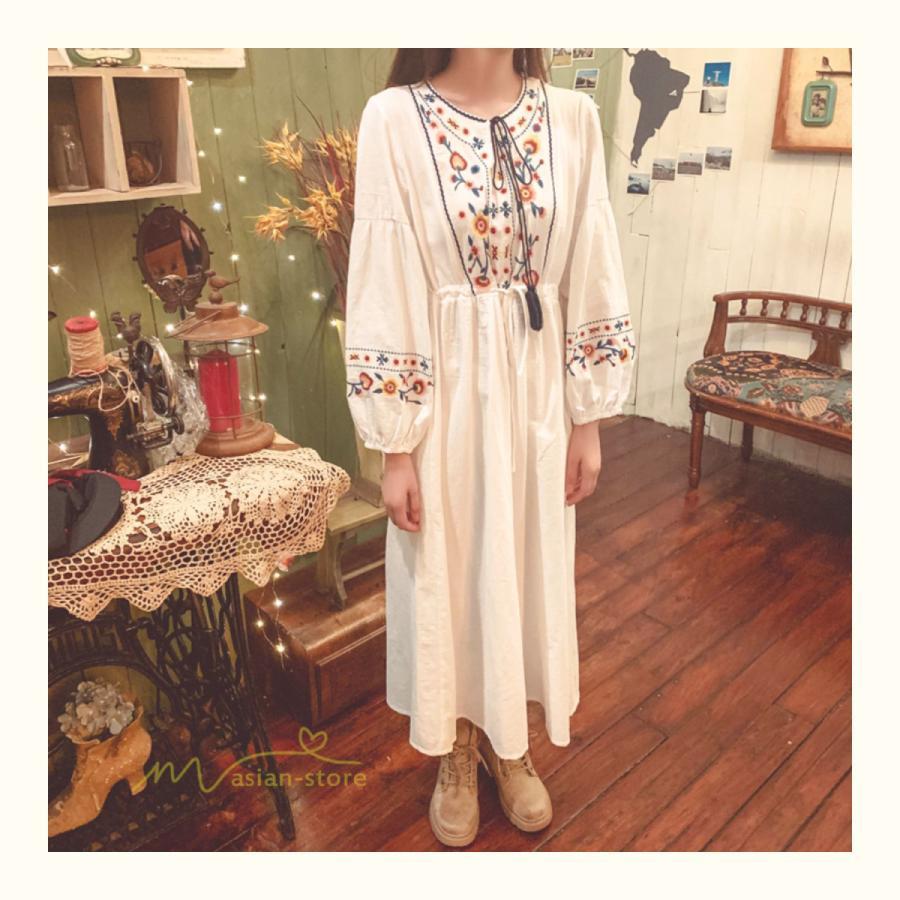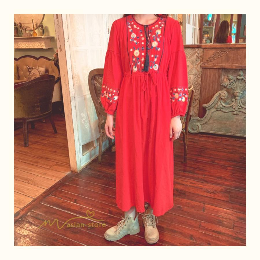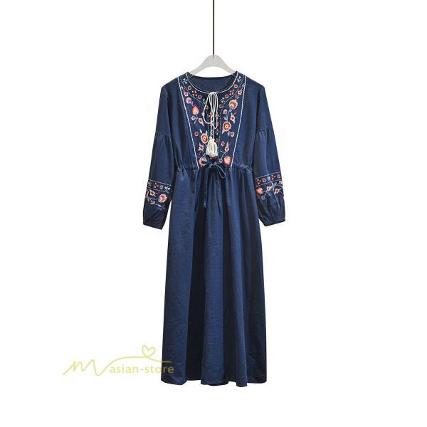 レディース 秋ワンピース 長袖 ドレス マキシ丈ワンピース 結婚式 夏服 刺繍 レトロ風 ヴィンテージ風