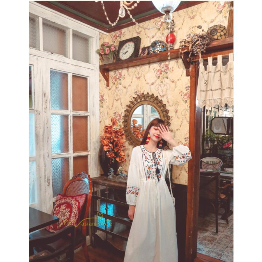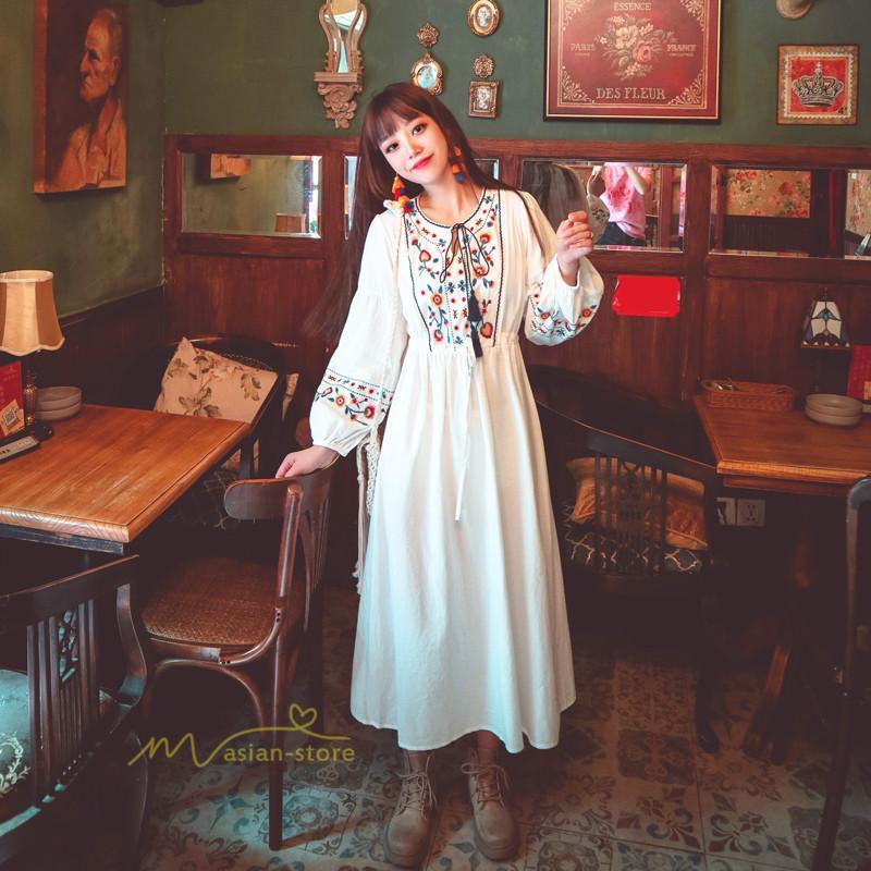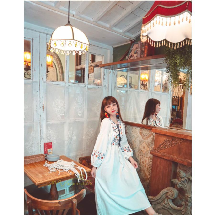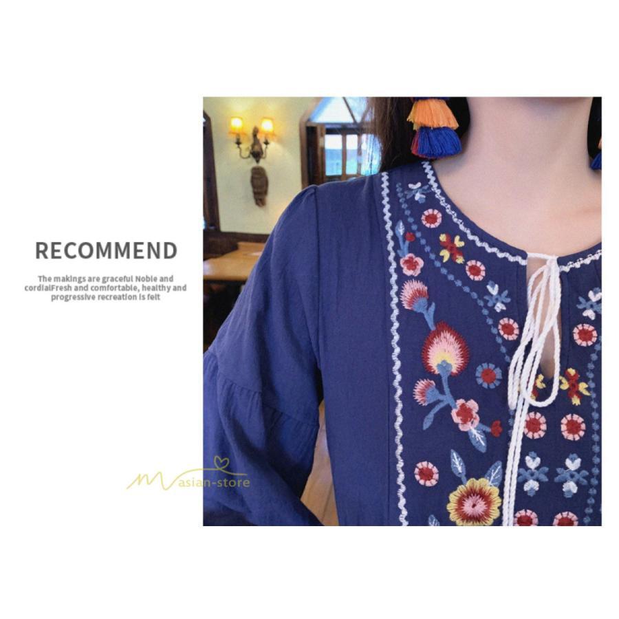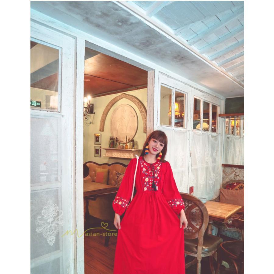 レディース 秋ワンピース 長袖 ドレス マキシ丈ワンピース 結婚式 夏服 刺繍 レトロ風 ヴィンテージ風