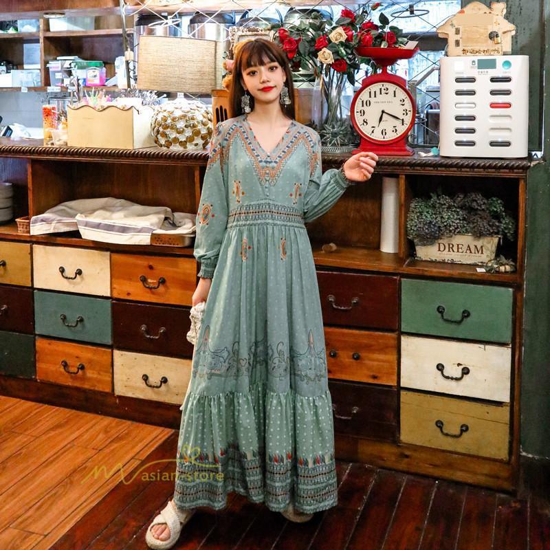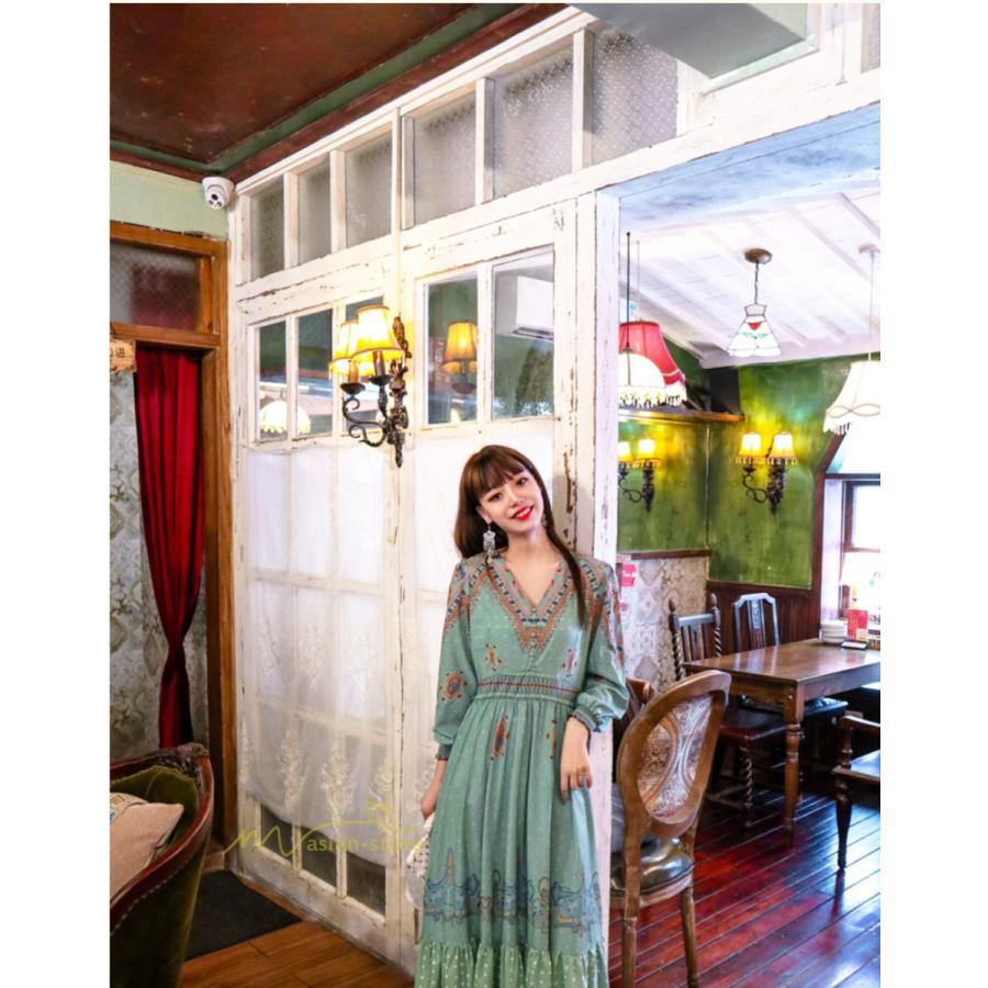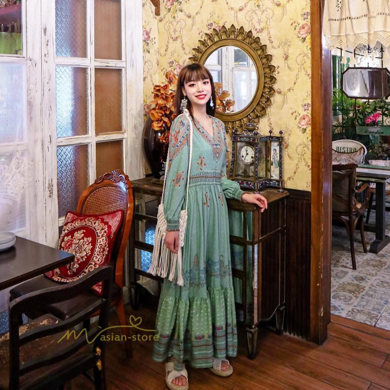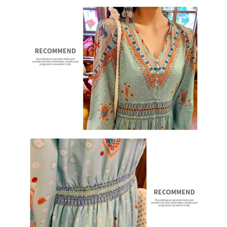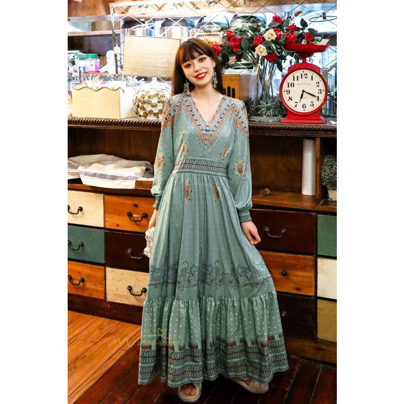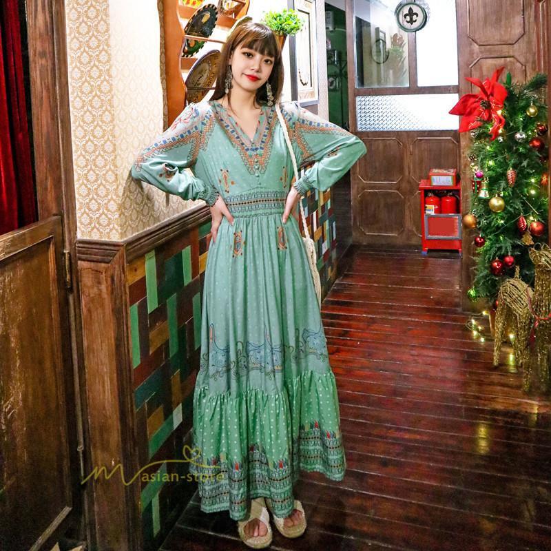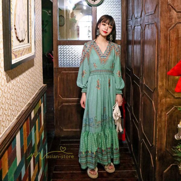 レディース 秋ワンピース 長袖 ドレス マキシ丈ワンピース 結婚式 夏服 レトロ風 ヴィンテージ風 Vネック プリント ウエストマーク